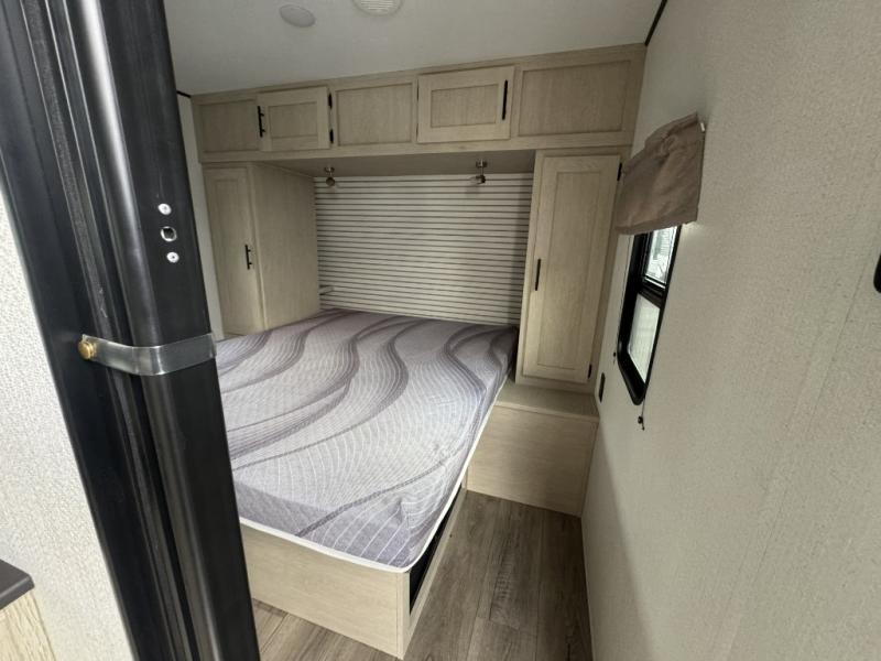 The little ones or your guests will love the bunkhouse in this spacious trailer. There area a set of 26" x 74" bunks, along with a flip-up bunk above a sofa they can sleep and relax. You'll find your own space in the front bedroom that includes a walk-around queen bed and dual wardrobes. Everyone can meet in the middle living area and kitchen to dine around the booth dinette or relax on the sofa. The chef will be able to create delicious meals each day on the three burner cooktop, and there is a residential style refrigerator for perishables. And the mid-coach full bath is sure to come in handy after a day of swimming or hiking!