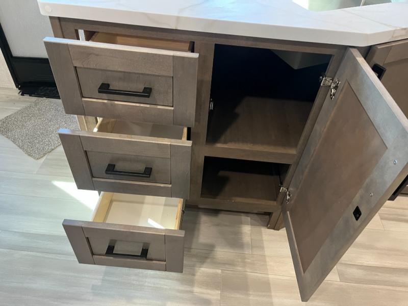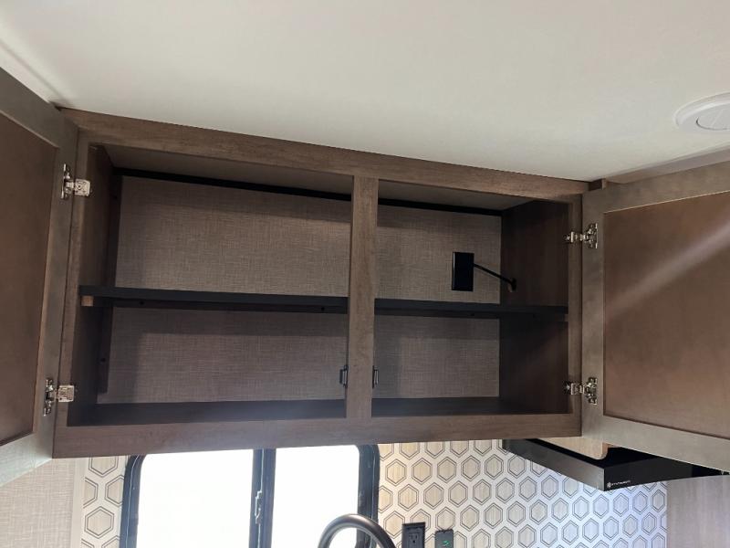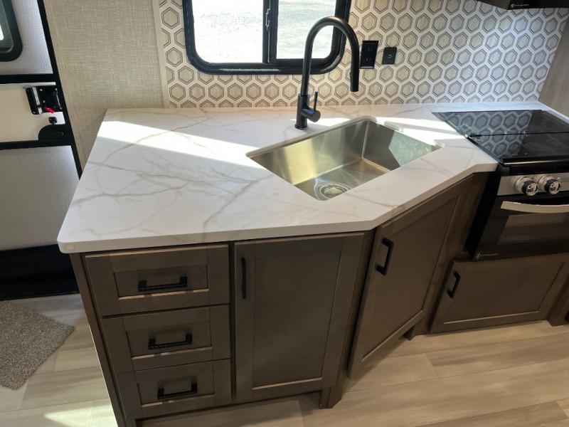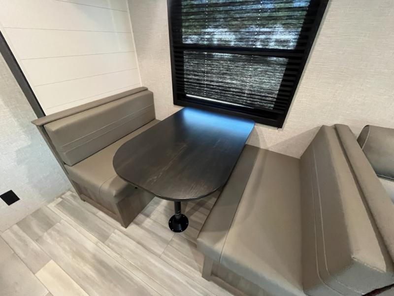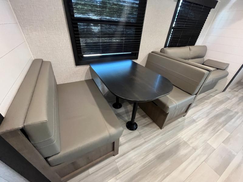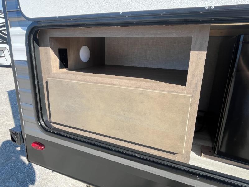Enjoy camping at local RV spots or even national parks in this dual axle trailer that offers a large slide with a jackknife sofa and booth dinette for more sleeping space and interior room to relax. There is a full bathroom to get cleaned up in with extra counter space for toiletries, and the kitchen provides a three burner range with glass cover, a 17" oven and a pantry to hold all the goodies. You can enter the front bedroom from each side of the entertainment center giving you your own side, and there are dual wardrobes plus a shelf overhead. And don't forget about the 16' power awning with LED lighting, the exterior storage for your outdoor gear and the outside kitchen. You might even like to add a few options, take a look at the list!