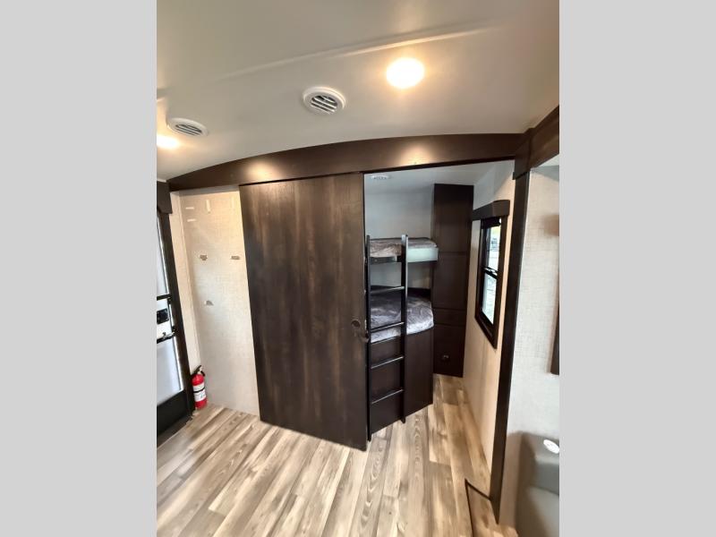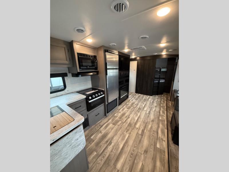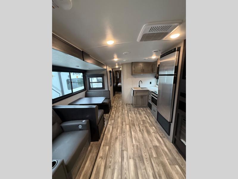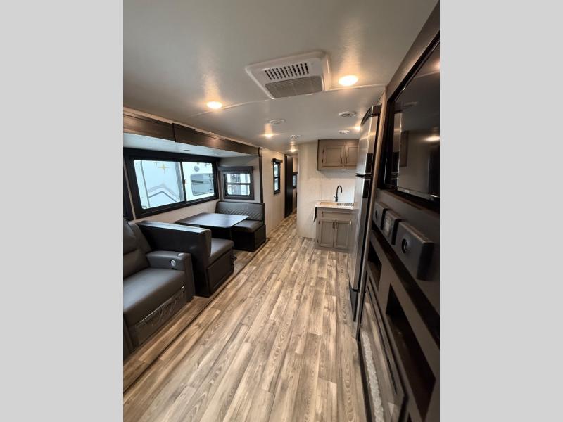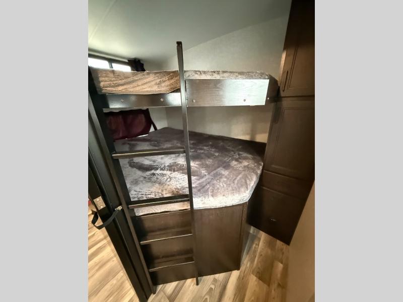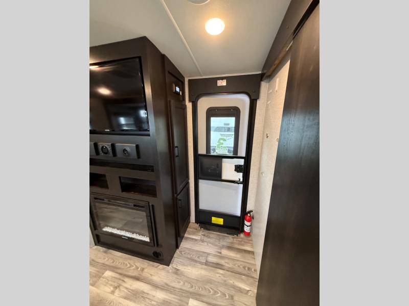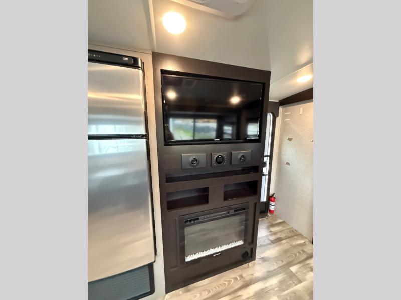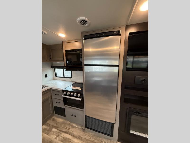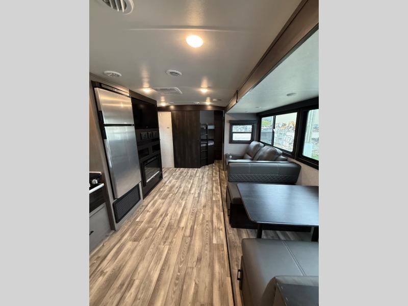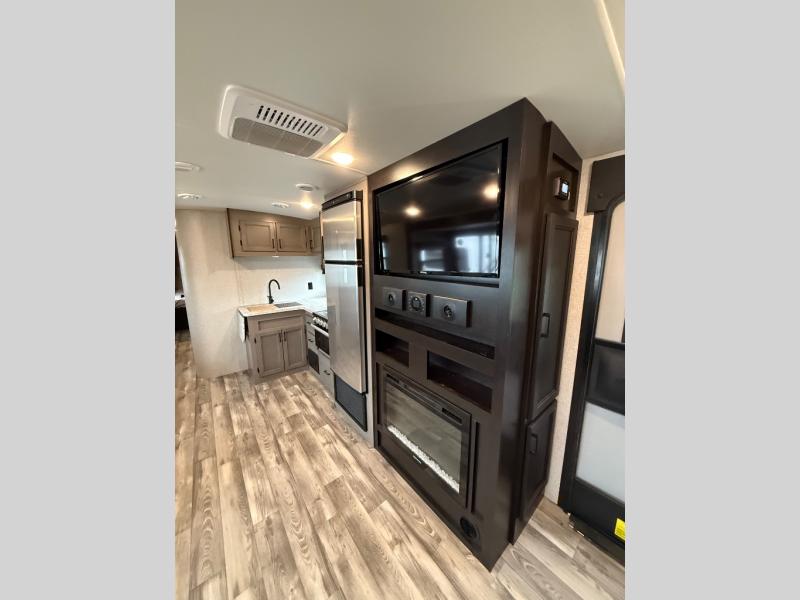 This travel trailer will have you feeling right at home! The rear private bunkhouse has plenty of space for the kiddos to move around, as well as a set of double-size bunks with a ladder and two wardrobes. There is also a slide with a flip-up bunk above a jackknife sofa for even more sleeping space. Everyone can gather together and either relax on the theater seating across from the entertainment center with a fireplace and Smart HDTV or play a game at the booth dinette. The kitchen island makes meal prepping easier and you can store your dishes in the hutch. You could even cook your meals while breathing in some fresh air with the outside kitchen which also has a refrigerator to keep your beverages cold. There's a full bathroom to stay clean and a closet in the front private bedroom with washer and dryer prep for the option to add these appliances.