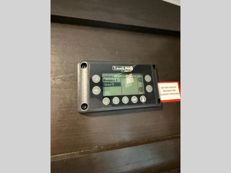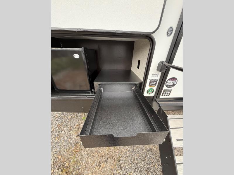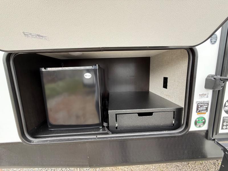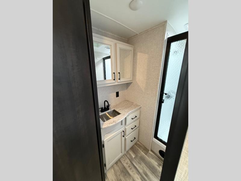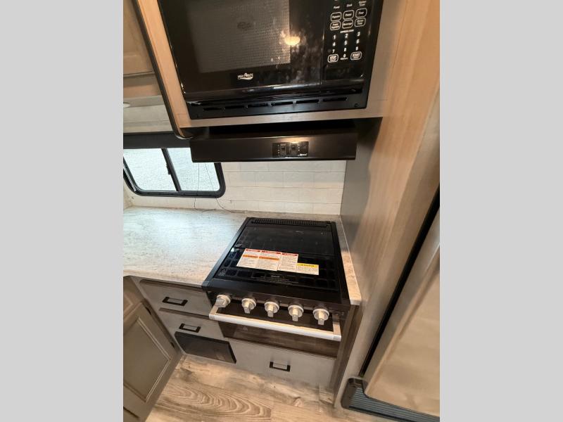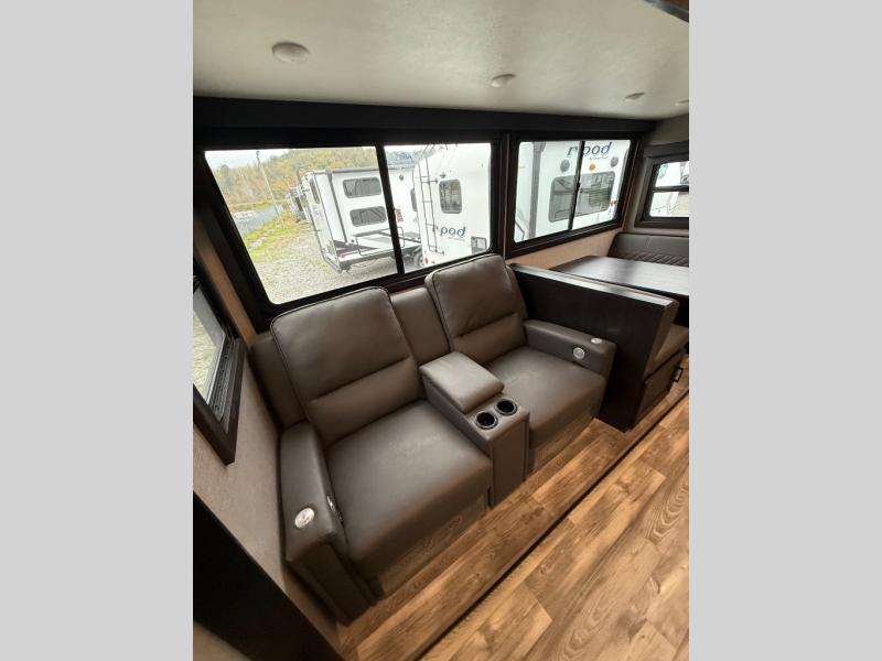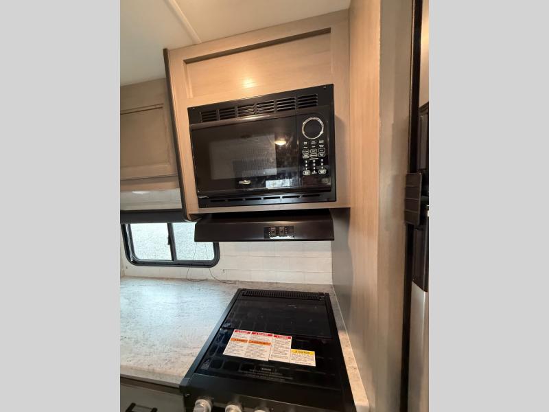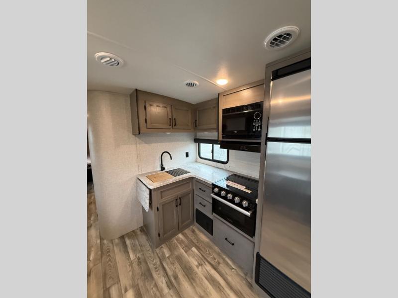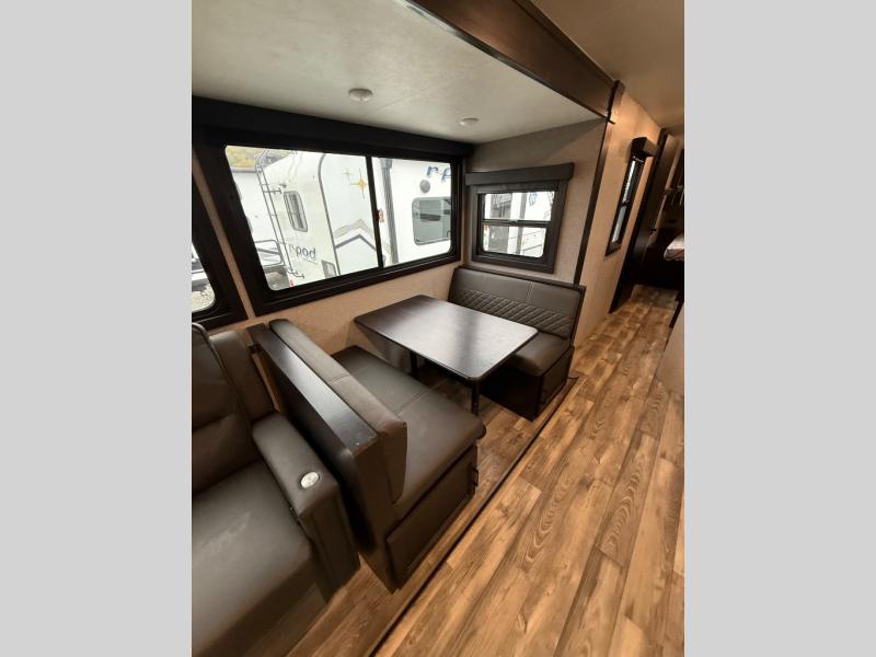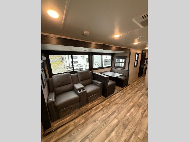 This travel trailer will have you feeling right at home! The rear private bunkhouse has plenty of space for the kiddos to move around, as well as a set of double-size bunks with a ladder and two wardrobes. There is also a slide with a flip-up bunk above a jackknife sofa for even more sleeping space. Everyone can gather together and either relax on the theater seating across from the entertainment center with a fireplace and Smart HDTV or play a game at the booth dinette. The kitchen island makes meal prepping easier and you can store your dishes in the hutch. You could even cook your meals while breathing in some fresh air with the outside kitchen which also has a refrigerator to keep your beverages cold. There's a full bathroom to stay clean and a closet in the front private bedroom with washer and dryer prep for the option to add these appliances.