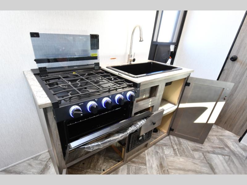 Kitchen with two-burner stove, double sink, and 4.3 cu. ft. 12V refrigerator