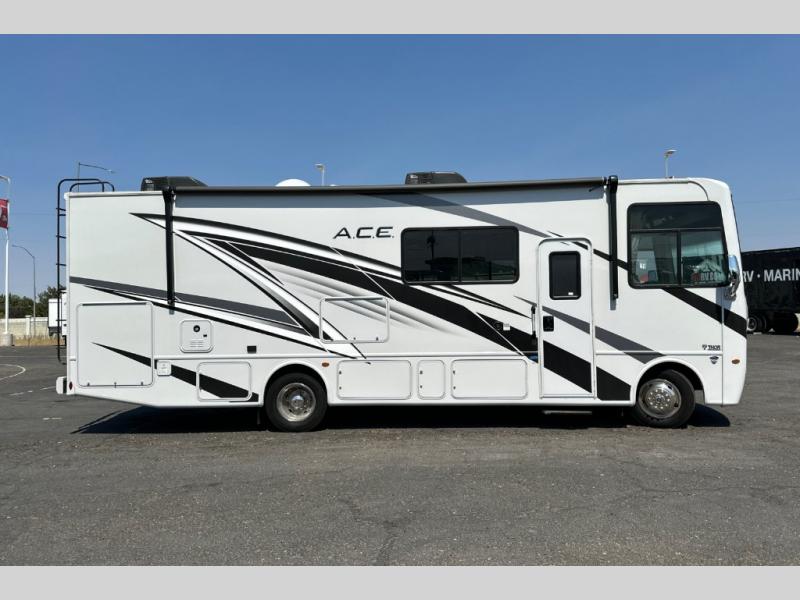 The A.C.E Class A gas motorhome is constructed with a welded tubular steel floor, vacu-bond laminated roof, walls and floor with block foam insulation, and a premium one-piece exterior roof for a coach made to last. You will love the pet-friendly features, like the Bird's Eye window, the Pet-Link multi-purpose tie-down and the Pull-Out Kibble Station with an FDS approved pet bowl liner. Each model includes an Onan RV QG 4,000 gas generator, a Winegard ConnecT Wi-Fi extender +4G, and are pre-wired for solar charging. Some of the other convenient amenities you will find on the A.C.E are framed windows, a basement pass-through storage, and an exterior LP connection. Head inside to find residential vinyl flooring, pressed laminate countertops, glass tile backsplash in the kitchen, and a wireless phone charger!