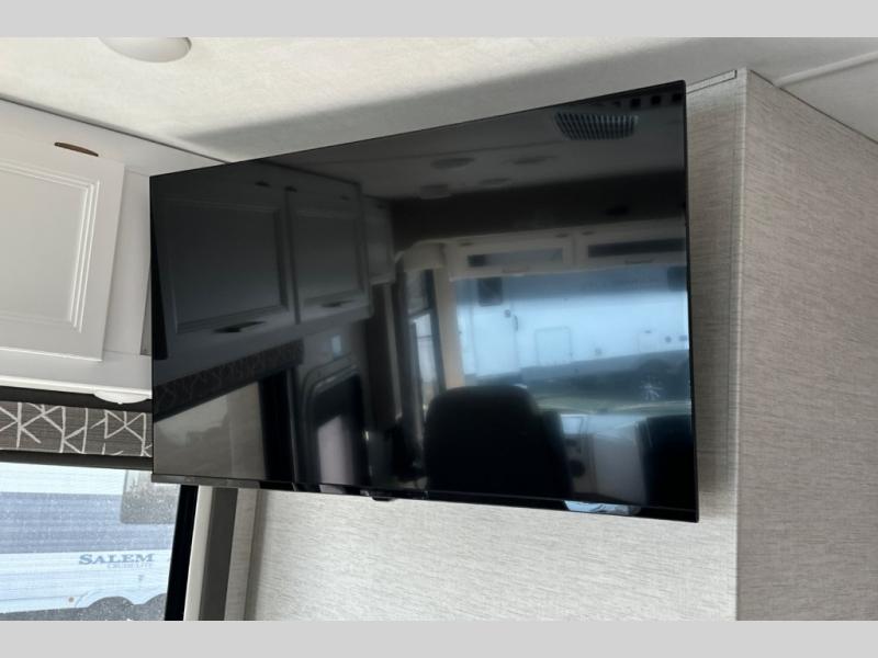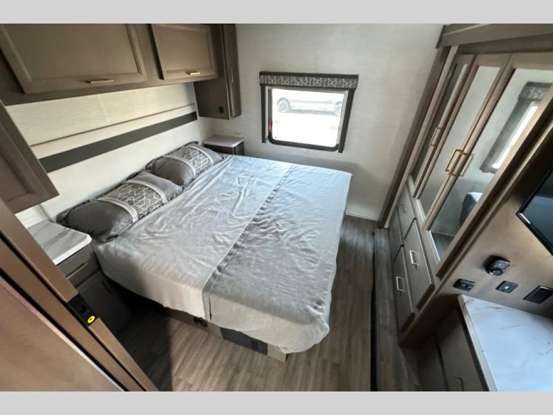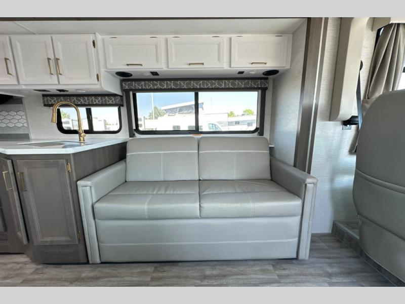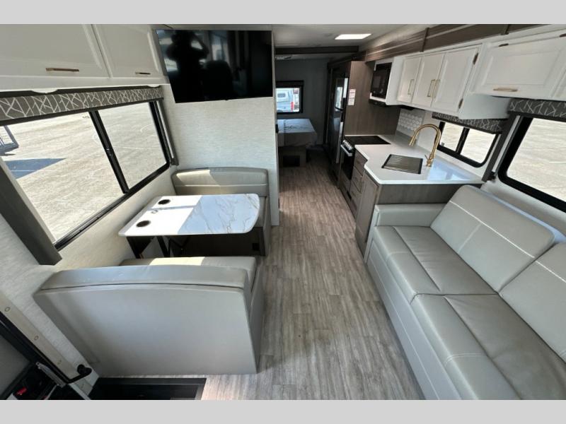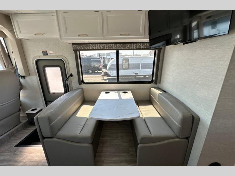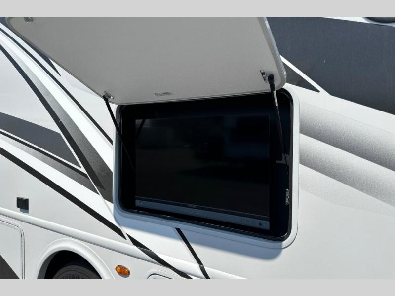 You will love how much space you have in this motorhome thanks to the full-wall slide! There is a jack-knife sofa and a Dream Dinette, or you can choose the optional theater seats in place of the sofa if you don't need the additional sleeping space. The chef of your group can prepare meals indoors on the three burner gas cooktop or in the microwave oven, plus there is an exterior kitchen with a refrigerator, a sink, and a 1000-watt inverter! The full bath will allow you to freshen up each day, and you'll feel right at home in the rear private bedroom with a king bed, a closet, plus a 32" TV!