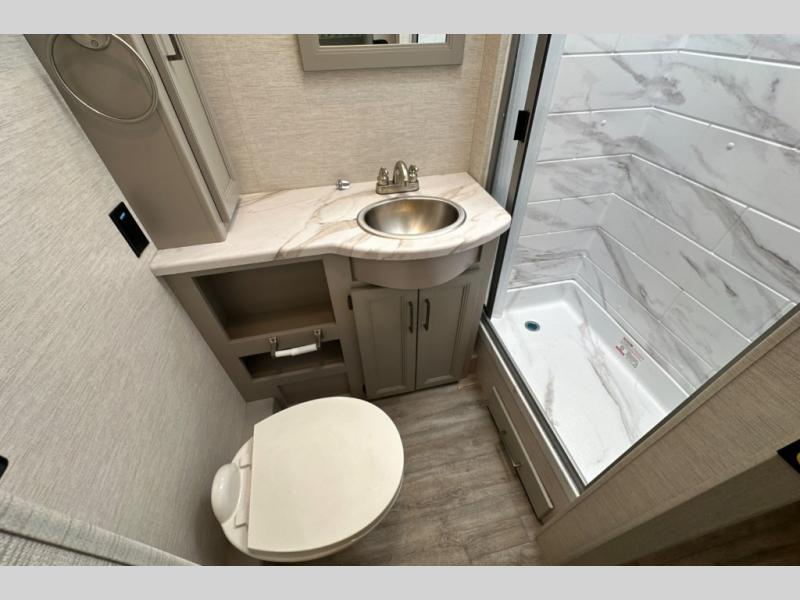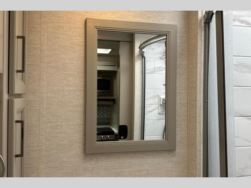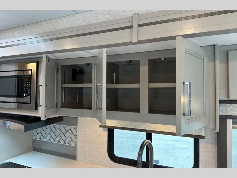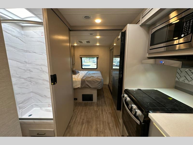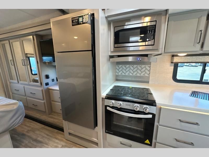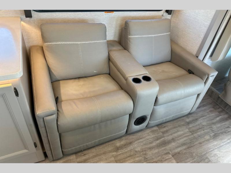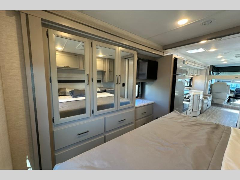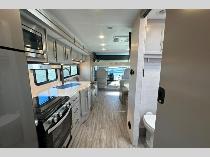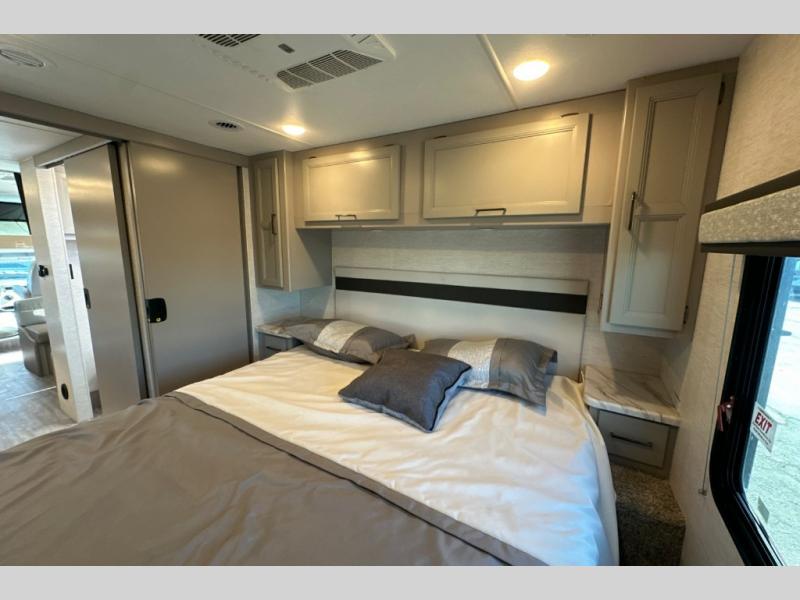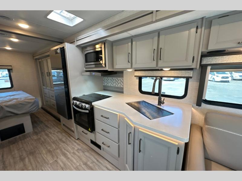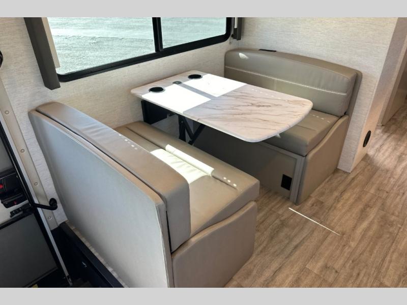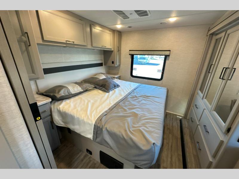 You will love how much space you have in this motorhome thanks to the full-wall slide! There is a jack-knife sofa and a Dream Dinette, or you can choose the optional theater seats in place of the sofa if you don't need the additional sleeping space. The chef of your group can prepare meals indoors on the three burner gas cooktop or in the microwave oven, plus there is an exterior kitchen with a refrigerator, a sink, and a 1000-watt inverter! The full bath will allow you to freshen up each day, and you'll feel right at home in the rear private bedroom with a king bed, a closet, plus a 32" TV!