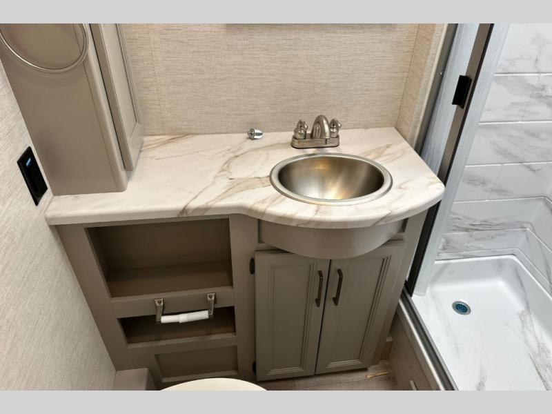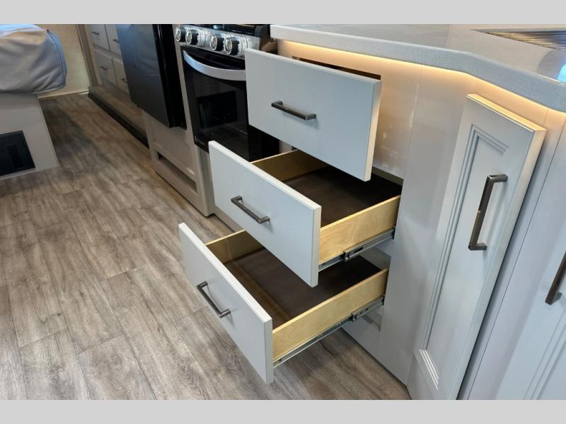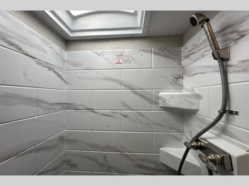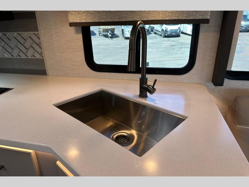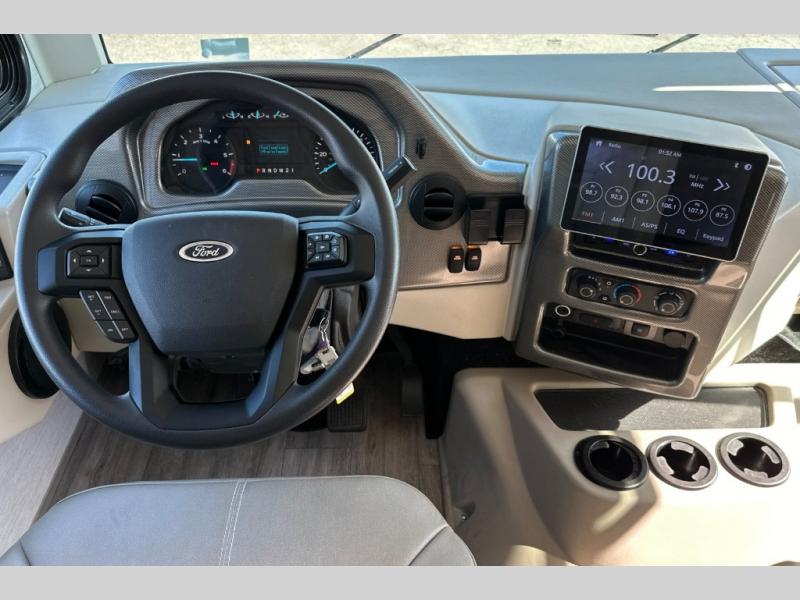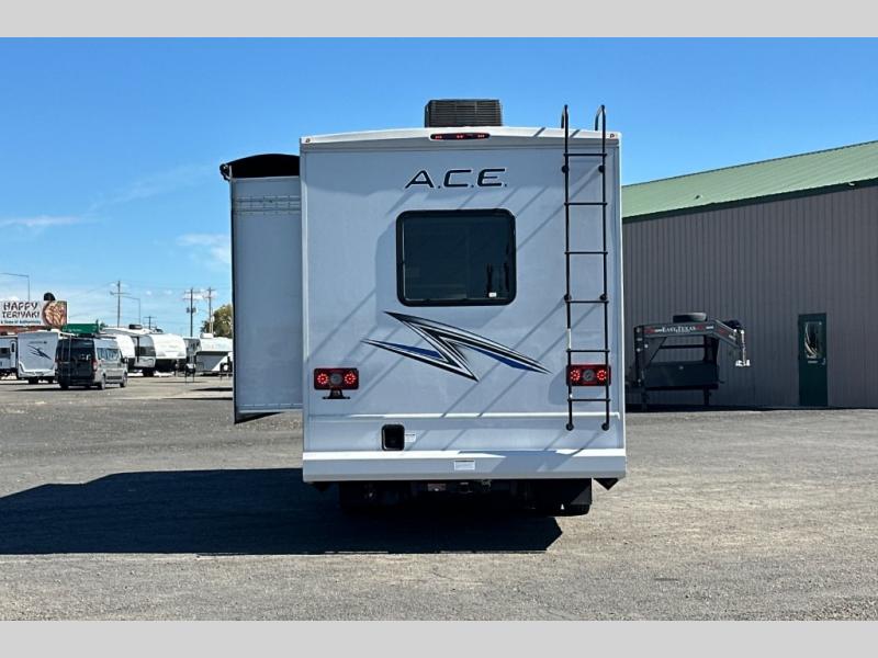 The A.C.E Class A gas motorhome is constructed with a welded tubular steel floor, vacu-bond laminated roof, walls and floor with block foam insulation, and a premium one-piece exterior roof for a coach made to last. You will love the pet-friendly features, like the Bird's Eye window, the Pet-Link multi-purpose tie-down and the Pull-Out Kibble Station with an FDS approved pet bowl liner. Each model includes an Onan RV QG 4,000 gas generator, a Winegard ConnecT Wi-Fi extender +4G, and are pre-wired for solar charging. Some of the other convenient amenities you will find on the A.C.E are framed windows, a basement pass-through storage, and an exterior LP connection. Head inside to find residential vinyl flooring, pressed laminate countertops, glass tile backsplash in the kitchen, and a wireless phone charger!