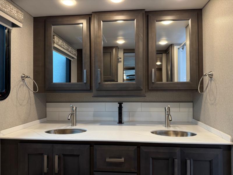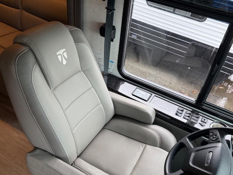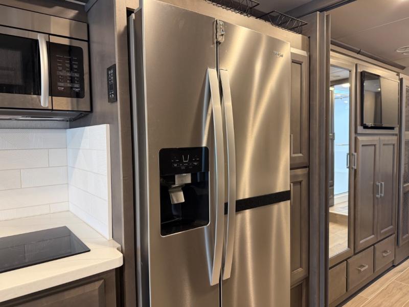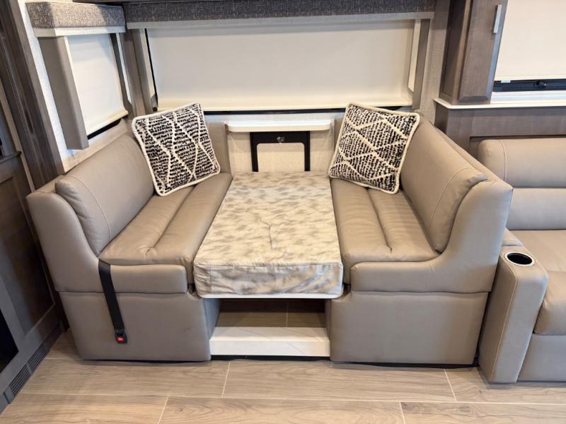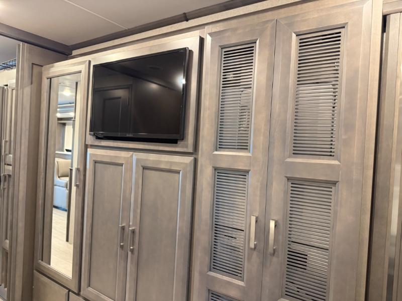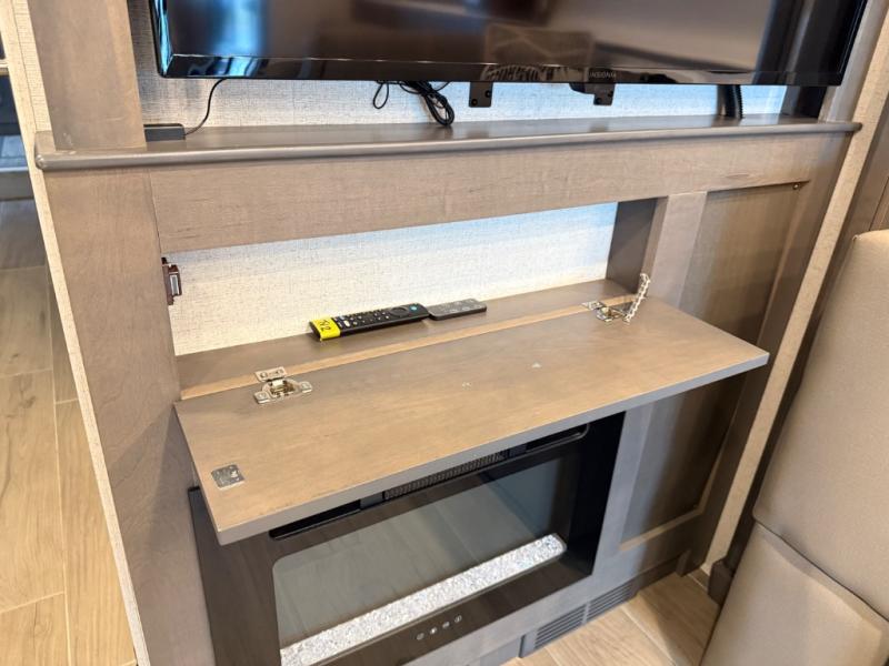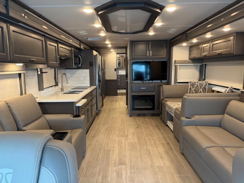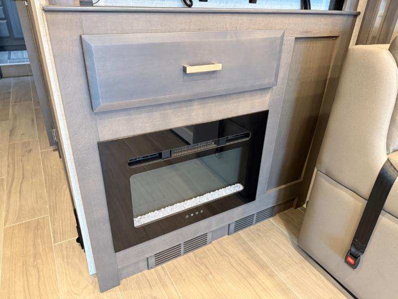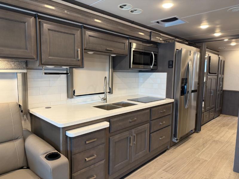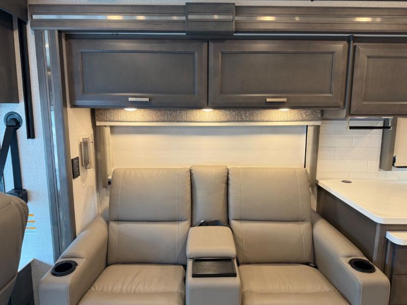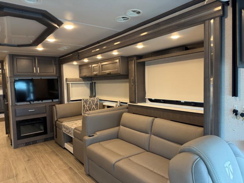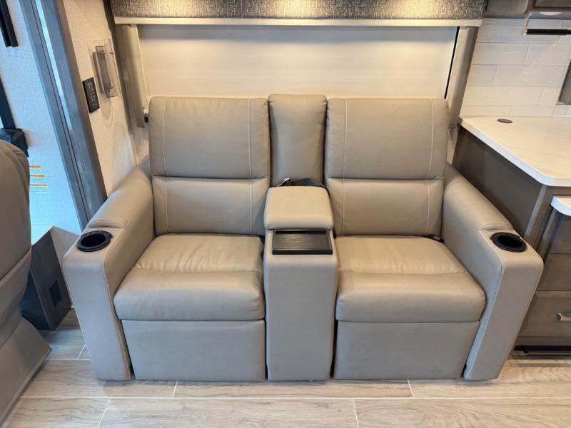 Convenience, comfort, and space can be found throughout this coach with a rear full bathroom with dual sinks and a mid-coach half bath, plus three slide outs, and captain's chairs that swivel. You can entertain your family and friends with all the seating and seatbelts that allow you to invite everyone. The Dream dinette, tri-fold sofa, and reclining theater seats are all great places to relax, unwind, and visit. Everyone will surely enjoy the fireplace and the two LED TVs in the living room. Cooking is made easy with a convection microwave oven and electric induction cooktop, plus there is a 21.4 double door residential refrigerator and a pantry for food storage. When you are ready to call it a night, the Tilt-A-View inclining king bed will be waiting in the walk-through bedroom that leads you to the full bathroom!