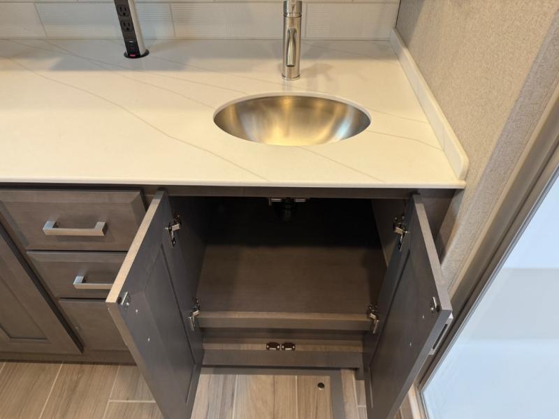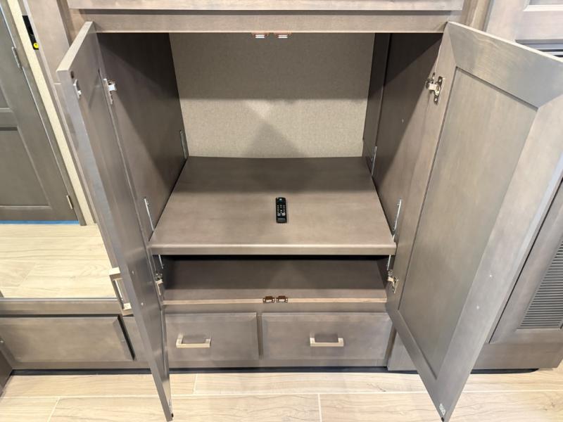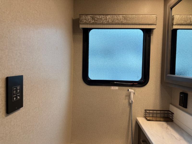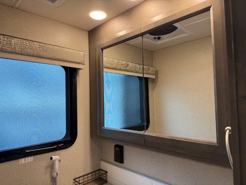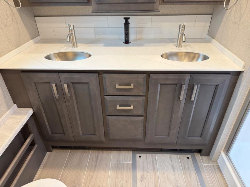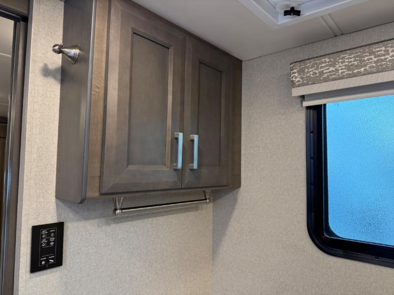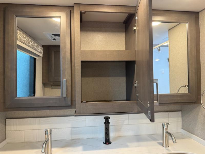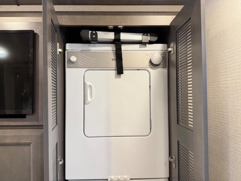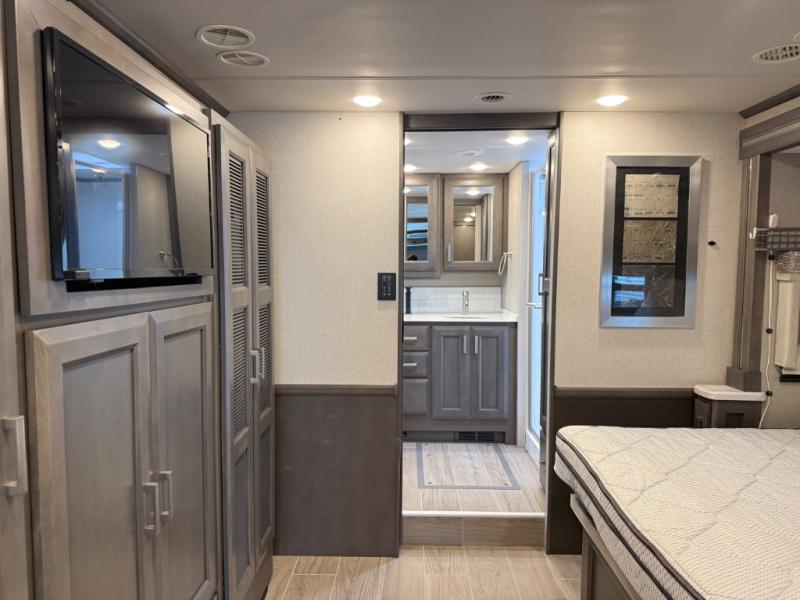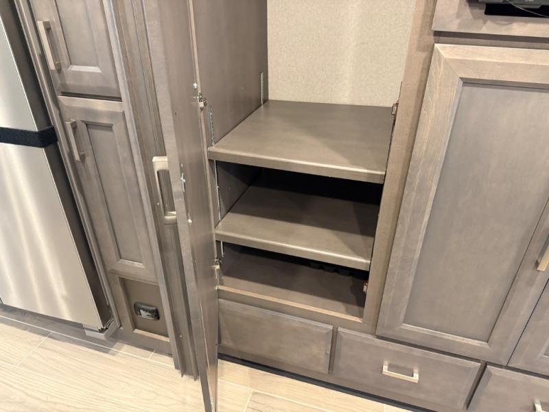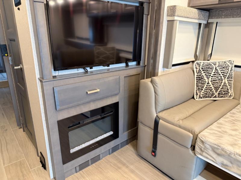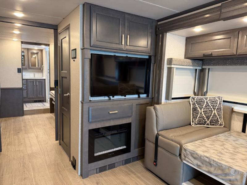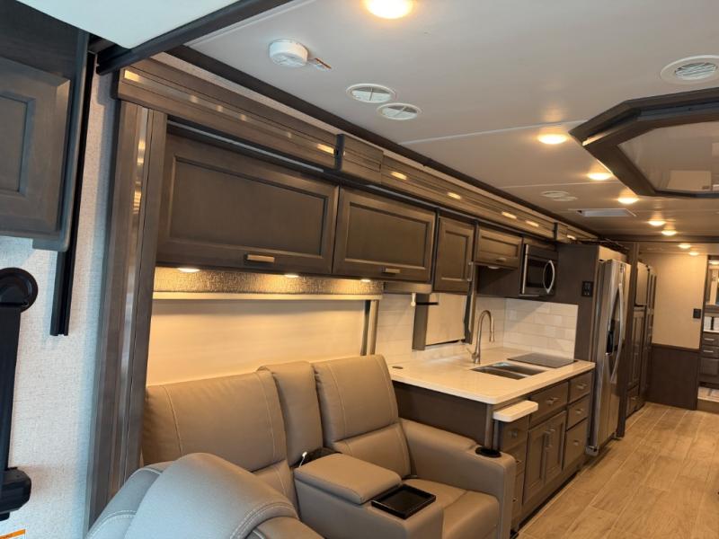 Convenience, comfort, and space can be found throughout this coach with a rear full bathroom with dual sinks and a mid-coach half bath, plus three slide outs, and captain's chairs that swivel. You can entertain your family and friends with all the seating and seatbelts that allow you to invite everyone. The Dream dinette, tri-fold sofa, and reclining theater seats are all great places to relax, unwind, and visit. Everyone will surely enjoy the fireplace and the two LED TVs in the living room. Cooking is made easy with a convection microwave oven and electric induction cooktop, plus there is a 21.4 double door residential refrigerator and a pantry for food storage. When you are ready to call it a night, the Tilt-A-View inclining king bed will be waiting in the walk-through bedroom that leads you to the full bathroom!