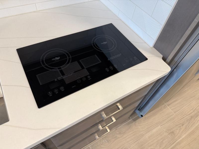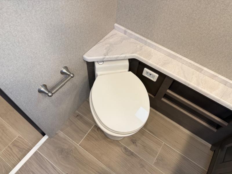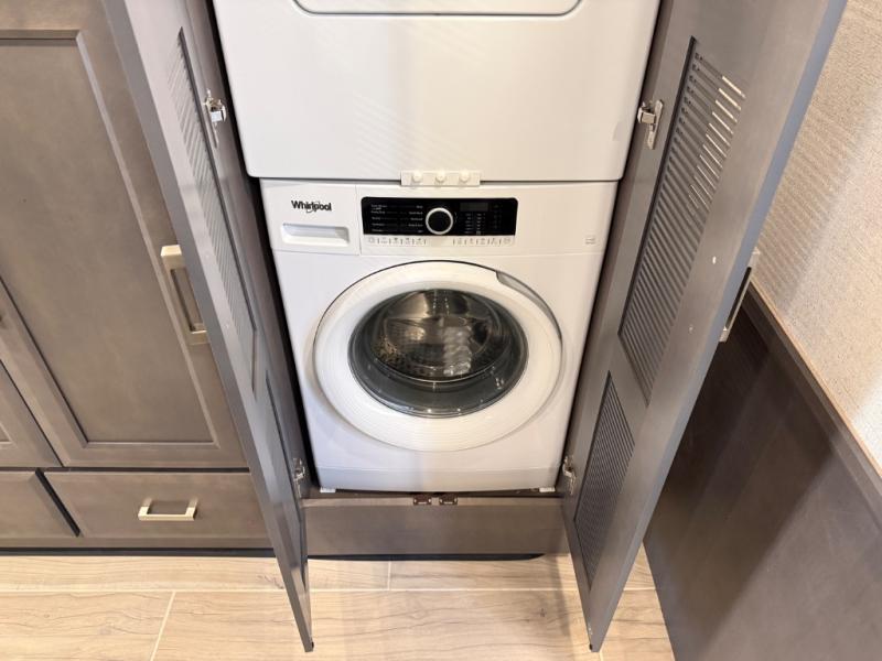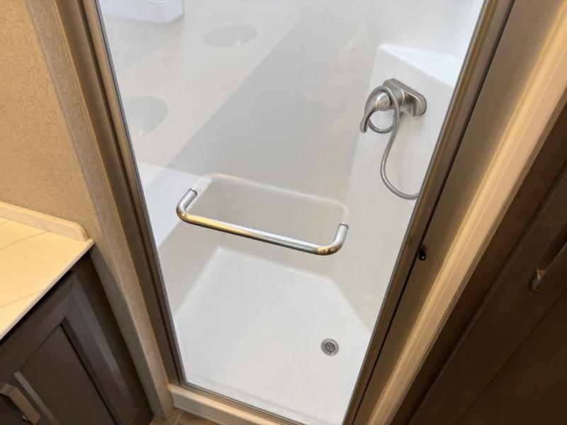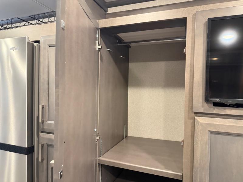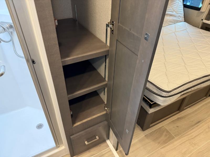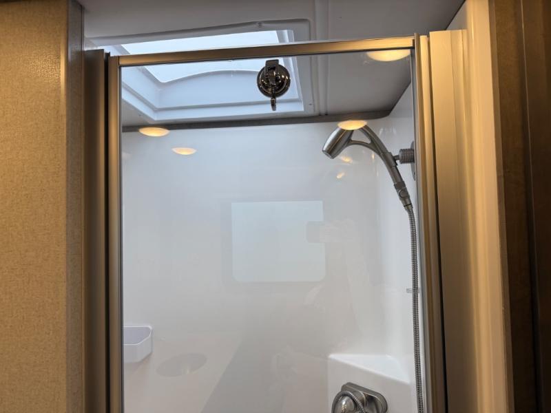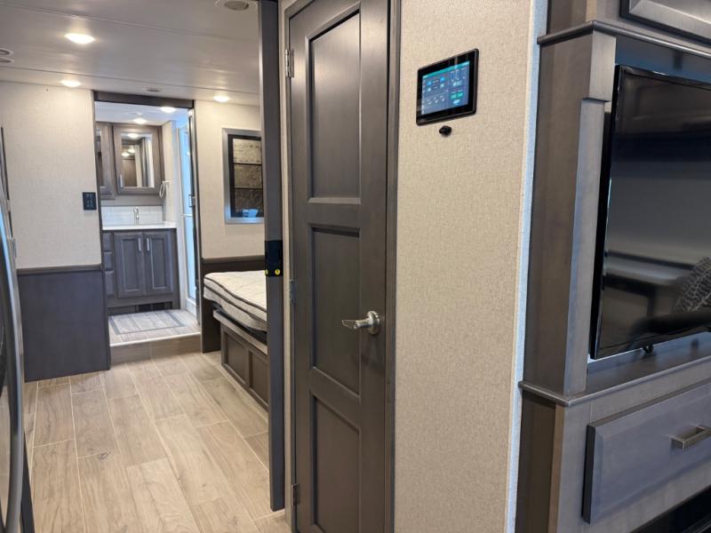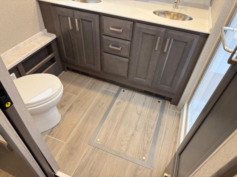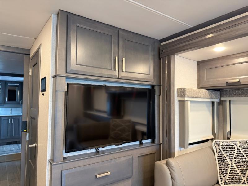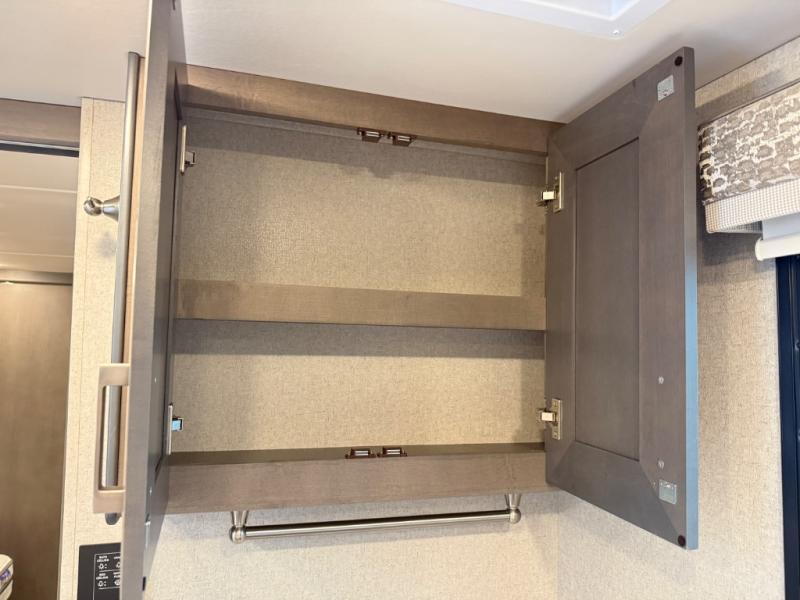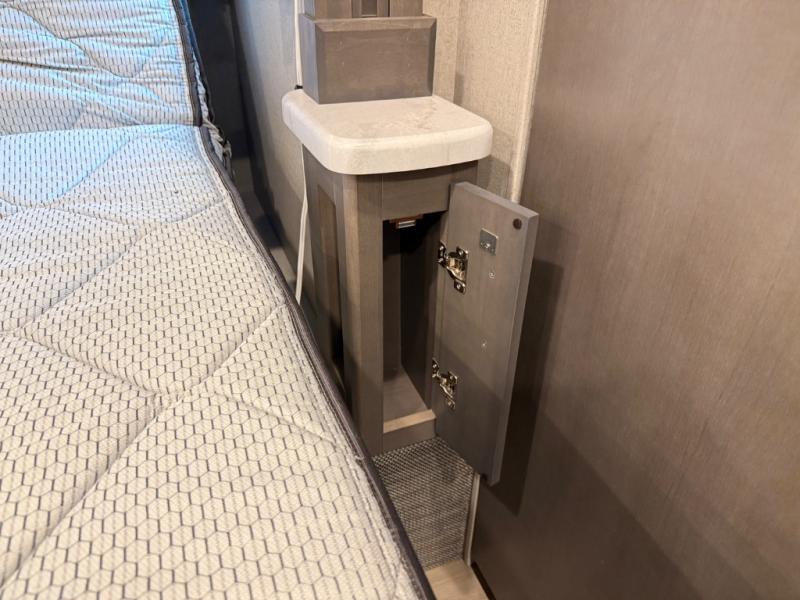 Convenience, comfort, and space can be found throughout this coach with a rear full bathroom with dual sinks and a mid-coach half bath, plus three slide outs, and captain's chairs that swivel. You can entertain your family and friends with all the seating and seatbelts that allow you to invite everyone. The Dream dinette, tri-fold sofa, and reclining theater seats are all great places to relax, unwind, and visit. Everyone will surely enjoy the fireplace and the two LED TVs in the living room. Cooking is made easy with a convection microwave oven and electric induction cooktop, plus there is a 21.4 double door residential refrigerator and a pantry for food storage. When you are ready to call it a night, the Tilt-A-View inclining king bed will be waiting in the walk-through bedroom that leads you to the full bathroom!