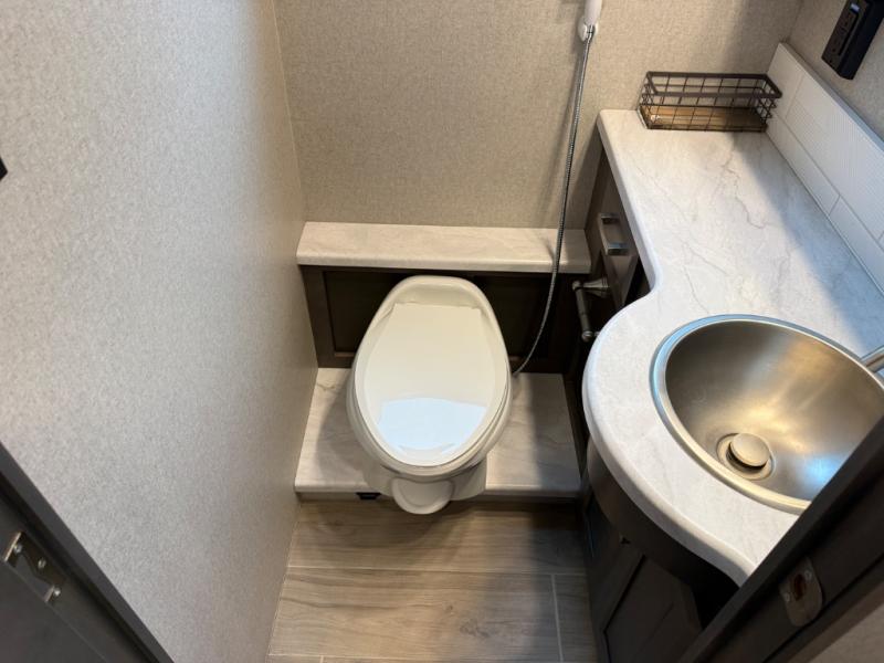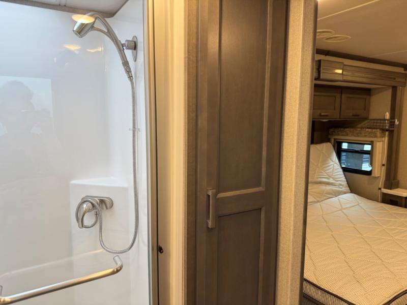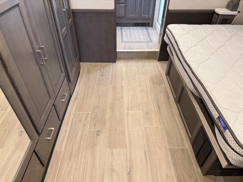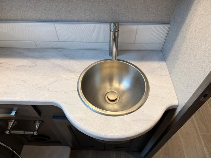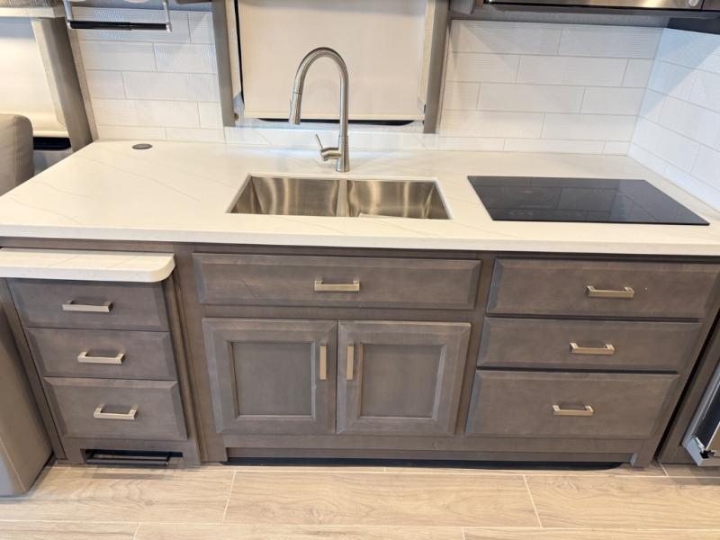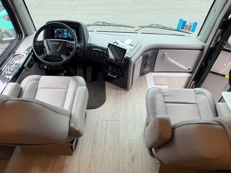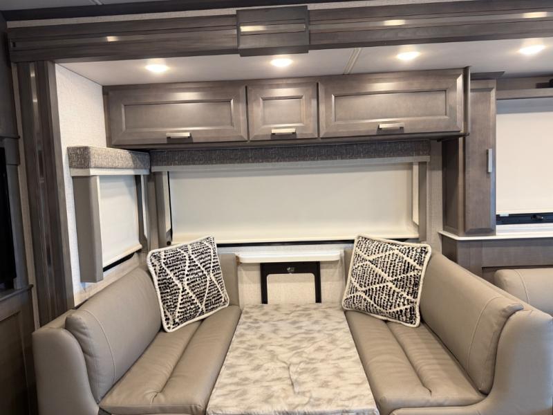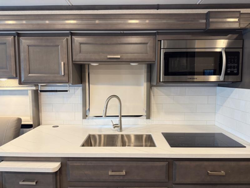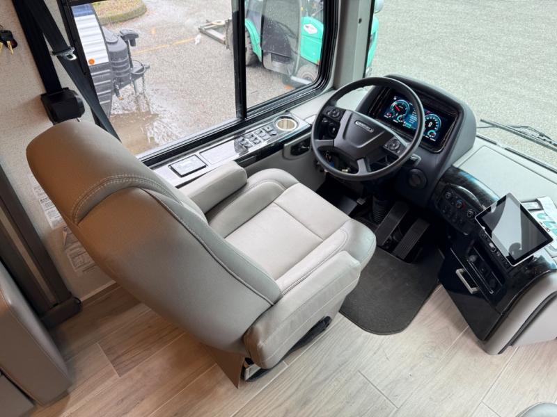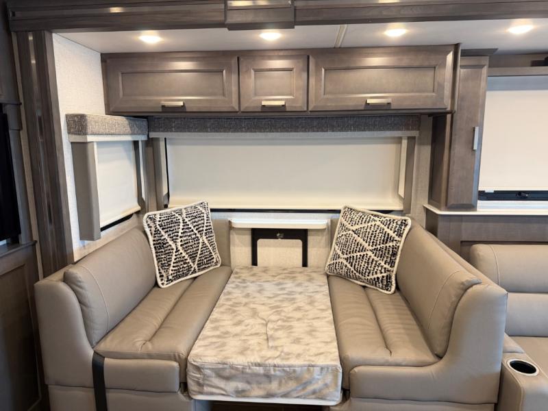With any Aria Class A diesel motorhome by Thor Motor Coach, experience RV living with all the luxurious amenities you are accustom to, command the roadways with improved handling from the VFS front axle with a 55-degree wheel cut, and enjoy a smooth ride thanks to the Air-Ride suspension and Sachs shock absorbers. The driver will also appreciate the 10.1" touchscreen dash radio with Bluetooth, and Sirius/XM prep when navigating the roads, and the comfort of the leatherette reclining/swivel adjustable captain's chairs. The bathroom provides an oversized full height shower with a glass door and a designer backsplash, while the kitchen provides solid surface countertops and a dinette. You'll also enjoy designer tile backsplash, a large double bowl stainless steel sink with a single handle faucet, a pull-down sprayer, plus full kitchen amenities. More standout features include the Wyndham cabinetry with rake style cabinet doors & nickel finish hardware, plus much much more depending on the Aria you take on the road!
