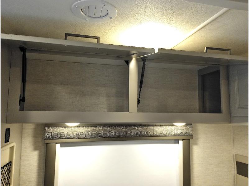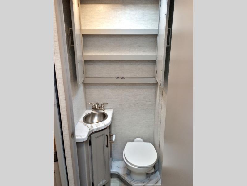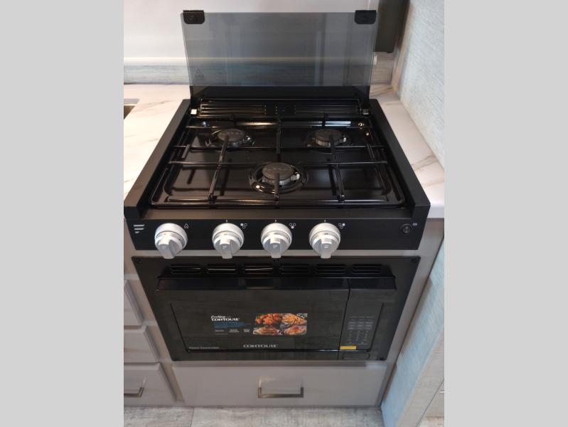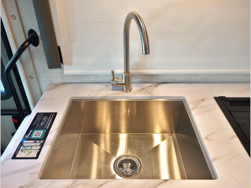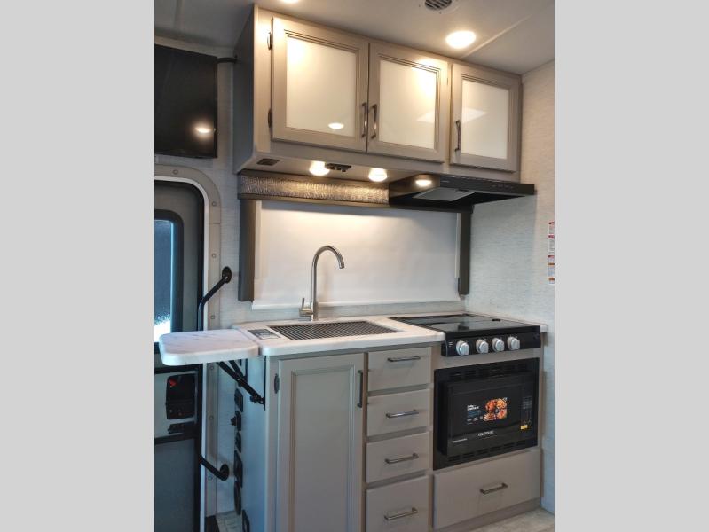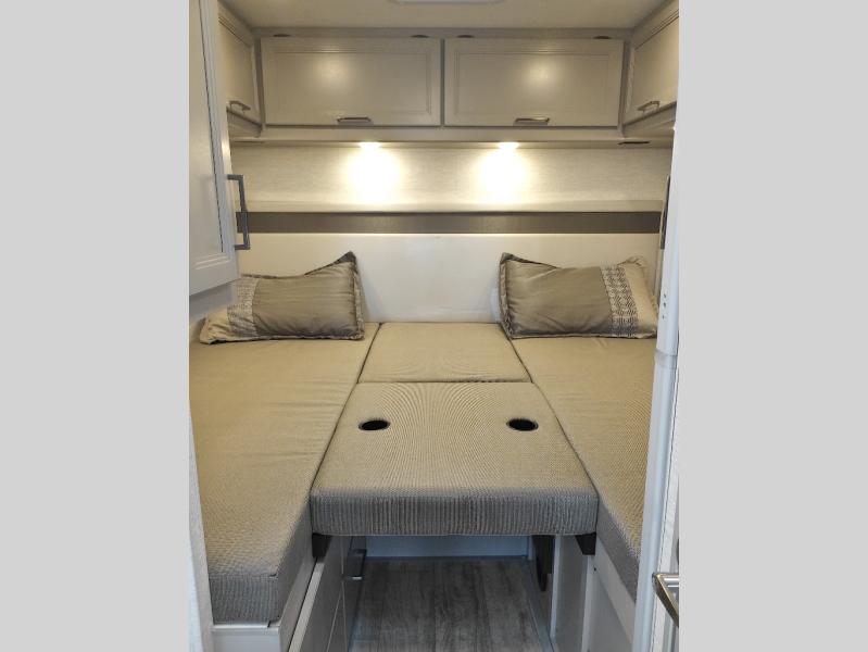 Travel comfortably in this Chateau Sprinter Class C motorhome featuring a versatile sleeping space. In the rear of the coach, you might enjoy two twin beds to travel with a friend, or convert the twin beds to a king when you travel with your spouse. Plus, you will have a 52" x 87" cab-over bunk that sleeps two adults or children as well. All will enjoy the full bath amenities that offer the entire width of the unit for showering and getting dressed and you can easily close off the toilet and vanity area for additional privacy during the day to allow access into the bedroom. There is also a skylight over the shower which adds additional headroom and natural lighting. A full kitchen including a three burner cook-top and microwave oven, plus ample counter space for food prep and a single bowl sink make it easy to provide meals while you travel.