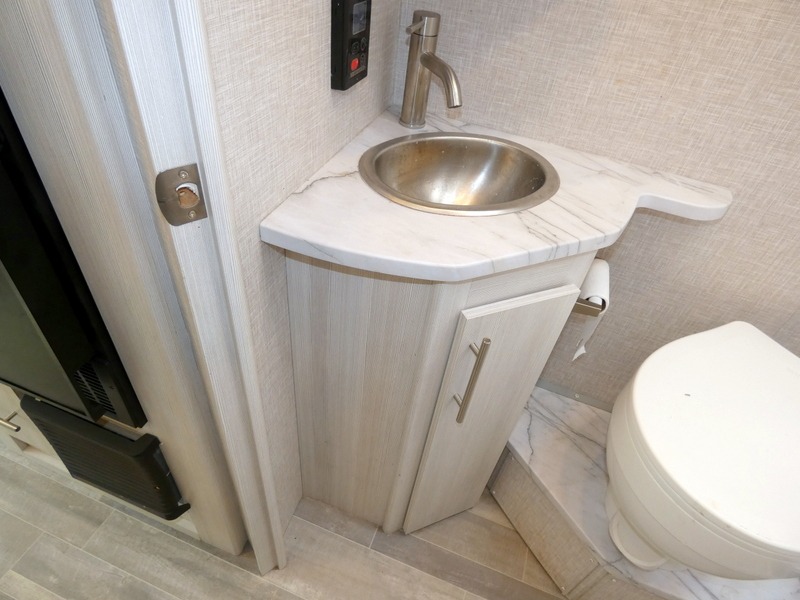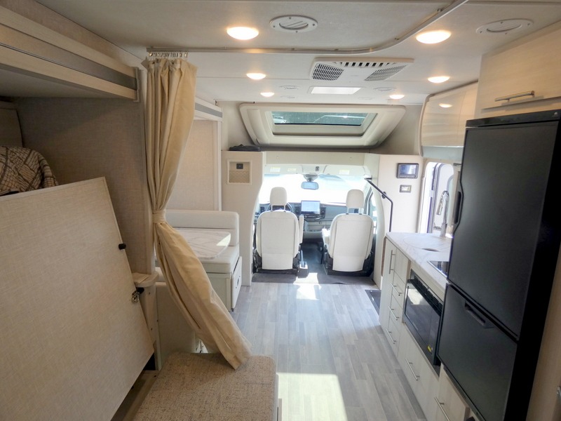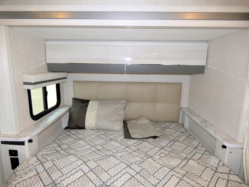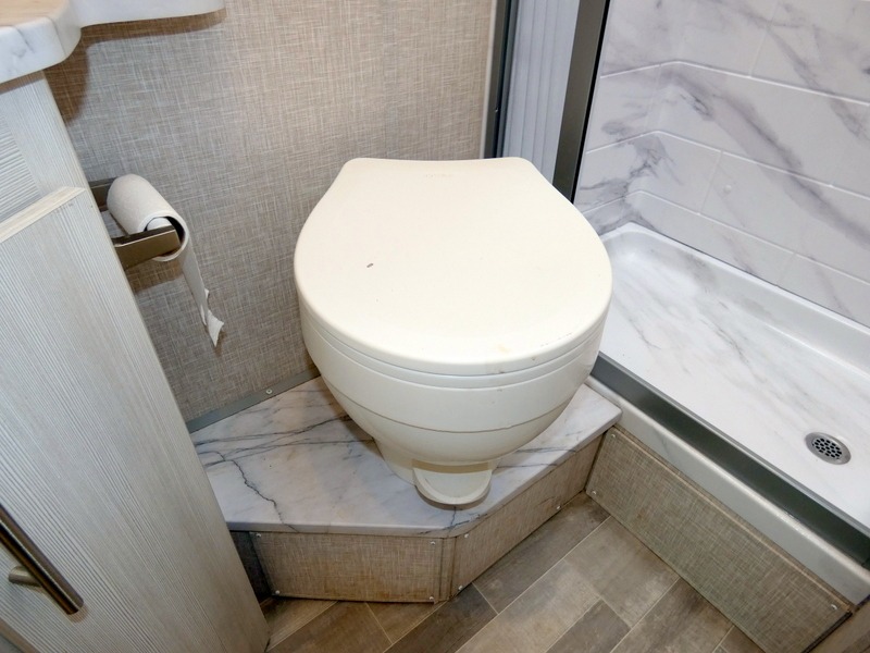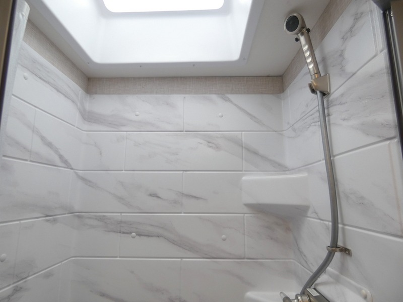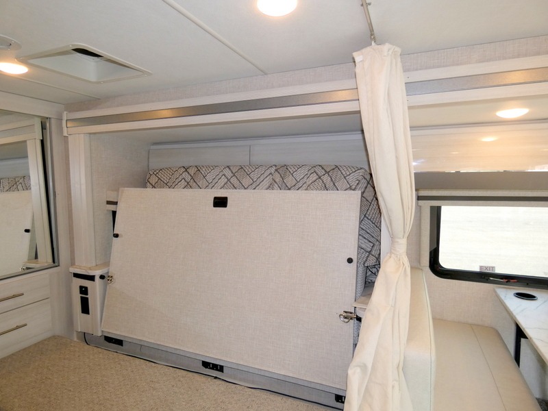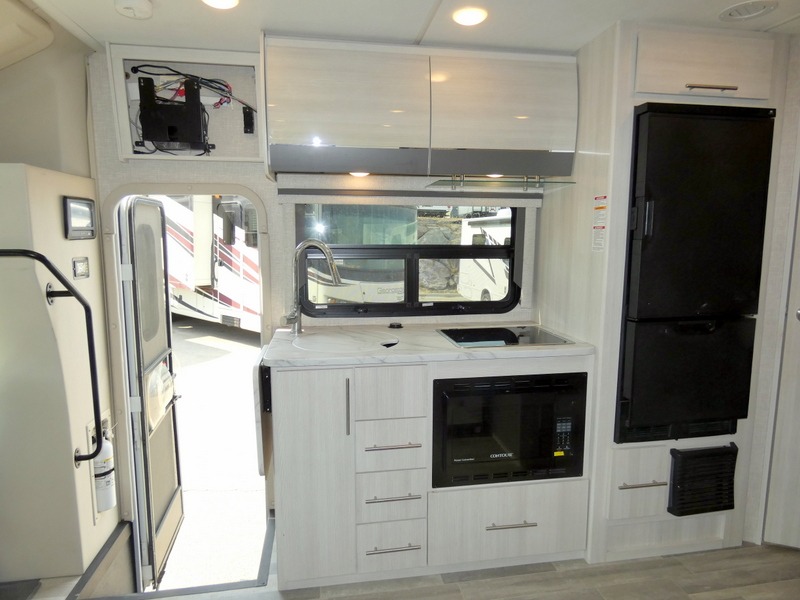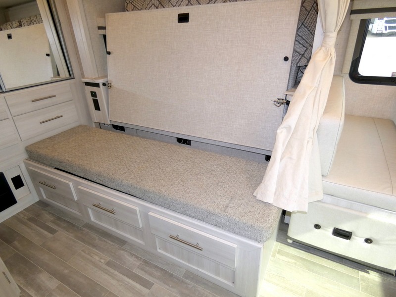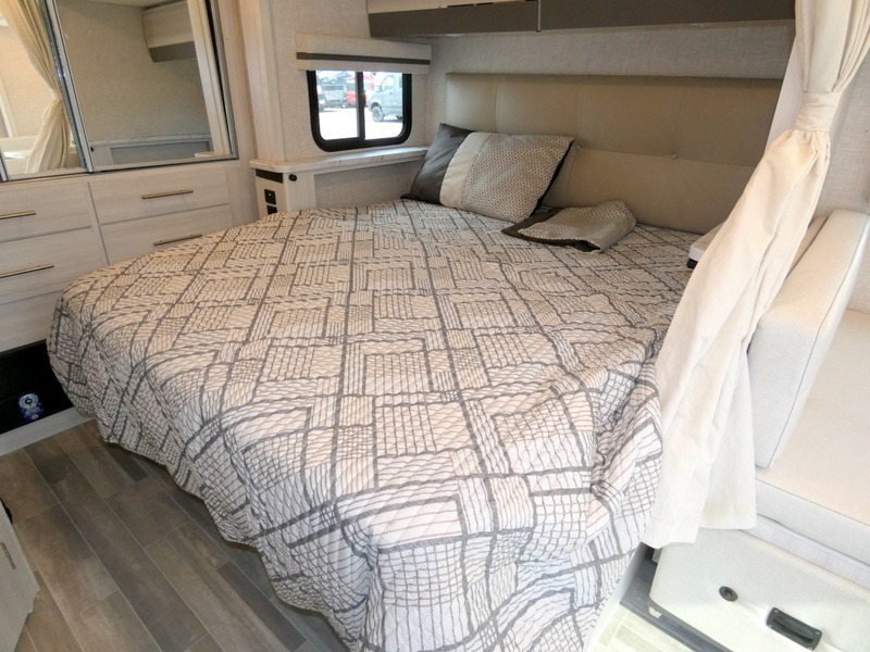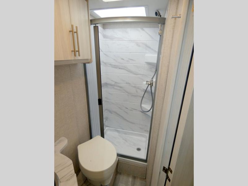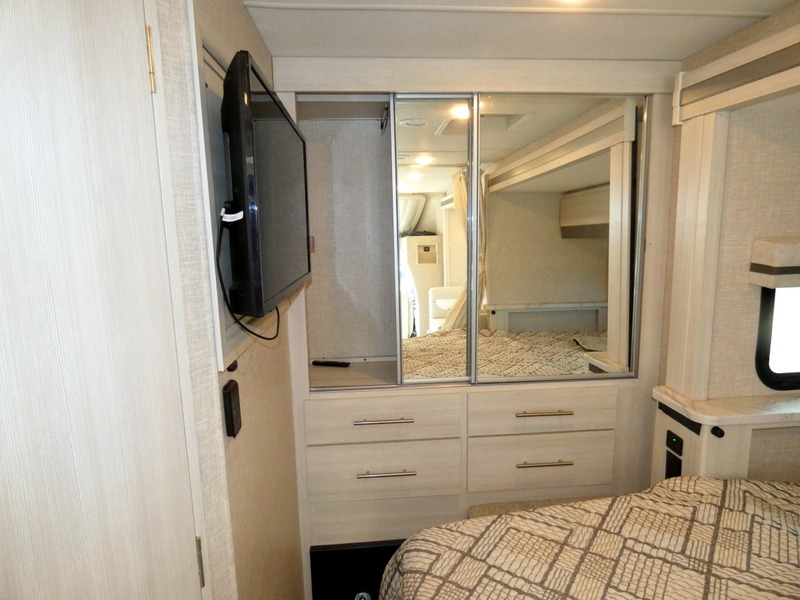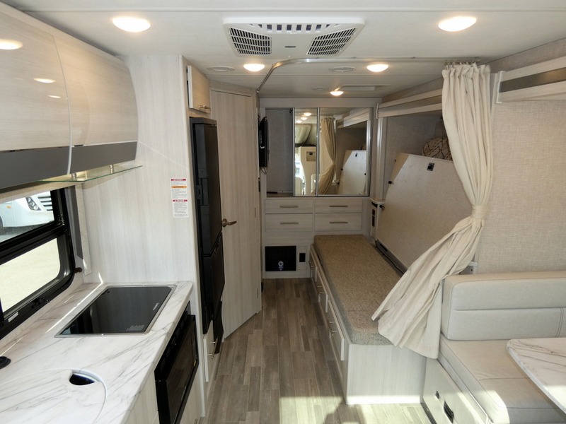 You will have everything you need in this motorhome for a comfortable trip! Create your own private bedroom with privacy curtain to close off the flip-up RV queen bed with cushioned seating underneath, the wardrobe, and the 32" TV. You can prepare delicious home cooked meals with the electric start two burner gas cooktop, keep your perishables fresh in the 12V dual door refrigerator, and enjoy your meals at the 68" dream dinette. There is also an entryway 32" TV to watch your favorite movies and a built-in skylight for more natural lighting. Start and end your days feeling squeaky clean in the rear corner bathroom with the 24" x 32" shower!