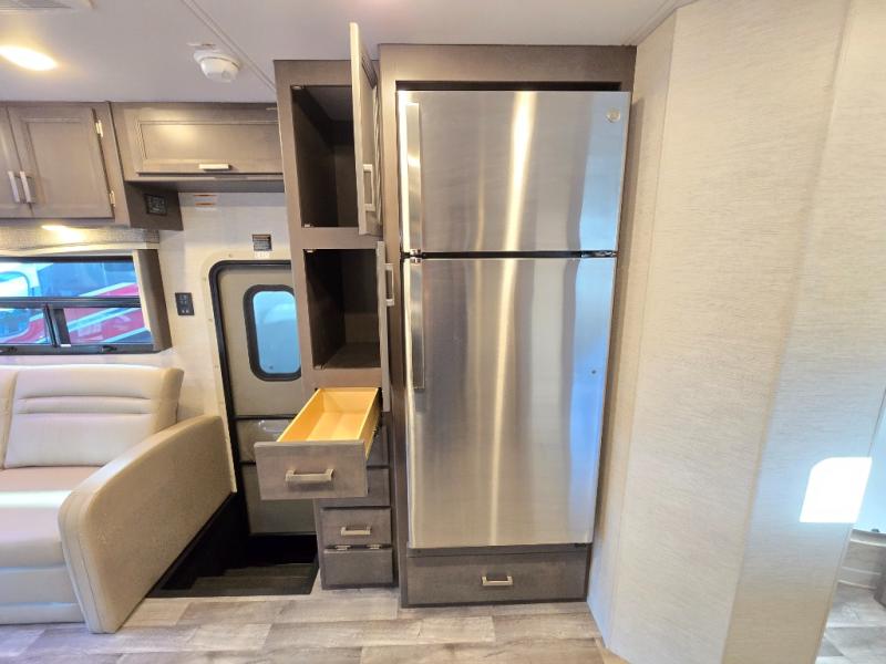 The Omni Super C diesel motorhome by Thor Motor Coach starts with a durable welded tubular steel floor, vacu-bond laminated roof, walls, and floors with block foam insulation, and a full-body paint package with gel-coat sidewalls. Each model includes either a F550 or F600 Power Stroke 4 x 4 Turbo Diesel engine that will allow you to maneuver tougher terrain when the adventure calls for it. The cockpit is every captain's dream with its power adjustable driver's seat, side view and back-up camera system, heated remote exterior mirrors, and more. You can control all of your coach's functions with the RapidCamp+ multiplex wiring control system, and the Winegard ConnecT Wi-Fi extender with 4G will allow you to stay in touch with the outside world as you travel. Each model includes residential linoleum throughout, Leatherette furniture, designer backsplash and solid surface countertops in the kitchen, and a glass shower door for that added touch of luxury. Come see all the other great features the Omni Super C diesel motorhome has to offer!