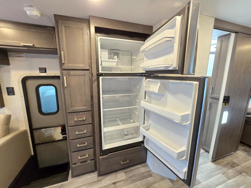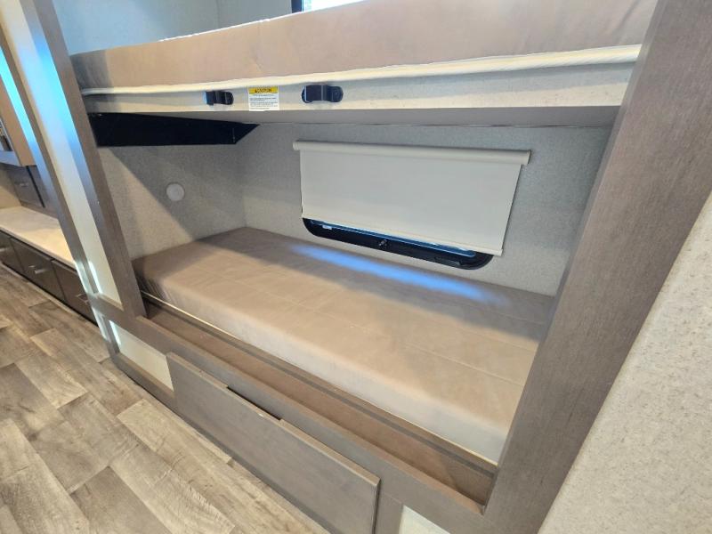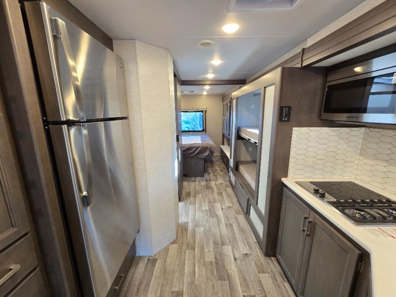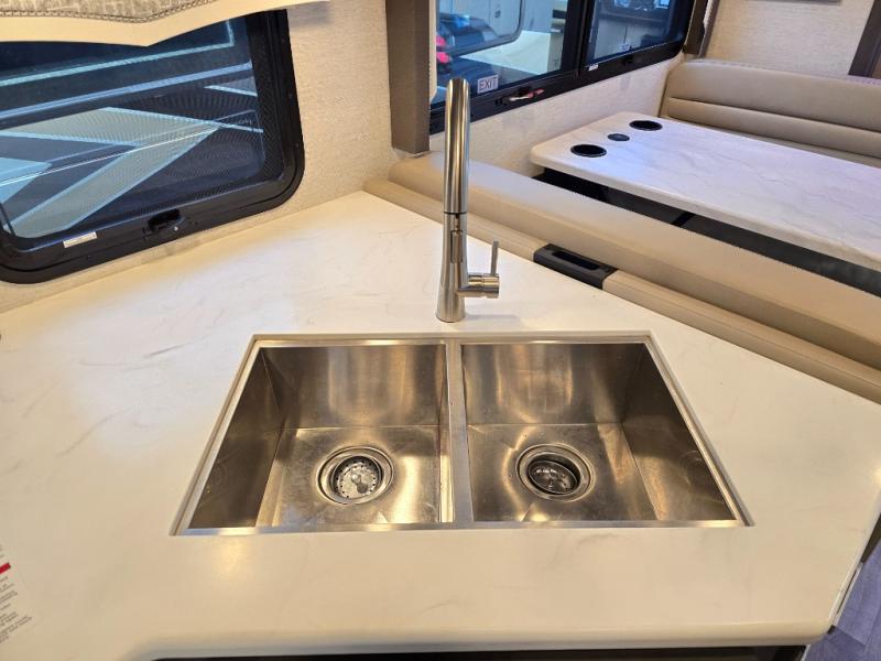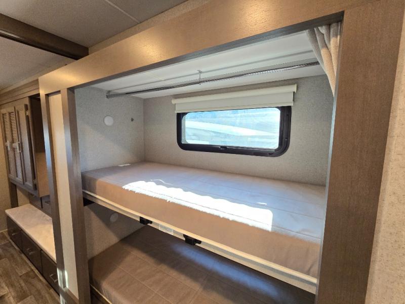 Travel in true comfort in this Omni Super C diesel coach with its full-wall slide to provide maximum floor space when indoors. A residential refrigerator and complete kitchen set up inside, plus the outdoor kitchen offers you plenty of options for cooking any day you travel. Your family and/or guests will enjoy the comfortable theater seating inside along with a 70" Dream Dinette for game time and dining. You can also choose an optional sofa in place of the theater seating if you prefer. A private rear bedroom with a king-sized bed will keep you well rested while on the road, and a set of bunk beds plus a cabover bunk with a 52" x 80" sleeping area makes it easy to bring along extra family members or friends.