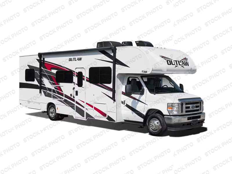 The Outlaw Class C gas motorhome toy hauler starts with the durable Ford E-Series chassis with a powerful 7.3L V8 engine that will allow you to adventure on! The 8,000 lb. hitch will be perfect for your car or motorcycle trailer, and the 10" touchscreen with a back-up monitor will let you maneuver the campground like a pro. This coach includes a Winegard ConnecT 2.0 WiFi/4G/TV antenna for all your connection needs, or you may want to unplug for a while with the 100-watt solar charging system with a power controller. The one-piece fiberglass front cap and sterling fiberglass exterior with a graphics package is sure to be eye-catching, and automatic leveling jacks come standard for easy set-up. Head inside to find pressed laminate countertops throughout, leatherette furniture, residential vinyl flooring, plus many more comforts you won't want to travel without!