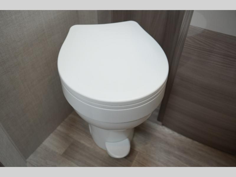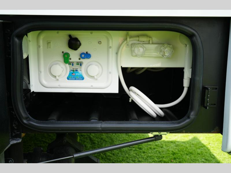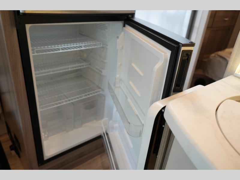 Enjoy the convenience of a split bathroom layout for simultaneous use – with a 24" x 32" shower on one side and toilet/vanity on the other. The kitchen comes equipped with a flip-up countertop extension for added prep space, and multiple smart touches throughout – including USB charging ports, privacy roller shades, and a telescoping ladder to access the overhead bunk.