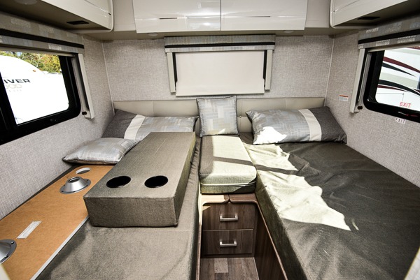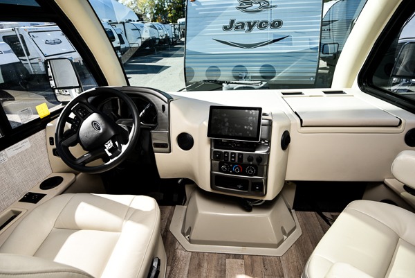 The front cab of this Vegas Class A gas motorhome is excellently appointed with a stow-away coffee table, reclining/swivel leatherette captain's chairs, and a 10" touchscreen dash radio with Bluetooth, Android Auto, and Apple CarPlay! A single slide holds the 68" sofa bed so that it isn't in your way as you walk back to the semi-private bedroom. The kitchen offers you a two burner cooktop to sauté veggies, and there are two Smart TVs to provide you with all the entertainment you could need. Within the full bath you'll find a 27" x 27" radius shower with a skylight, a stainless steel bath sink, and a 12V power bath vent to keep this space fresh.