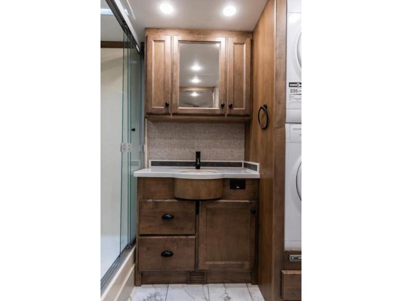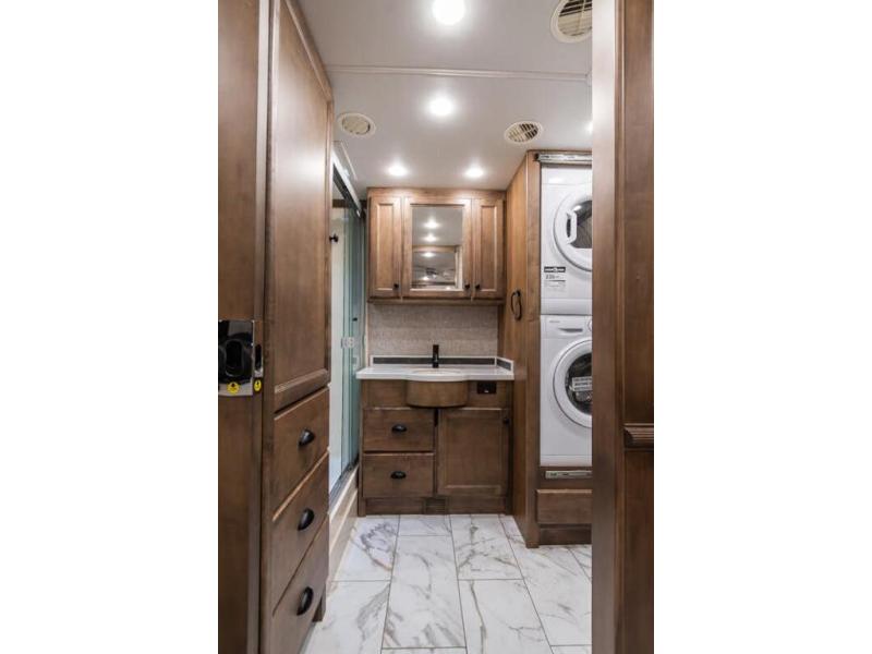 This RV features LCI leveling system, aluminum wheels, full body paint, dual A/C, diesel generator, freightliner chassis, tilt/telescoping steering wheel, smart wheel, secondary engine brake, GPS, power windows, power door locks, patio awning, door awning, window awning, LED running lights, black tank flush, power electrical reel, exterior shower, clear paint mask, solar, inverter, ceramic tile, all electric coach, leather seating, stackable washer/dryer, central vacuum, 7 foot ceiling, dual pane windows, multi-plex control panel, hardwood cabinets, convection microwave, solid surface counter, cab over loft and much more