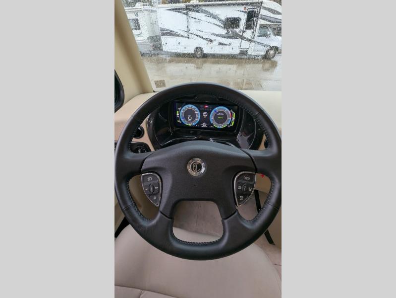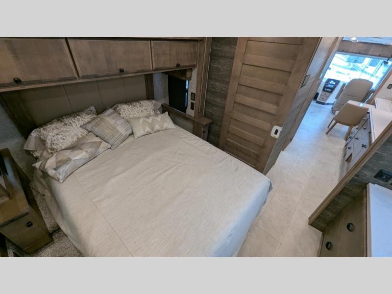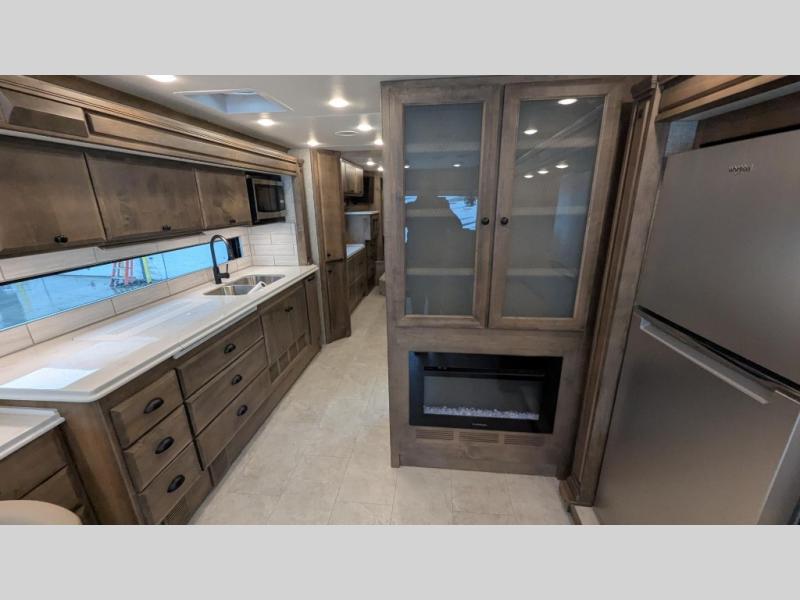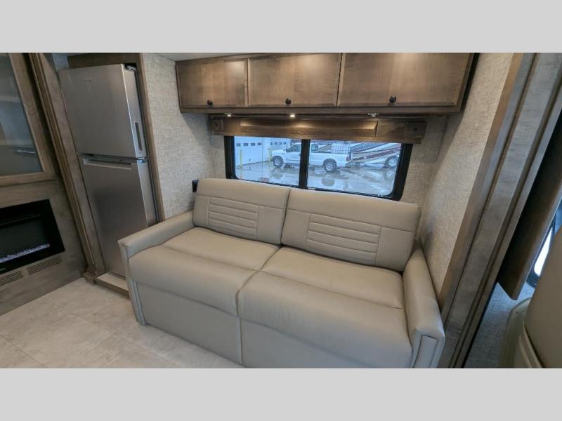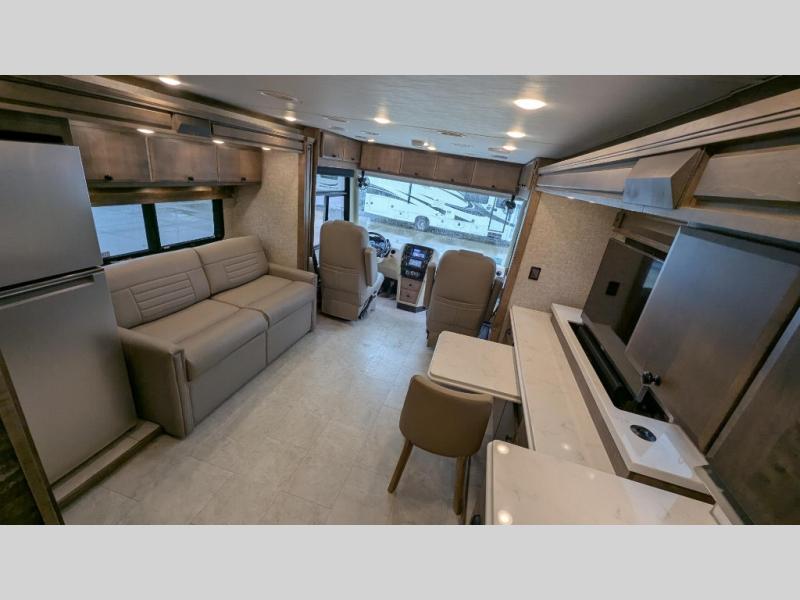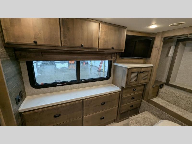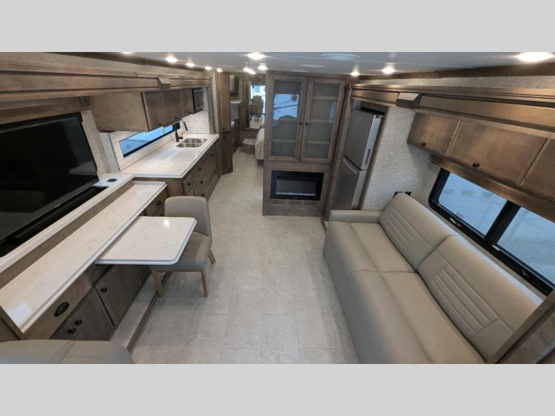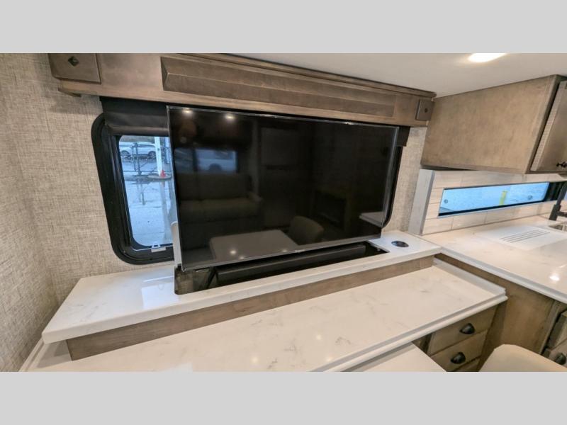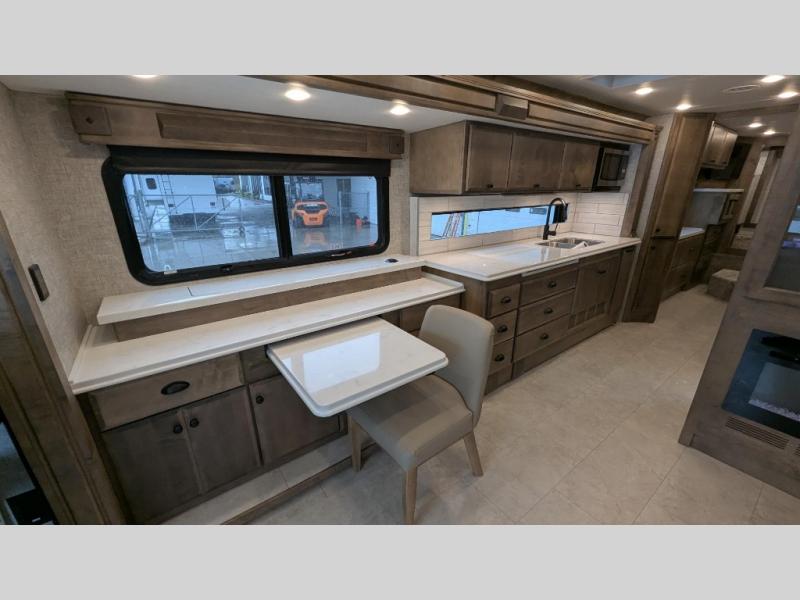 Pack your bags and load up into this motorhome for a luxurious adventure! The rear private bedroom has a king bed slide that can be switched for an optional queen bed, a bank of drawers next to a TV, a large closet, and a wardrobe that is prepped to add an optional washer and dryer so you can have clean clothes throughout your entire trip. The full bathroom has a shower skylight, gravity flush toilet, solid surface countertop, and a handheld shower head with a slide bar for added convenience. When you're ready to eat, just whip up a meal on the three burner propane cooktop or use the convection microwave. You can dine at the booth dinette, or maybe switch out the dinette for an optional dinette computer workstation with a lift TV! You can spend your evenings with a movie since there is a living area TV with an optional fireplace, or you can head outdoor to enjoy the exterior TV and Girard power awning with LED lights!