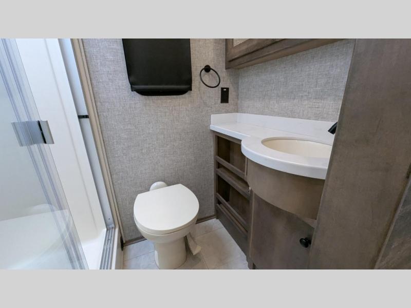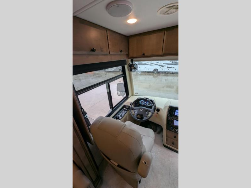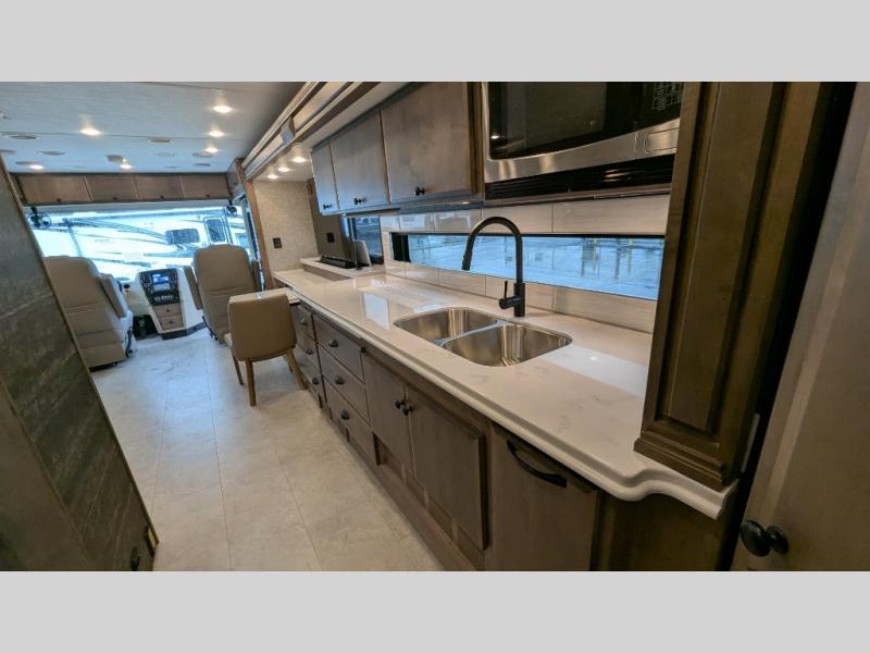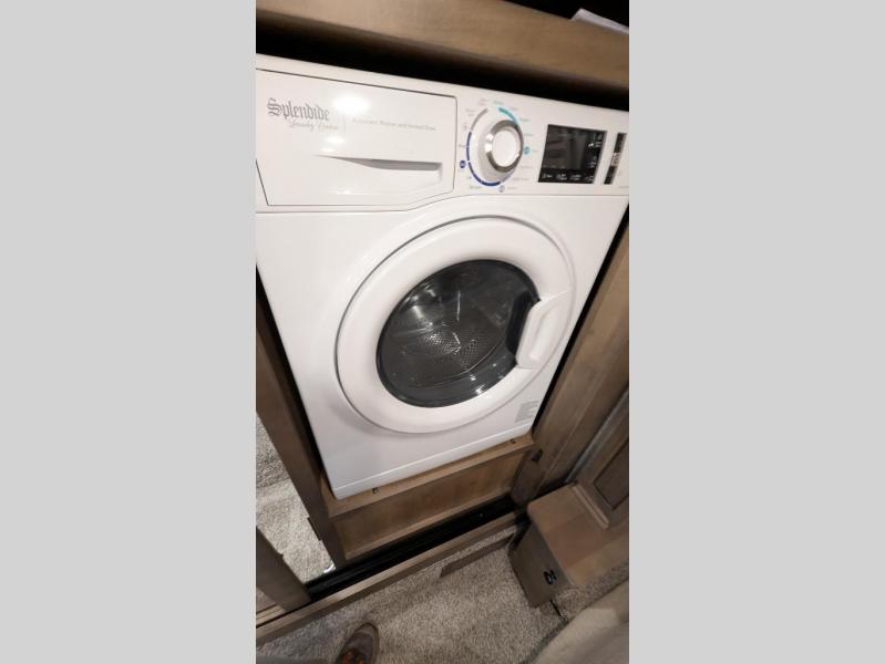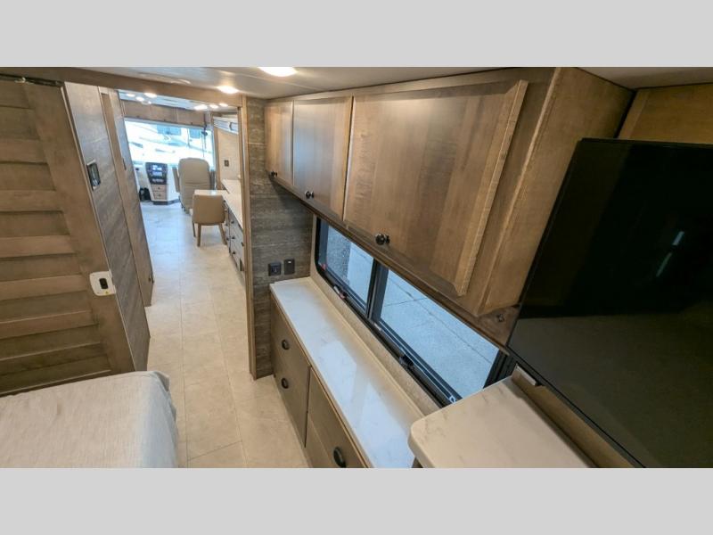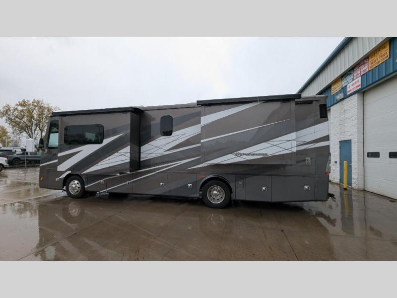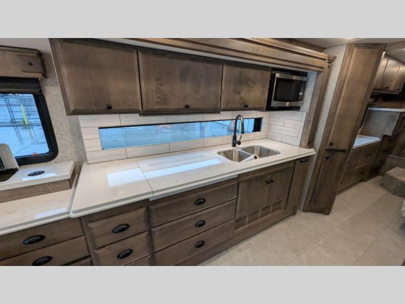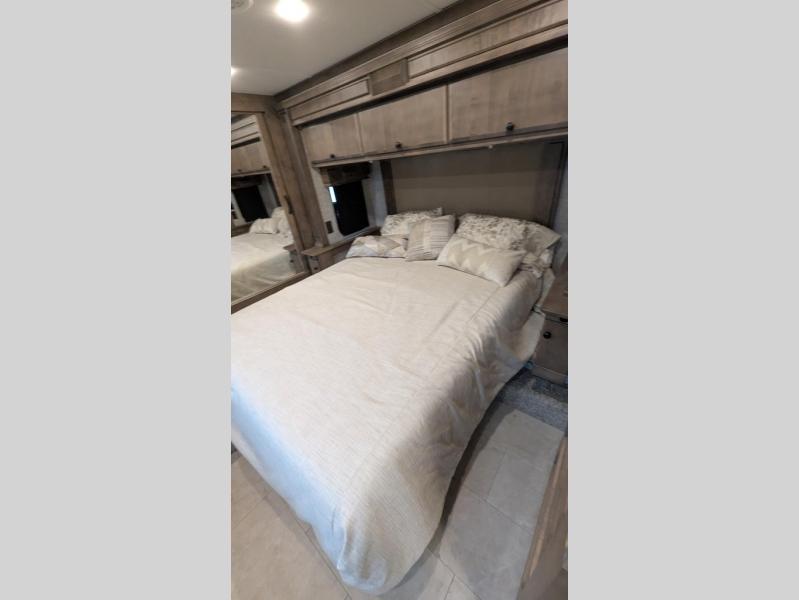 Pack your bags and load up into this motorhome for a luxurious adventure! The rear private bedroom has a king bed slide that can be switched for an optional queen bed, a bank of drawers next to a TV, a large closet, and a wardrobe that is prepped to add an optional washer and dryer so you can have clean clothes throughout your entire trip. The full bathroom has a shower skylight, gravity flush toilet, solid surface countertop, and a handheld shower head with a slide bar for added convenience. When you're ready to eat, just whip up a meal on the three burner propane cooktop or use the convection microwave. You can dine at the booth dinette, or maybe switch out the dinette for an optional dinette computer workstation with a lift TV! You can spend your evenings with a movie since there is a living area TV with an optional fireplace, or you can head outdoor to enjoy the exterior TV and Girard power awning with LED lights!