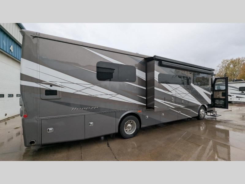 Every one of these Tiffin Motorhomes Allegro Breeze Class A diesel motorhomes are made to move you closer to your destination in true comfort! The rear diesel 340HP Cummins B6.7 engine will propel you while the smooth Reyco Granning air ride suspension provides a nimble ride and PowerGlide chassis holds it together. You will have warm water thanks to the Truma AquaGo Comfort instant water heater and the AquaView Showermiser system will save on water usage. You will love the stylish interior decor, along with handcrafted cabinetry and an engineered wood sub-flooring. The eight-step, full-body paint system comes with premium grade paints that are sealed with three layers of a clear coat that has ultraviolet protection, as well as an additional layer of high-performance film. Some other features that will make your trip easier include a tilt and telescoping steering wheel with integrated controls, a 7" high-definition monitor for the side and backup cameras, and electronic stability control. The optional Starlink prep will give you the option to stay connected as you're on the road, and the Lippert On-The-Go telescoping ladder is now standard for added convenience.