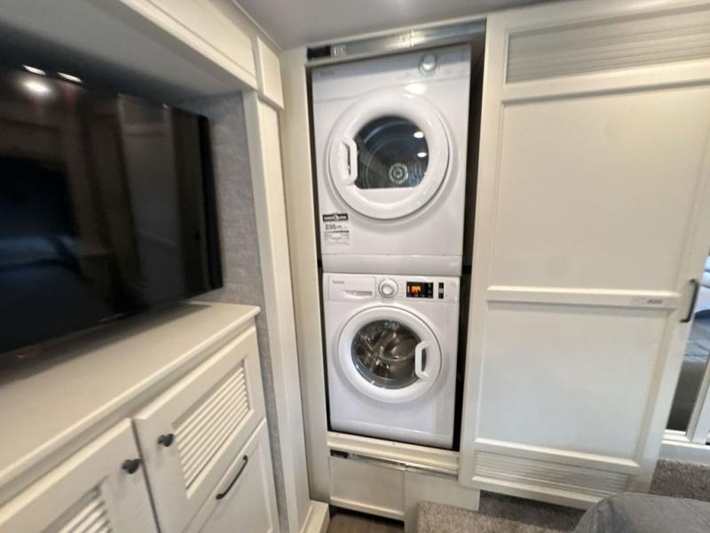 If you've been in the market for a coach with added interior space and at-home comforts, look no further than this Byway! The super sofa and booth dinette sleeper will provide cozy seating space plus additional sleeping spaces for your guests. If you need even more, just choose the optional drop-down front bunk! The kitchen includes everything you need to prepare meals each day, including a 1.5 cu. ft. Smart convection microwave, task lighting, and a 18 cu. ft. residential refrigerator with a bottom freezer. The mid coach full bath lets you stay clean throughout each trip, and the rear private bedroom will be your own oasis at night. Here, you'll find a king bed slide out with nightstands on either side, a mounted TV, a spacious wardrobe, plus stacked washer/dryer prep if you want the option for easy wash days!