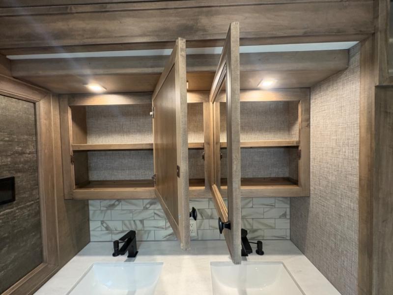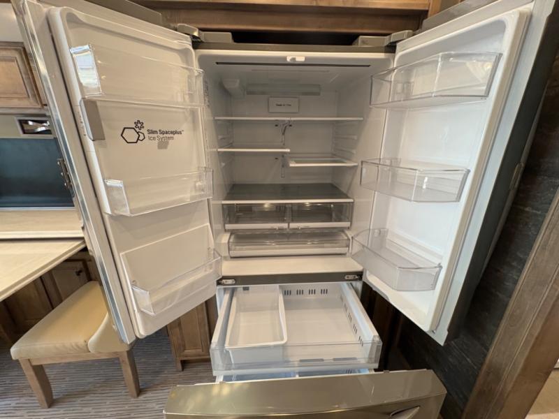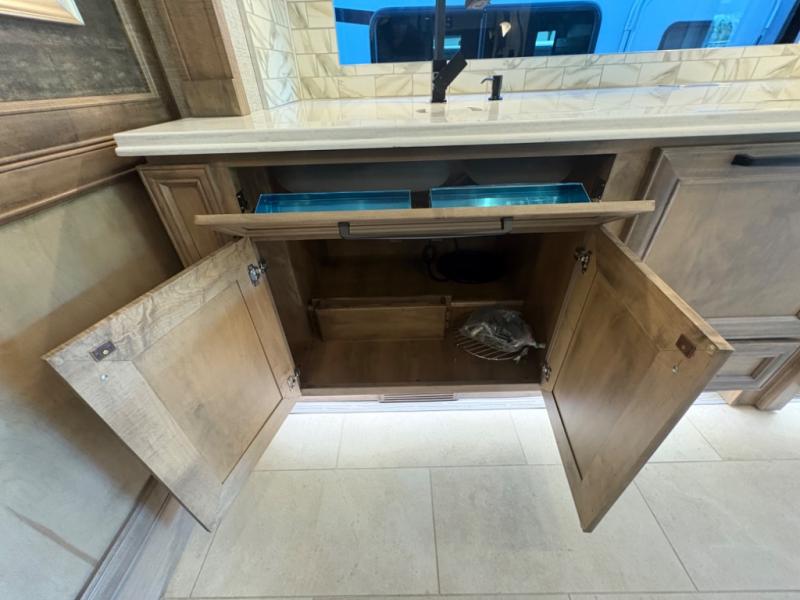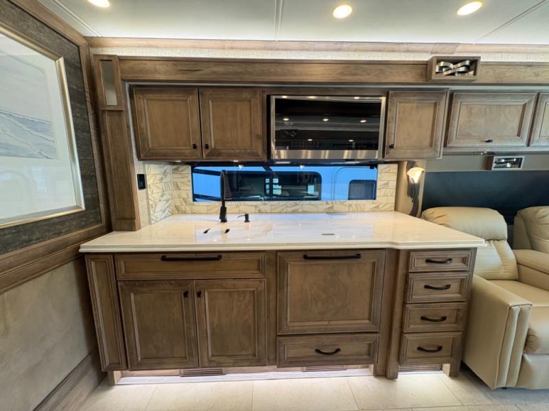 Spacious and Elegant Interior: The 40 IH floor plan offers a generous living space, featuring a king-sized bed, a bath-and-a-half layout, and expansive slide-outs that create an open, airy atmosphere. The interior boasts high-end finishes, including porcelain tile flooring and solid surface countertops, ensuring a luxurious environment throughout.