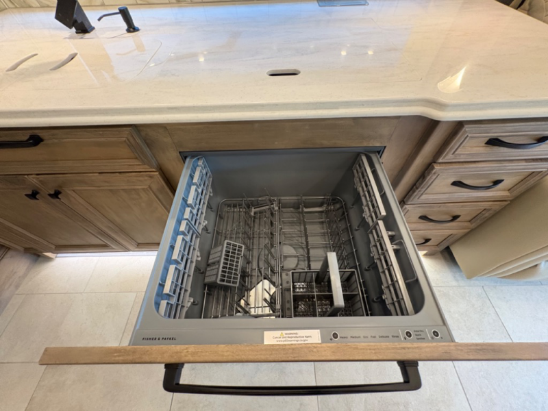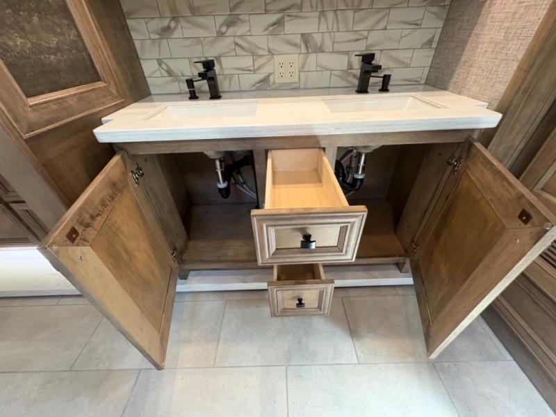 Gourmet Kitchen: Equipped with a 25-cu. ft. residential refrigerator, a 1.7-cu. ft. smart convection microwave with air fry, and a double-basin sink with a pull-down faucet, the kitchen is both functional and stylish. Ample storage and a full tile backsplash add to the appeal, making meal preparation a delight.