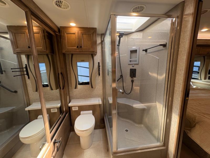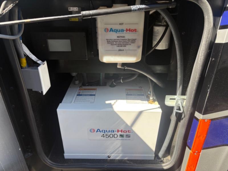 Advanced Technology and Comfort: Stay connected and comfortable with features like the Firefly Integrations Eclipse multiplex system, three 15,000 BTU air conditioners, and a 10.0 kW Onan Quiet Diesel generator. The hydronic heating system ensures warmth during cooler months, while the heated tile floors add a touch of luxury.