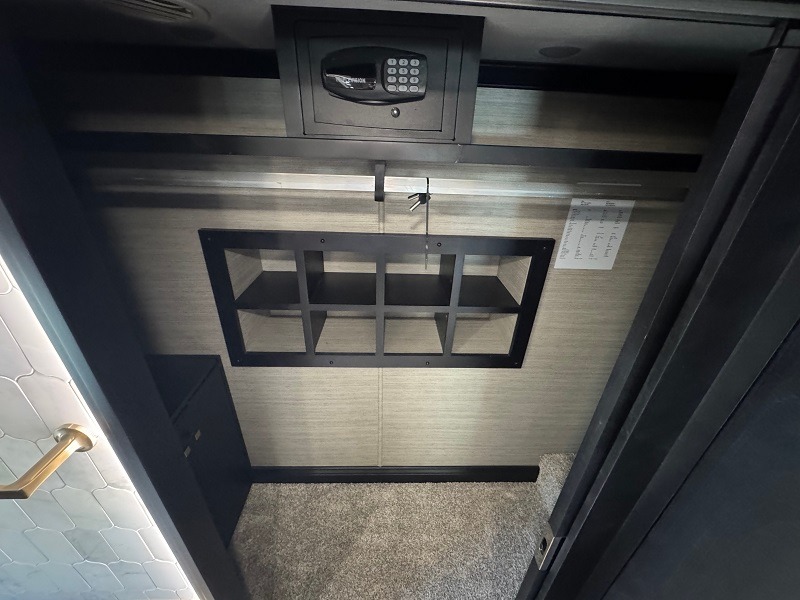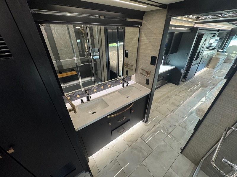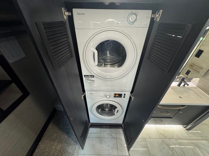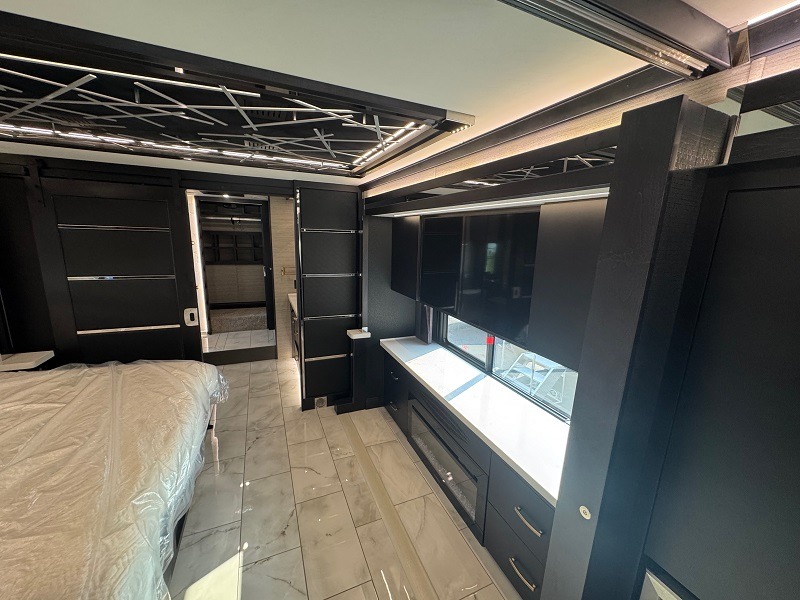You won't believe all that this motorhome has to offer! Starting with the full rear bathroom which has a dual sink vanity with a tri-view mirror for two to get ready at once, a 34" x 52.5" shower to clean up in, a floor to ceiling closet with a safe above shoe storage, and an egress rear exit for your safety. The master suite has a king bed slide and a TV with a fireplace below for a truly relaxing evening. The half bathroom is conveniently by the fully equipped kitchen for quick bathroom breaks as you prepare delicious home cooked meals, plus there is a countertop extension for more countertop space. You could even add an optional outdoor grill center to grill the catch of the day. With a dinette computer workstation, you can get work done during the day and play games at night after dinner. The DE sofa bed and air coil sofa bed offer comfortable places for guests to sleep too!