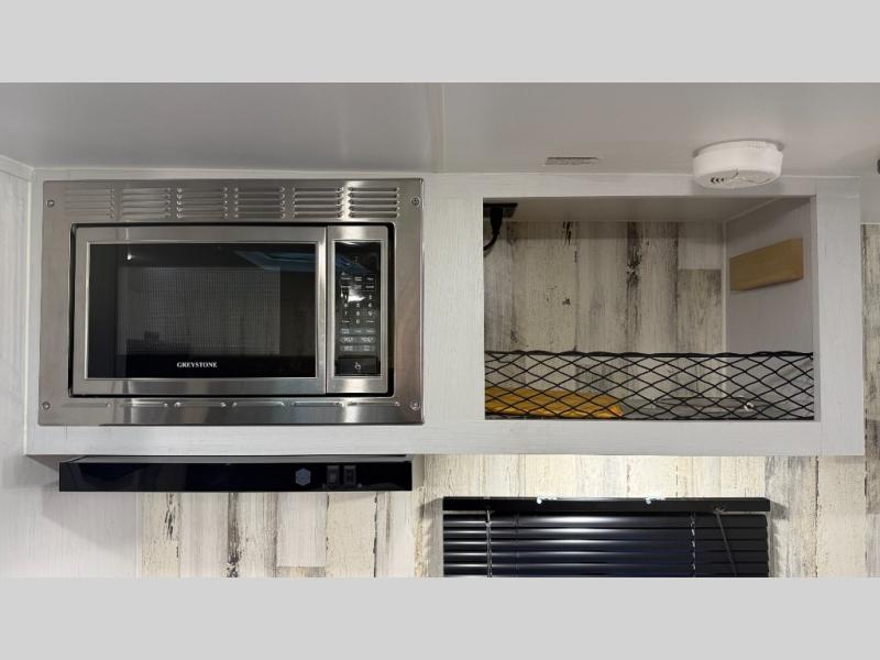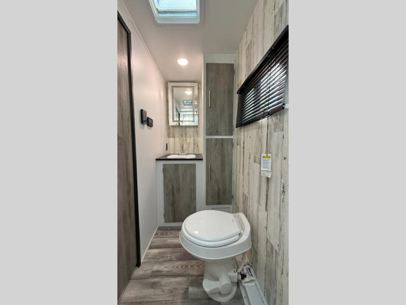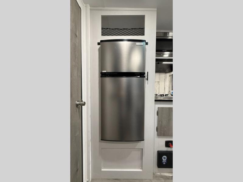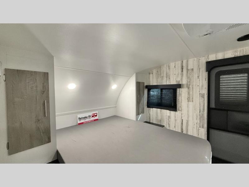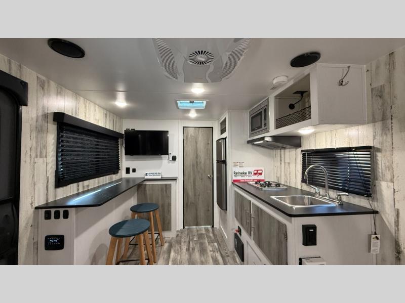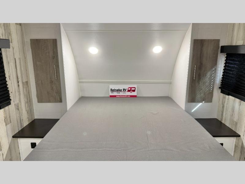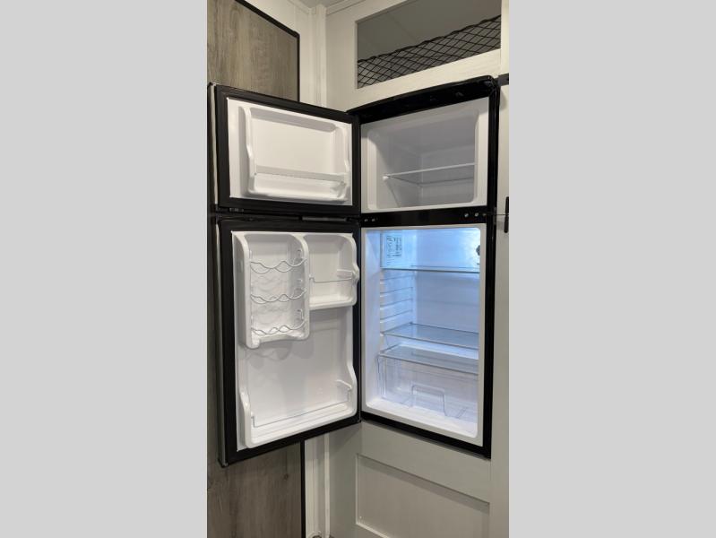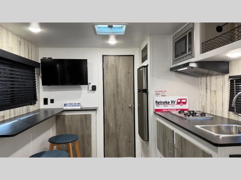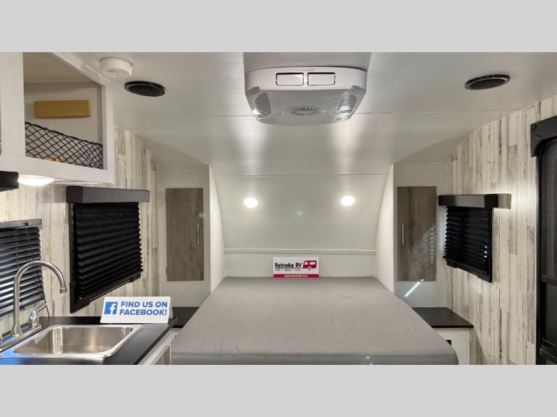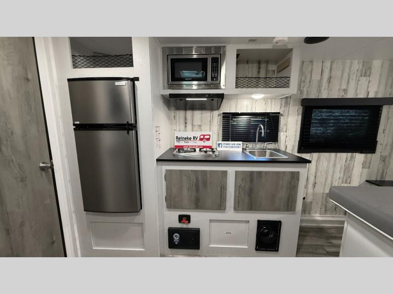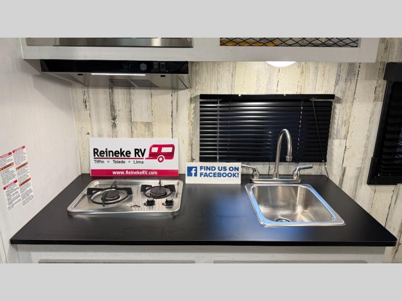 Weekends at the campground are made easy with this travel trailer that can sleep two each night. Once you've unpacked your things, you can stretch your legs around the camp, then head inside to make lunch. You'll find a two burner stainless steel cooktop in the kitchen, along with a 12V refrigerator for food storage. When it's time to turn in for the night, there is a rear bath, plus a front queen bed for comfortable sleeping space. This travel trailer also includes plenty of storage space, including storage shelves in the bath and storage throughout!