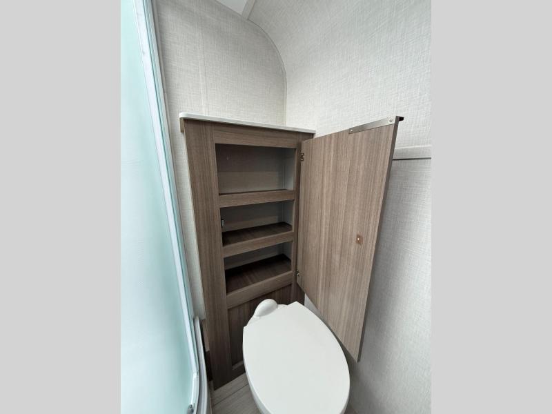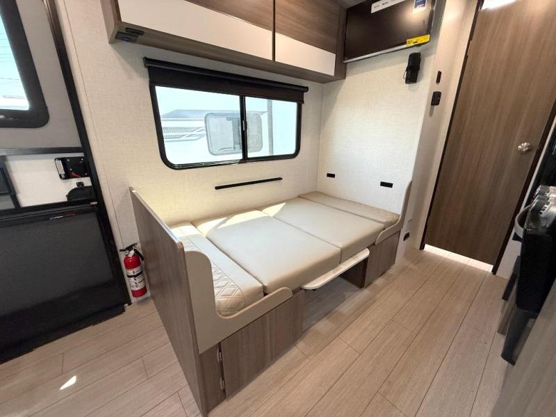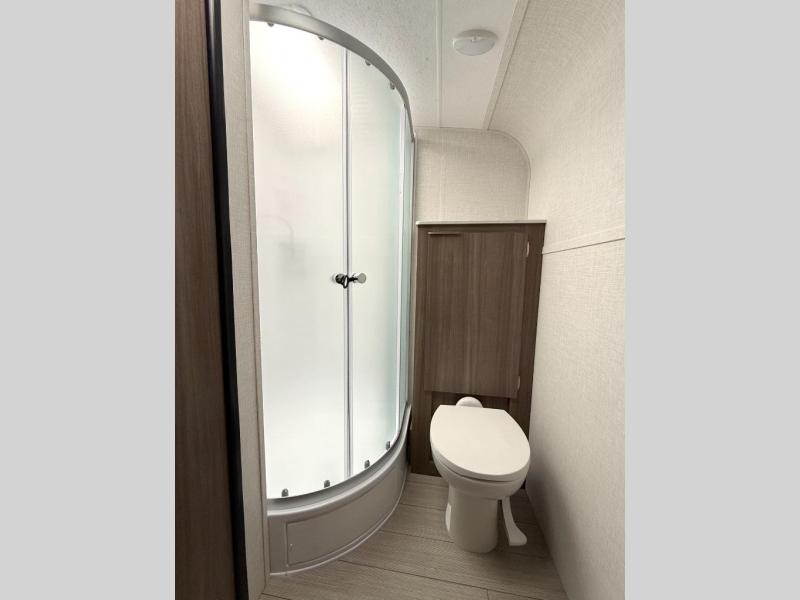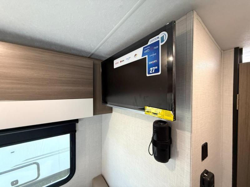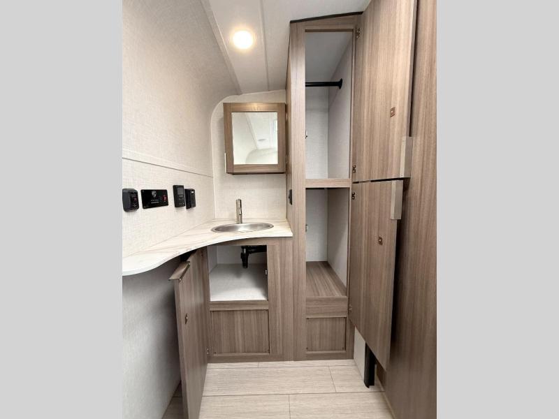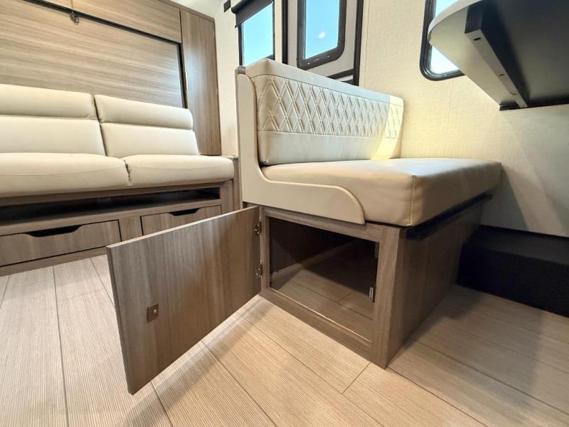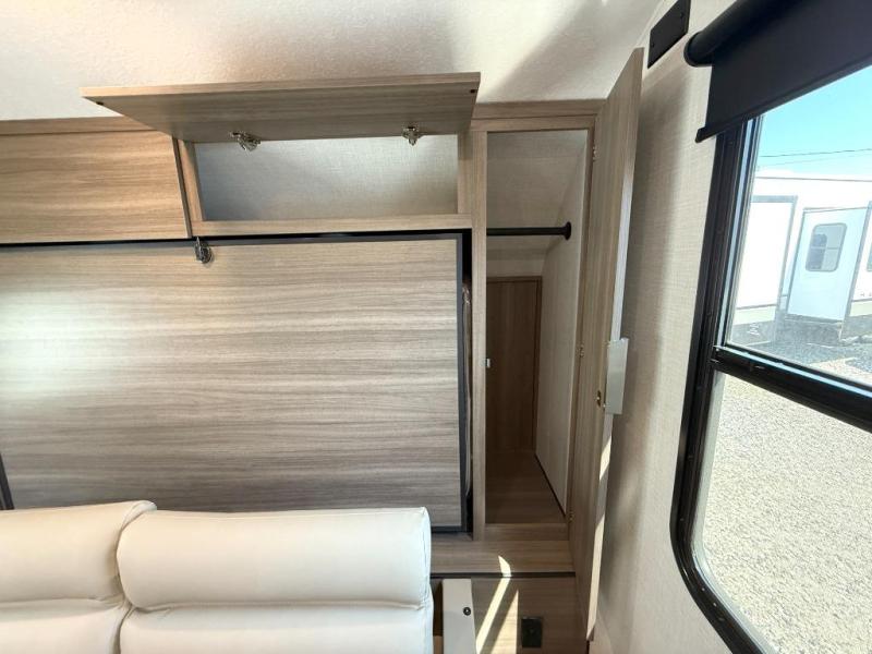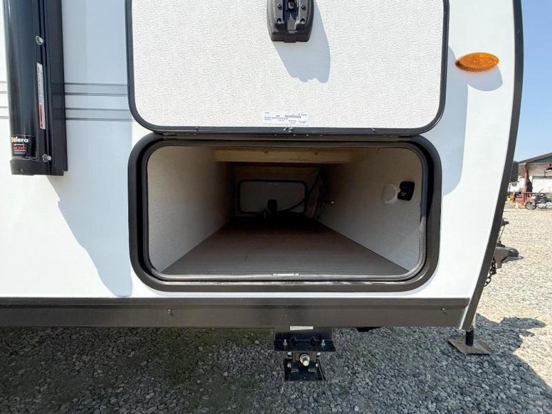 This versatile travel trailer gives you a sofa during the daytime to relax on up front and a Murphy bed to easily setup at night. There are dual wardrobes for your clothing, StorMore bedside nightstands with a 110V outlet and USB charging for your cellphones and such, and a rear full bathroom with linen storage in two places, a 34" radius shower, and medicine cabinet for more items. The galley kitchen offers appliances to make warm meals and store leftovers, and the booth dinette on the opposite side provides dining inside plus a sleeping space at night. Your outdoor gear can be placed in the pass-through compartment along the exterior, and you can always relax under the 13' power awning before and after the day's activities.