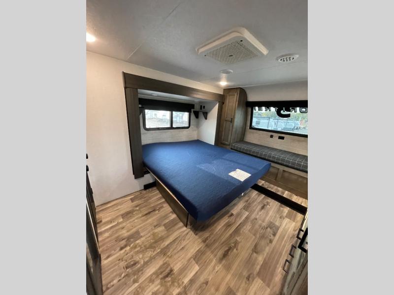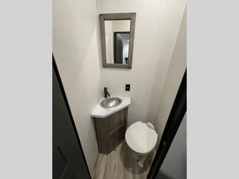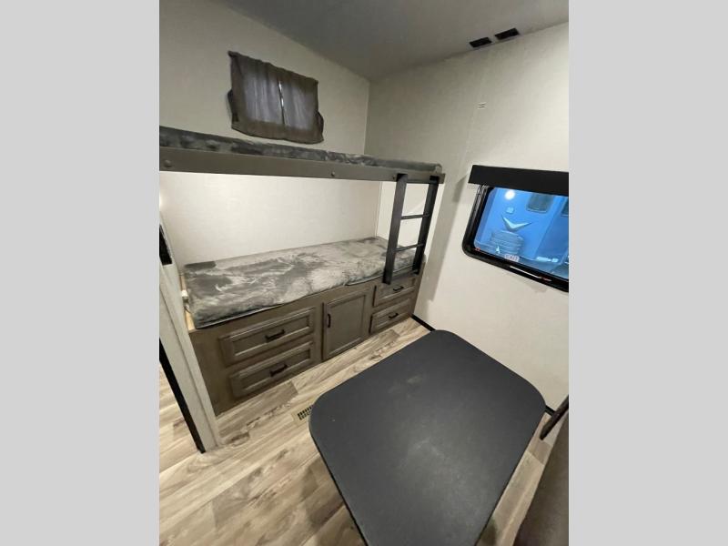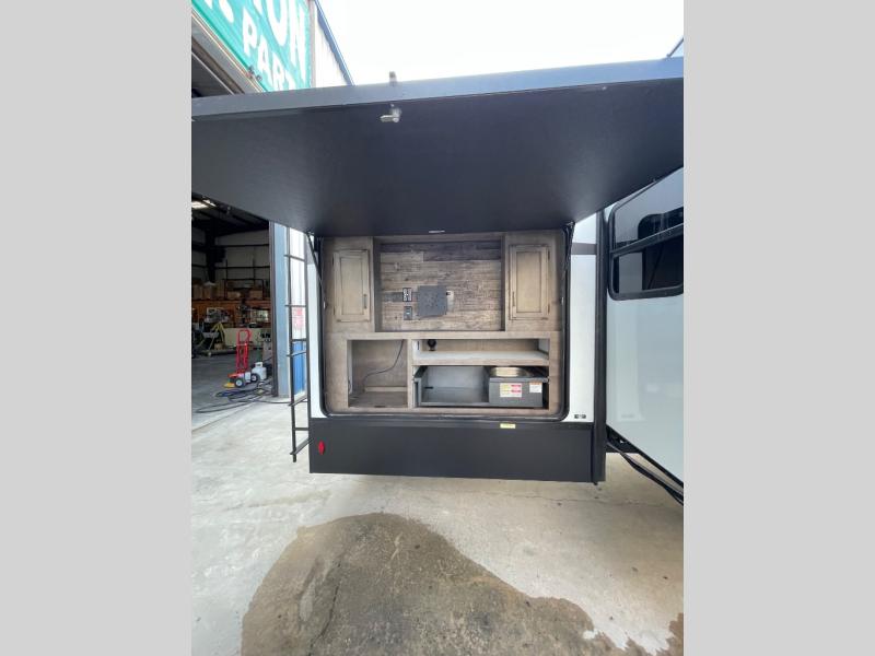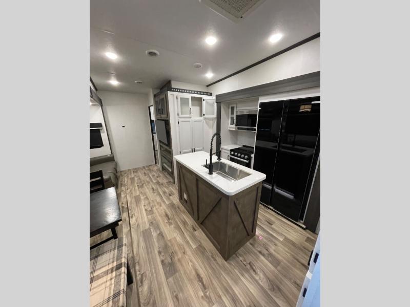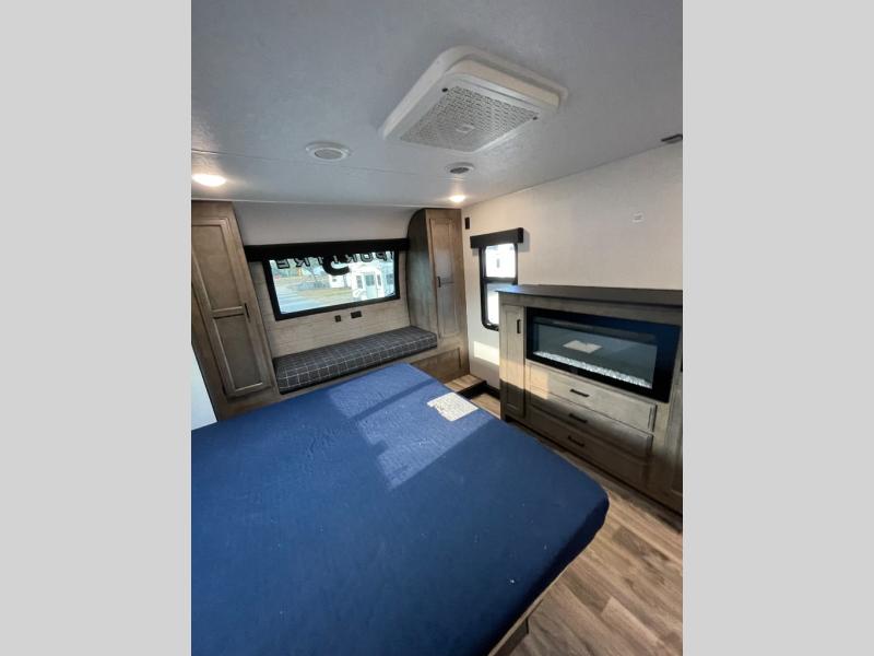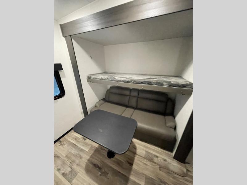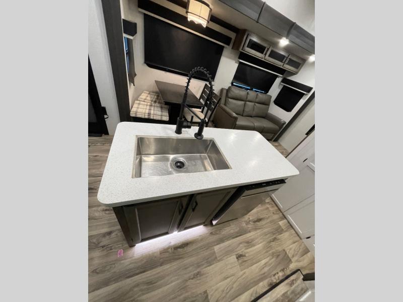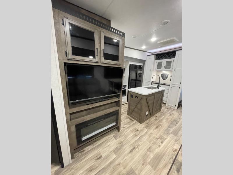 The whole family will have a great time camping in this fifth wheel! The kiddos will enjoy their own privacy with the rear private bunkhouse which has a bunk over bunk, a top bunk above a 70" sofa with table slide, and even its very own half bathroom. With a front private bedroom as well, you will have your own privacy with a Serta king mattress to lay your head on at night, a comfortable window seat to read a book by the 5,000 BTU fireplace, and a shelf storage closet to keep things organized. Everyone can clean up in the 48" fiberglass shower with a seat in the full bathroom, and keep their bellies full with the fully equipped kitchen which even has a 18" GE stainless steel dishwasher at the kitchen island. Relax on the 70" tri-fold sofa in front of the 5,000 BTU fireplace or play a few card games at the table with two chairs and two Versa benches!