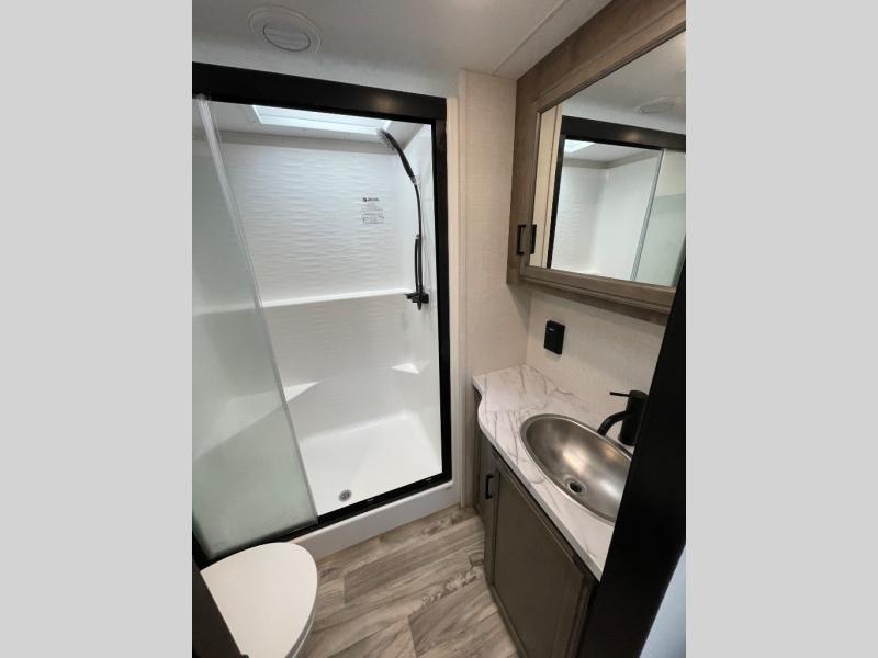 An elegant design and new features come with every one of these Venture RV SportTrek Touring Edition fifth wheels! The NXG Huck bolt frame holds these units together and Tufflex PVC roofing covers them. Heads will turn down the highway and at the campsite with the frameless tinted windows and high gloss fiberglass front cap with automotive paint. The exterior pass-through storage area has slam latch baggage doors with magnetic catches so you don't have to worry about them closing on you and LED lighting on the electric awning so you can see clearly even at night. Luxury abounds throughout these units, especially with the two fireplaces, solid surface kitchen countertops, blackout roller shades, and maximum storage designs. Come find your favorite model today!