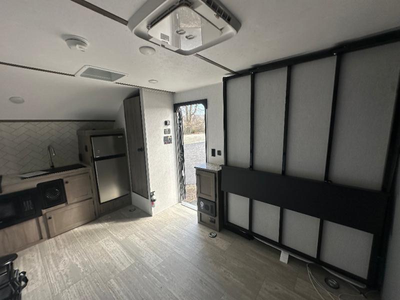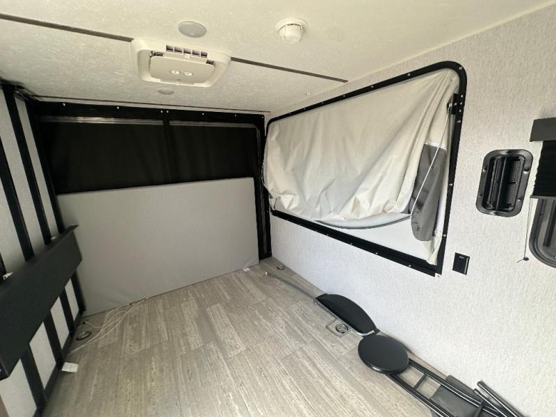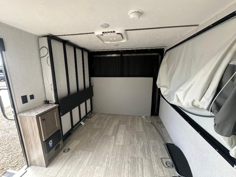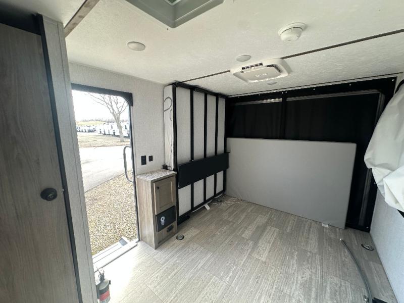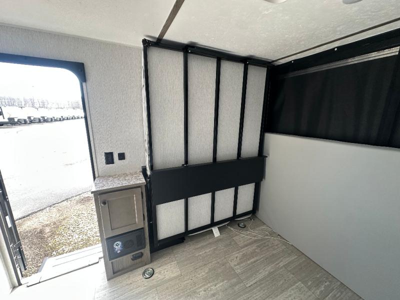 It will be so easy to load up dirt bikes, kayaks, or a go cart in this toy hauler! There is an 88" x 74" ramp door and a 10' 3" garage with d-ring tie downs to keep your gear secure. The fold-up dining bar is on the underside of the 50" x 74" Murphy-style bed that will fold down when you're ready for bed, plus there is a side tent bed for more sleeping space. Up front, you'll find a two-burner range, 20" microwave, and 4.4 cu. ft. 12V refrigerator to store food, along with a wet bath that will allow you to freshen up daily!