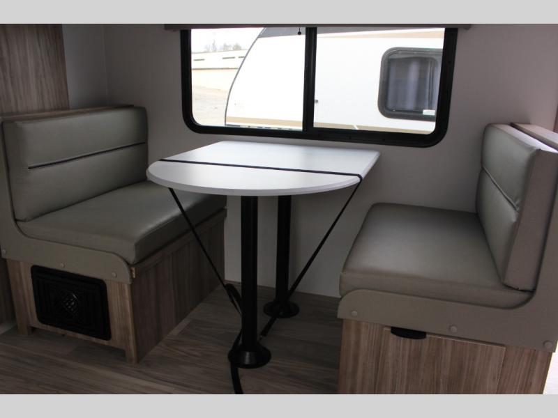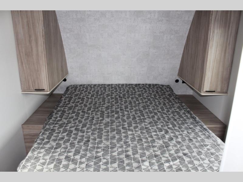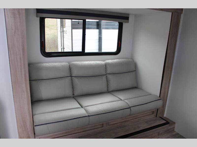 If you are looking for a rear kitchen layout, then this M-Series trailer might be perfect for you! Enter and find the kitchen right there making loading groceries a cinch with the 10 cu. ft. RV refrigerator just inside the door. There are dual windows near the corner sink which is great when washing dishes allowing you a nice view of your surroundings. A 64" jack-knife sofa slide creates more space on the interior for moving around, and also functions as additional sleeping. Opposite the sofa, you will find a 32" x 76" booth dinette. Here is where you will find overhead cabinets and an optional TV if you choose to add. A walk-through bath offers plenty of space to get cleaned up and ready for another day since it stretches across the entire width of the trailer. Each morning or night you will enjoy the convenience of a 30" x 36" shower on one side, and a toilet and corner vanity with sink opposite. The vanity counter also stretches along the curbside wall for added space for your things. A sliding space saving door leads into the front private bedroom featuring a queen bed with dual bedside wardrobes for your clothing. There is a large overhead cabinet as well. On the outside, a pass-through compartment offers easy access for all of your outdoor gear and more!