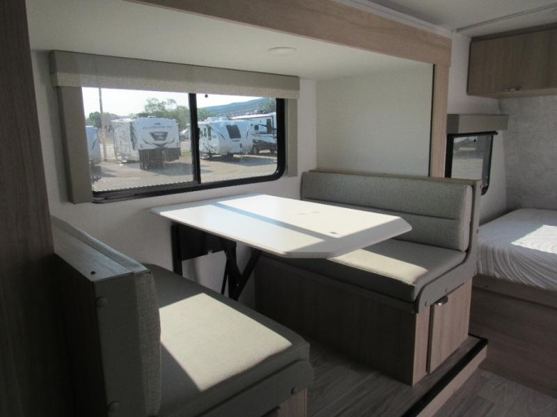 Join the crew of happy campers who are getting away in this Micro Minnie FLX travel trailer! You will be able to store your favorite belongings in the exterior Pack-N-Play storage, and you can also fill up the 10 cu. ft. 12V refrigerator with fresh produce. The kitchen includes a recessed three-burner cooktop with backlit knobs and glass cover as well as a convection microwave, so you'll never go hungry. There is even a flip-up countertop in the kitchen too, and it can be used when you need more space to prep meals. The front 54" x 74" bed can be sectioned off from the rest of the trailer by drawing the divider curtain, and you can switch out the booth dinette for the optional EZ Glide sofa sleeper with hutch and table if you prefer that configuration.