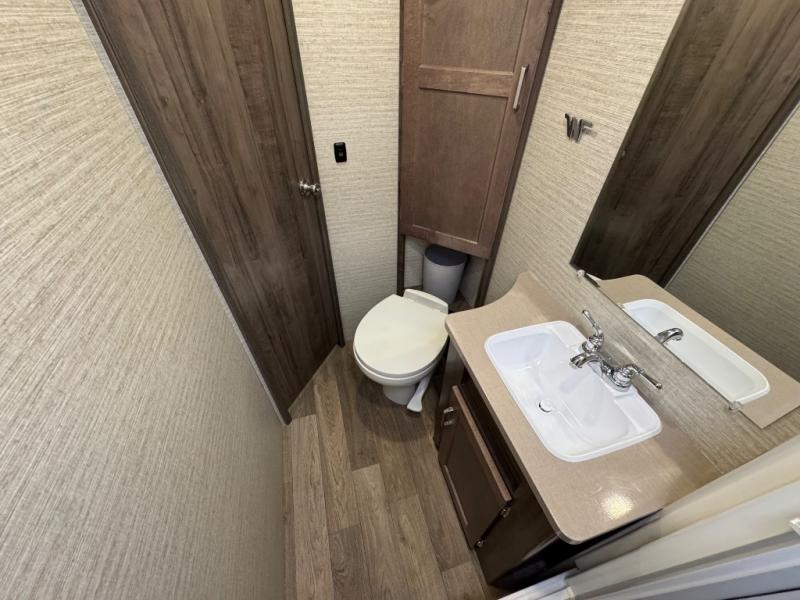 Your crew of five will love traveling and camping in this cozy coach. Once you arrive at the campground, the cook can prepare lunch on the three burner cooktop, or use the microwave oven if you're wanting something quick. If you need to freshen up from driving all day, there is a 23" x 34" shower in the full bath, plus a shower skylight and a medicine cabinet where you'll find your necessities. This model includes a U-shaped dinette that will be perfect for meal times, a game of Monopoly, and additional sleeping space, or you may just find yourselves outdoors under the 14' power awning with LED lights. And don't overlook the storage space in this model with a bedroom wardrobe, a kitchen pantry, plus a large lighted trunk storage for larger camp gear! This model also has an optional Ford E350 chassis; see dealer for more details and specs!