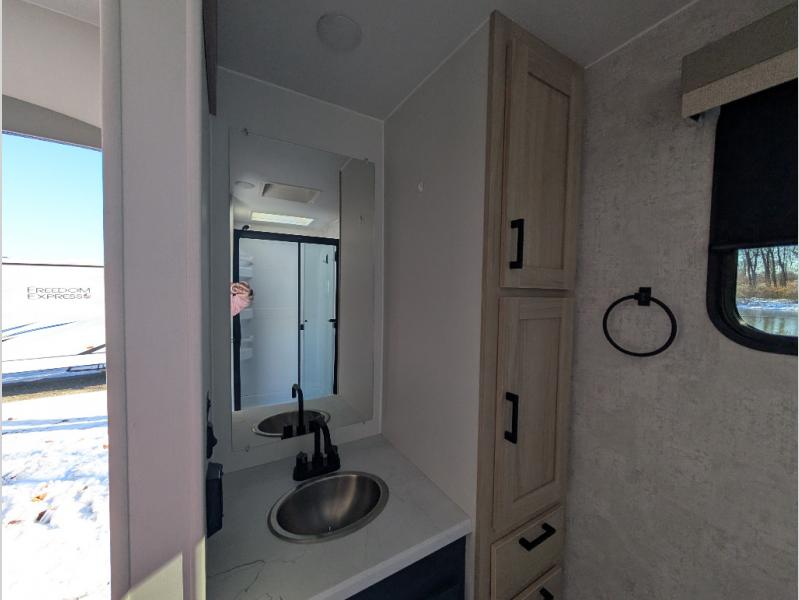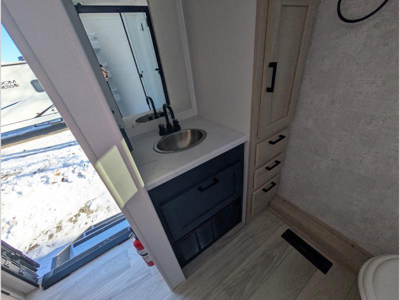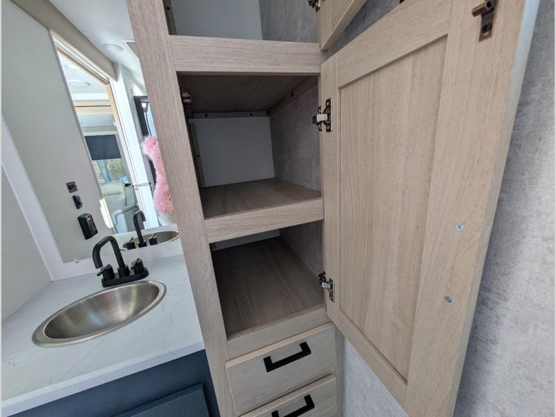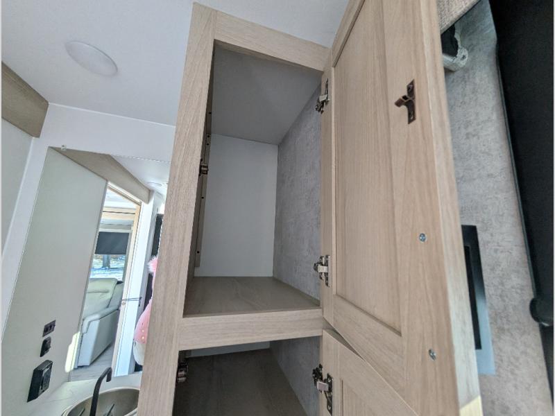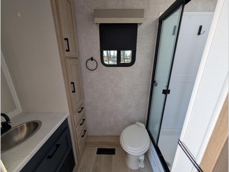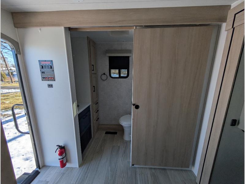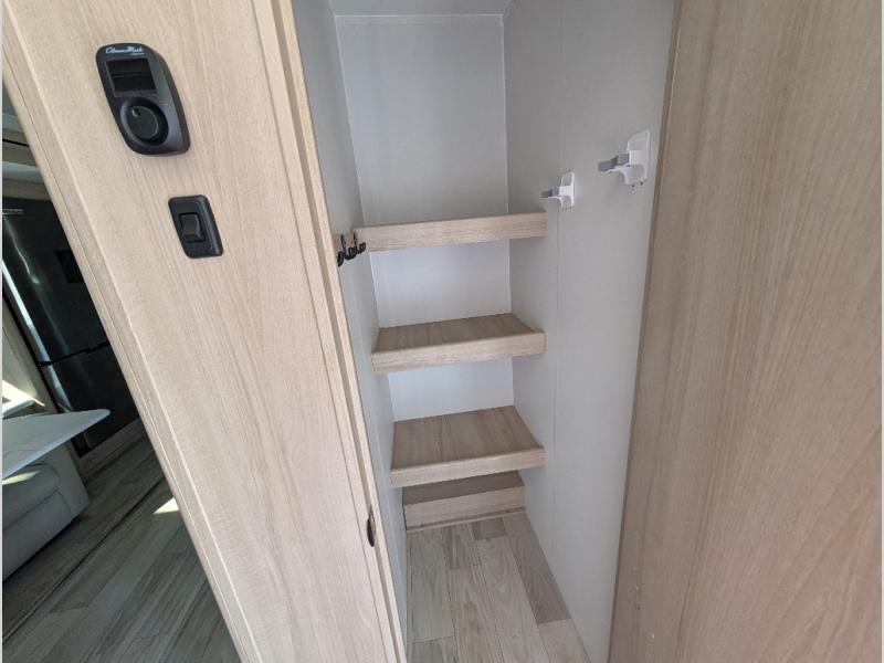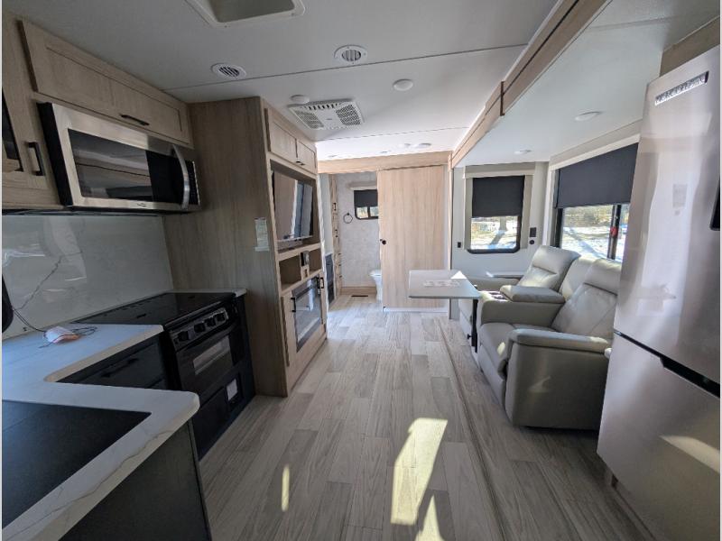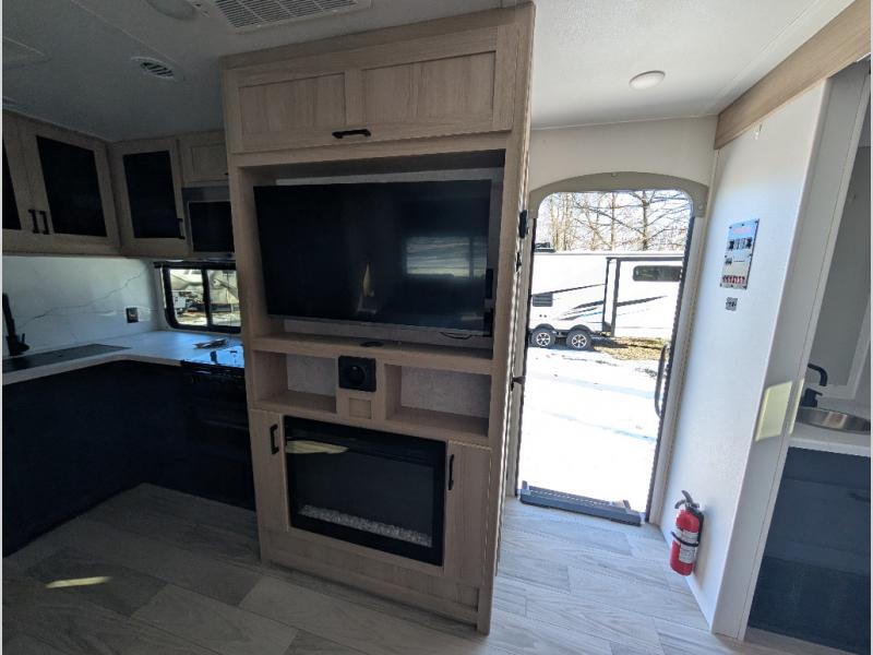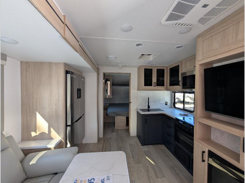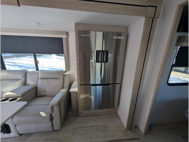This Voyage travel trailer will have you ready for hiking your favorite trails, lounging by the lake, or hanging out in your favorite campground. You will be able to do it all when you have these home-like comforts to return to. The front private bedroom provides you with a queen-size bed so that every night is relaxing and comfortable, or choose the king bed option if you like a bit more room, and the full rear bathroom has a large skylight above the shower and a large medicine cabinet with mirror for your morning routine. Sit back on the tri-fold sofa with sofa table and enjoy the view of the entertainment center opposite. You can also reach into the refrigerator right next to you to grab a little snack if you get hungry, and there is a larger walk-in pantry by the main entry door.
