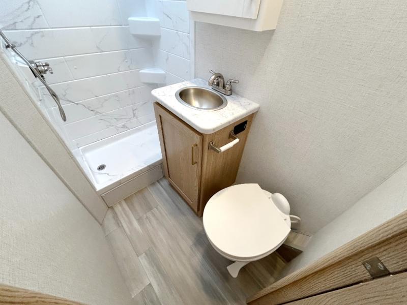 It won't be hard to find comfort in this coach for five! You can freshen up in the rear corner full bath once you've set up camp, then make lunch on the two burner gas cooktop or convection microwave with an air fryer. There is also a 12V refrigerator for cold items and a flip-up countertop for more space. Whether you dine at the Dream Dinette or take your plate outdoors under the 15' power awning, you're sure to have a great time in this motorhome. The rear corner full-size bed will provide a comfy place to rest your head at night, while your guests take the dinette and cab-over bunk!