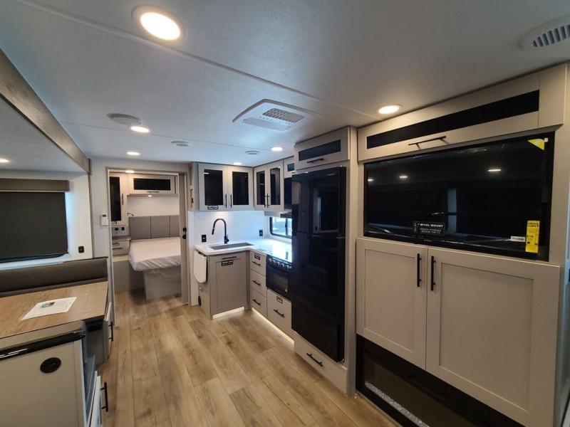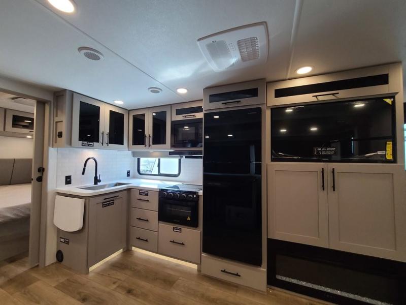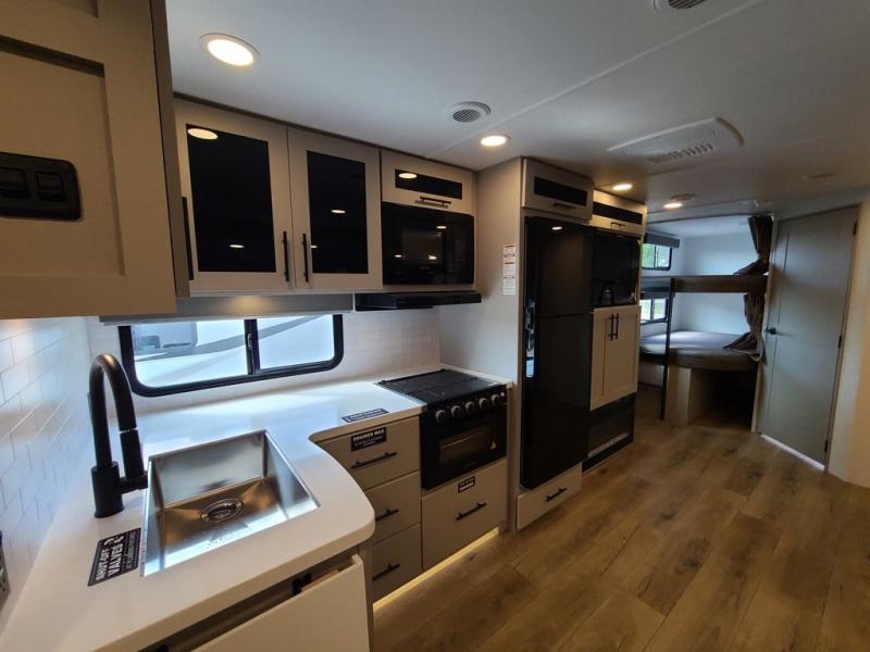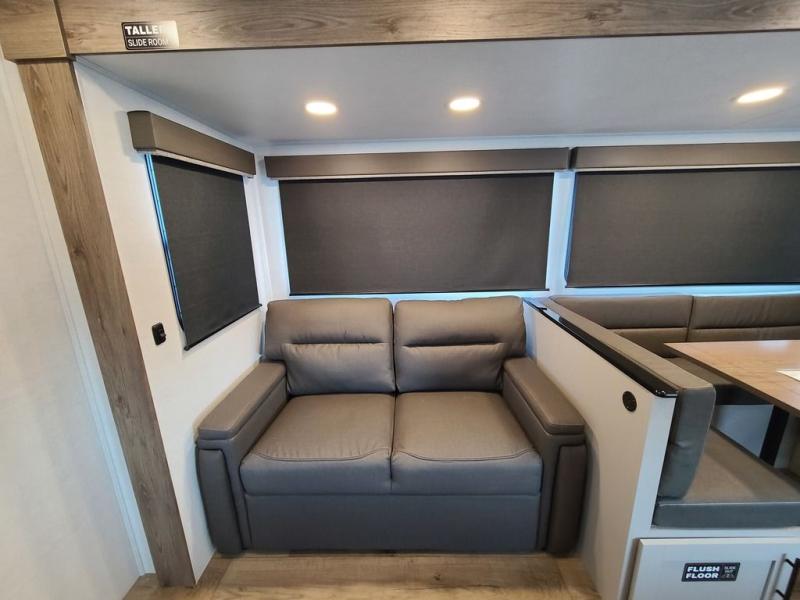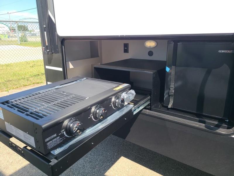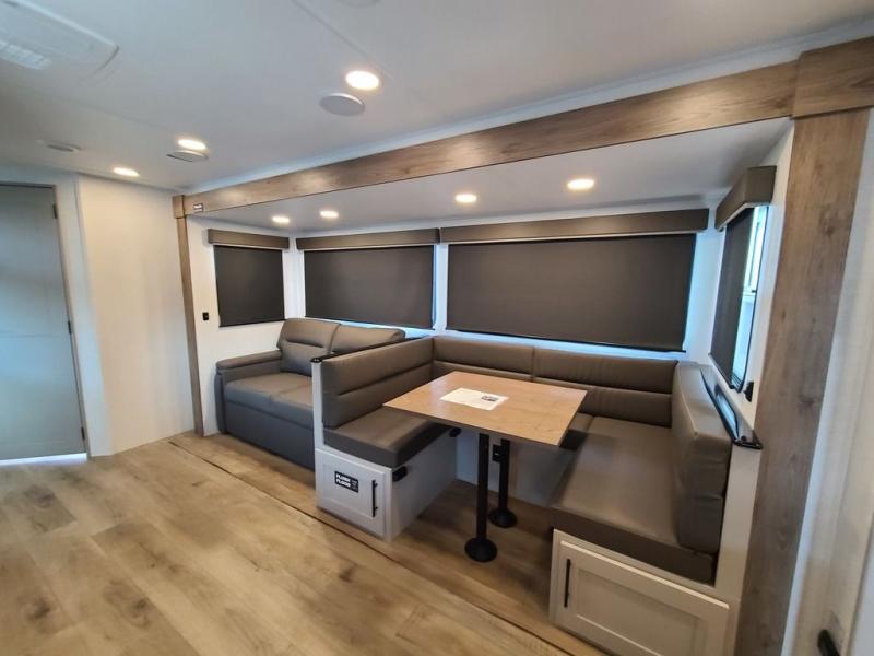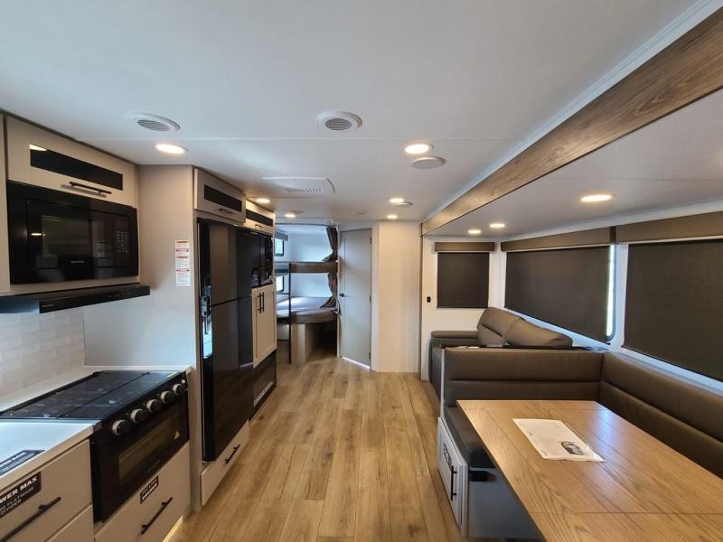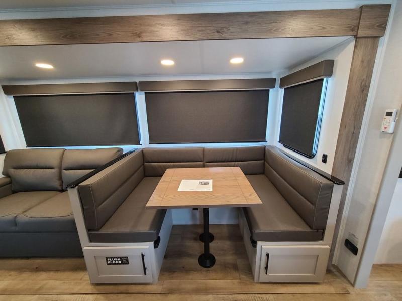 The perfect travel trailer for a larger family or one that enjoys traveling with friends! One large slide opens up the interior living space nice and features a U-shaped dinette and theater seating to provide plenty of seating for everyone. Enjoy the 40" HDTV opposite the seating for a movie indoors, and game night will be easy with everyone at the dinette which can also be converted for added sleeping if needed. The double entry doors will make loading and unloading simple, and allows you to easily slip in and out of the private bedroom for a morning walk. You can easily prepare all of your favorite meals and snacks with the kitchen amenities provided inside. A three burner range allows you to easily cook indoors, or you can enjoy cooking outside using the outdoor griddle/grill if you like. There is a 10 cu. ft. 12V refrigerator to keep all of your perishables and drinks nice and cold, plus a large sink for dishes and cleaning up, and there is also a flip-up counter extension for more prep space. You will also appreciate the rear corner bath featuring a 30" x 36" shower, vanity with sink, soft close porcelain toilet with foot flush, and linen cabinet for your towels.