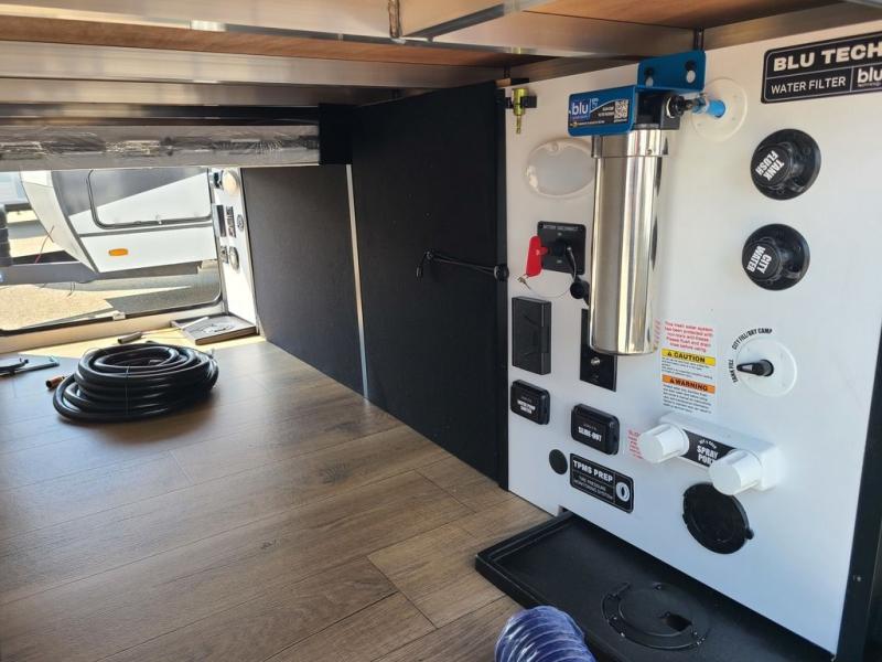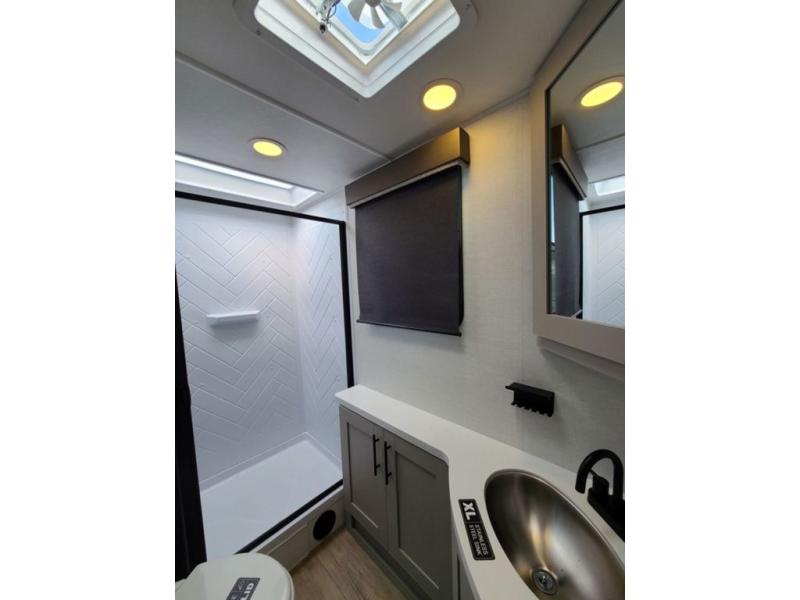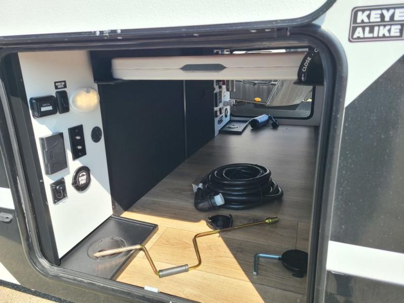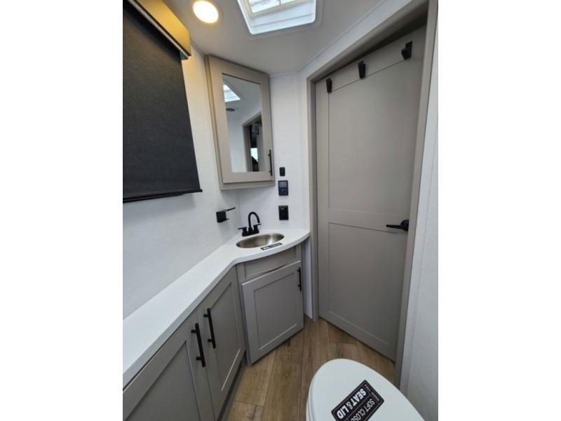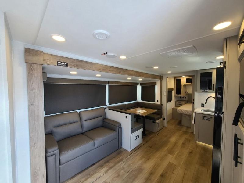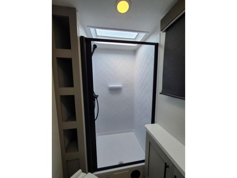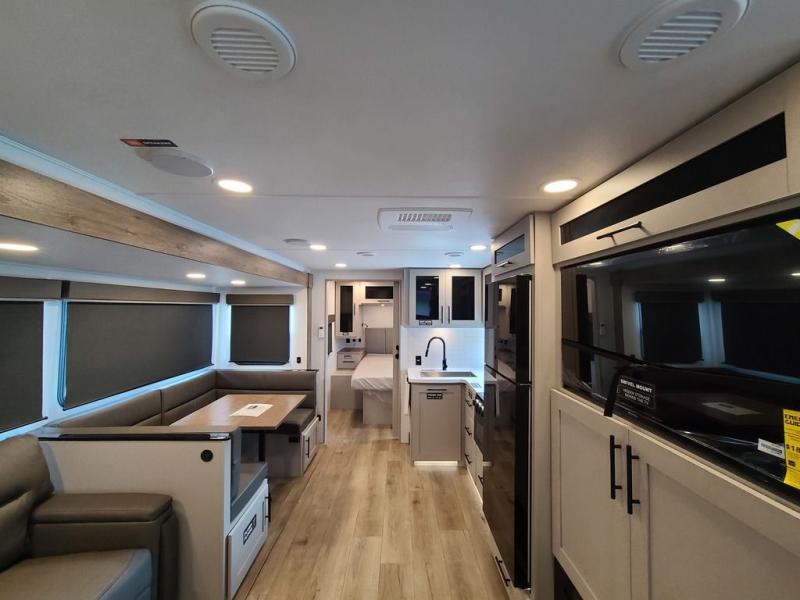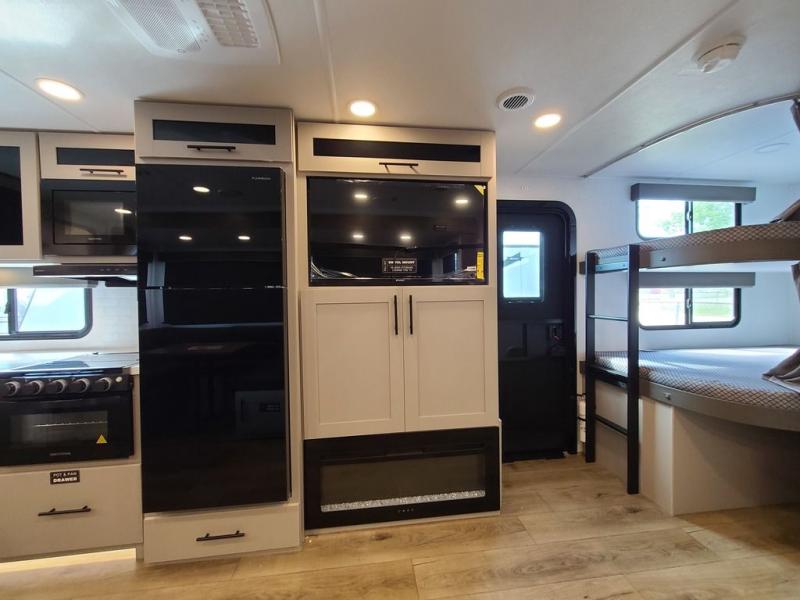 The perfect travel trailer for a larger family or one that enjoys traveling with friends! One large slide opens up the interior living space nice and features a U-shaped dinette and theater seating to provide plenty of seating for everyone. Enjoy the 40" HDTV opposite the seating for a movie indoors, and game night will be easy with everyone at the dinette which can also be converted for added sleeping if needed. The double entry doors will make loading and unloading simple, and allows you to easily slip in and out of the private bedroom for a morning walk. You can easily prepare all of your favorite meals and snacks with the kitchen amenities provided inside. A three burner range allows you to easily cook indoors, or you can enjoy cooking outside using the outdoor griddle/grill if you like. There is a 10 cu. ft. 12V refrigerator to keep all of your perishables and drinks nice and cold, plus a large sink for dishes and cleaning up, and there is also a flip-up counter extension for more prep space. You will also appreciate the rear corner bath featuring a 30" x 36" shower, vanity with sink, soft close porcelain toilet with foot flush, and linen cabinet for your towels.