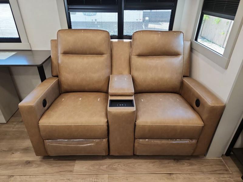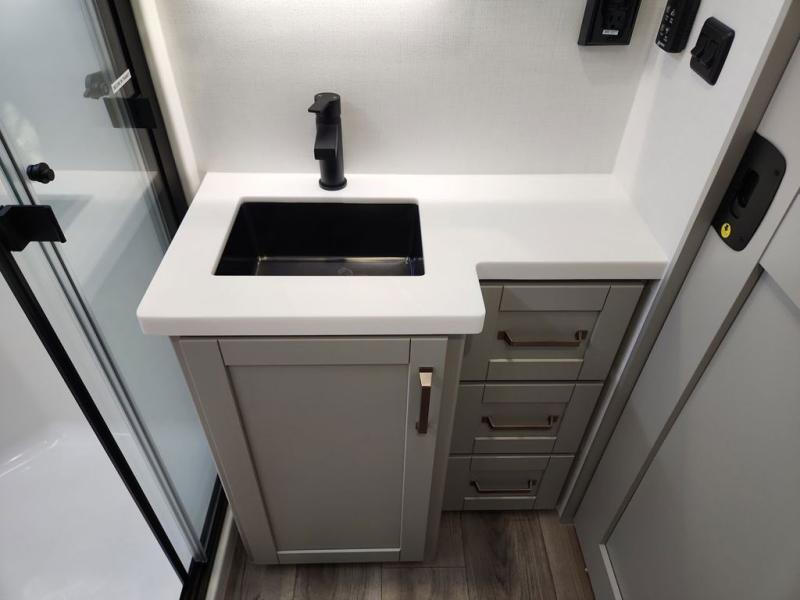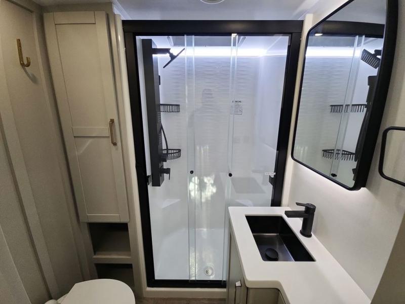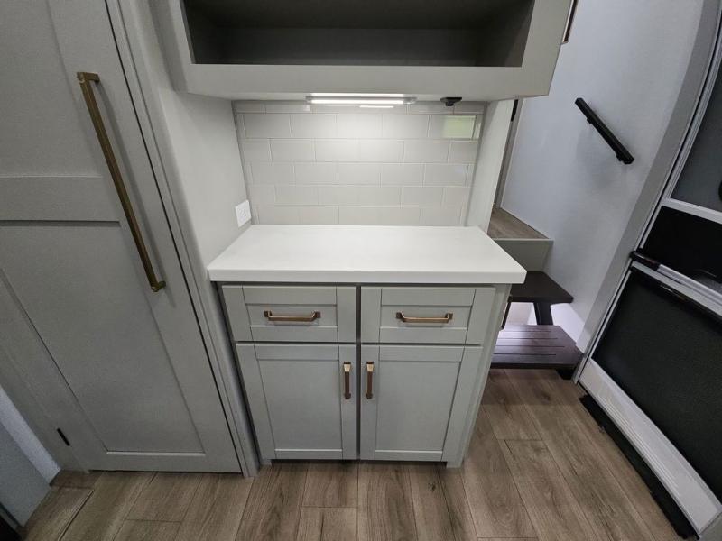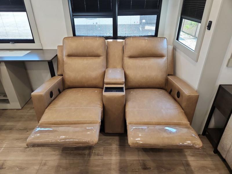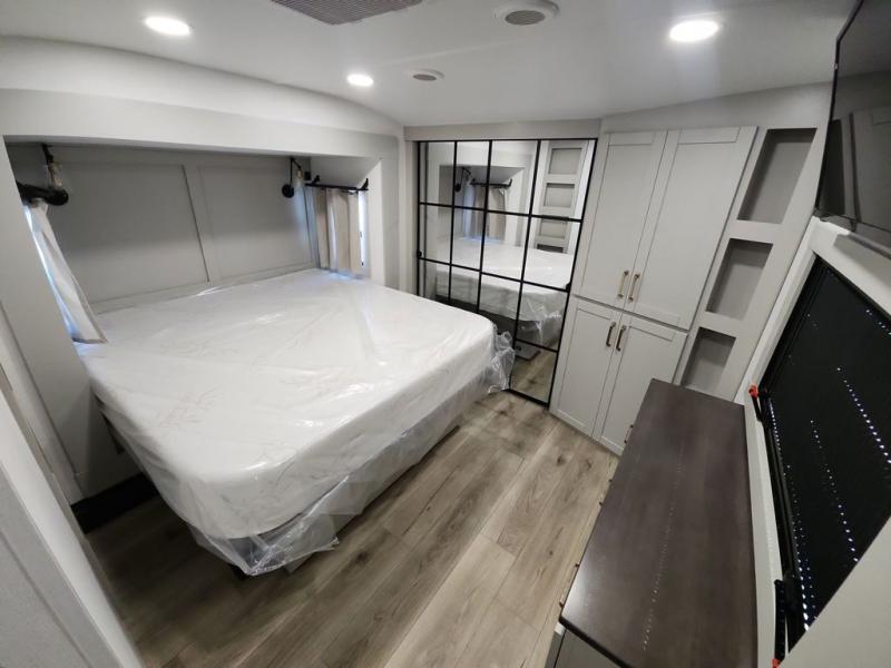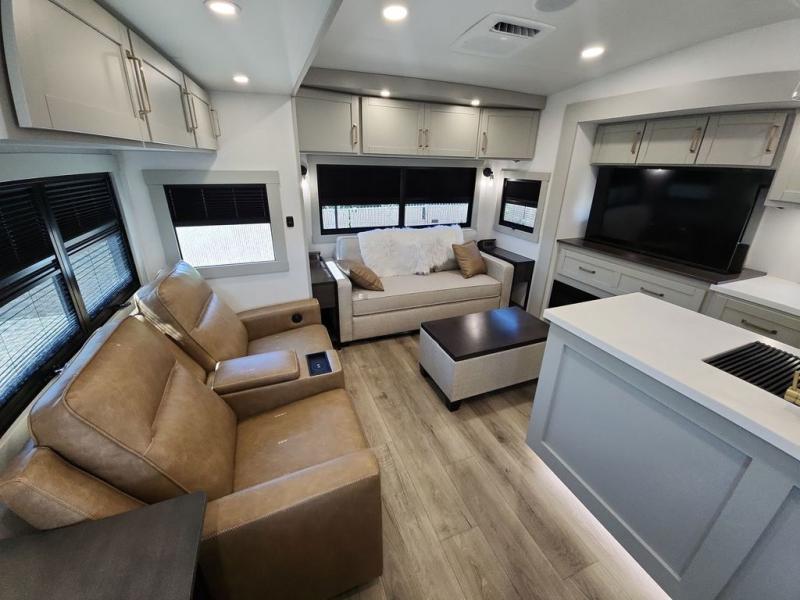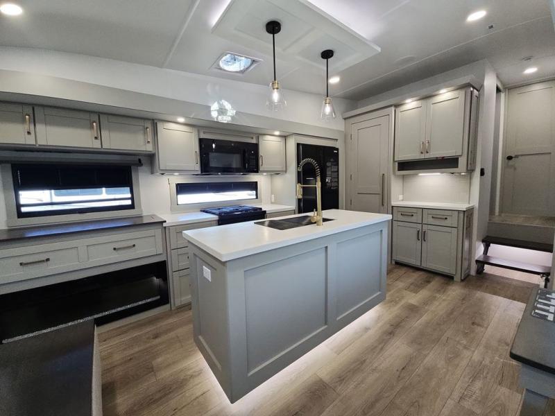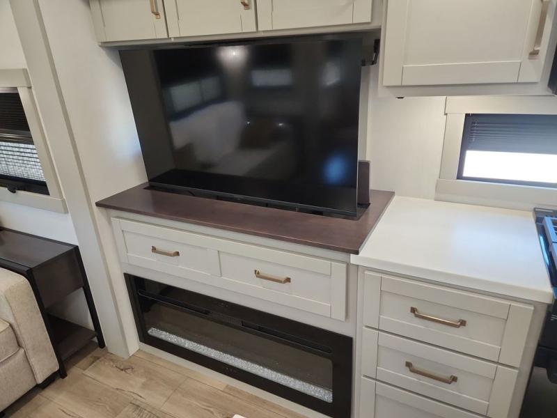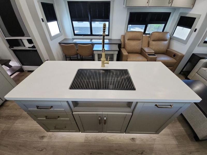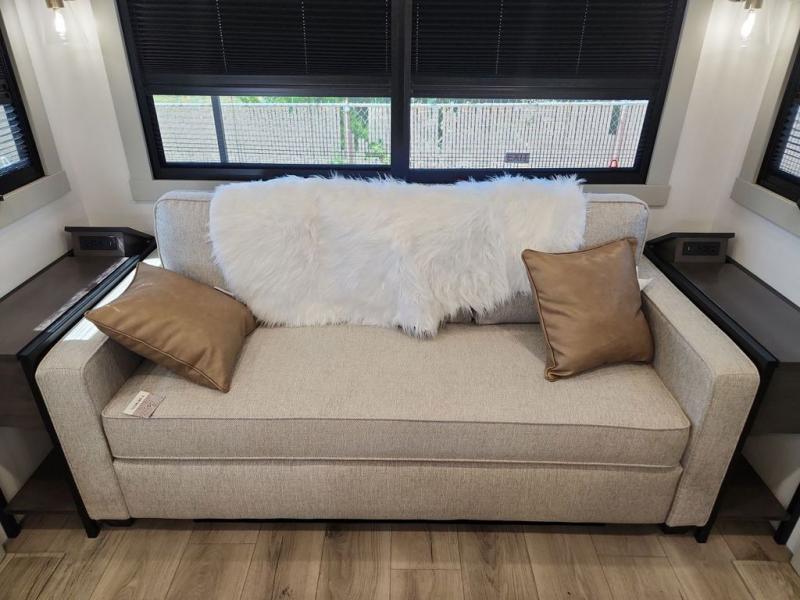 This Model Z luxury fifth wheel is bright and modern on the inside, with loads of amenities that will have you dreaming of your next trip! Enter and find a spacious combined living/kitchen space thanks to dual opposing slides. There is ample seating with a sliding desk/dining table, 62" theater seating, and a 72" tri-fold sofa along the rear wall. You can easily relax and enjoy the 50" Smart telescoping TV with a cozy fireplace below. The kitchen offers all that you need to prepare and cook meals just like home with a 16 cu. ft. refrigerator for your perishables, a 30" microwave oven, and three burner range top and oven. You will love the integrated spice rack, and the kitchen island all outfitted with dog bowls and double pull out trash bins with an integrated Stow 'N Go paper towel holder. There is also an 84" pantry with adjustable shelves for all of your canned and dry goods. Head up the steps to a private master suite with king bed slide. You can opt for the queen bed if you like. A sliding dresser top features hidden storage which is perfect for jewelry and other personal belongings. The front wardrobe features mirrored doors and the corner closet has been prepped for a stackable washer and dryer if you choose to add that option. Relax and enjoy a large bath featuring a linen cabinet, a 30" x 42" shower, and vanity with sink, plus medicine cabinet.