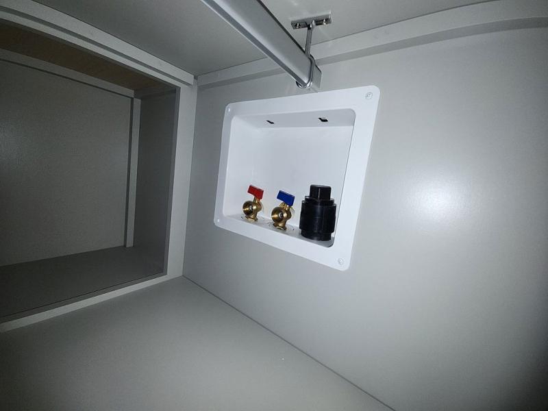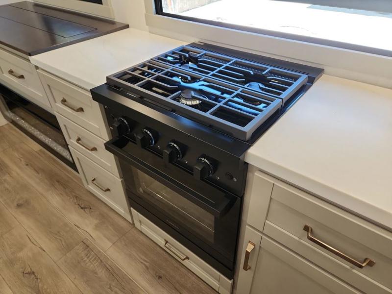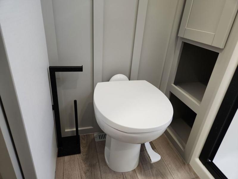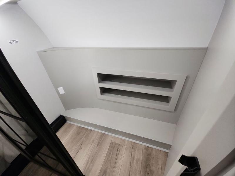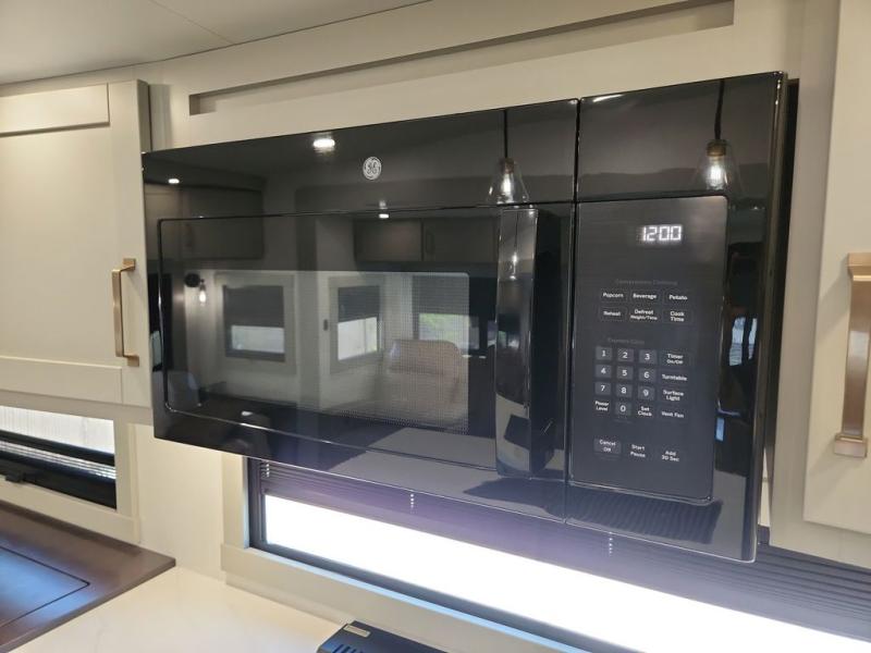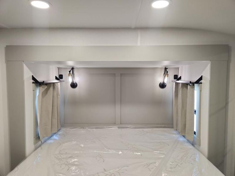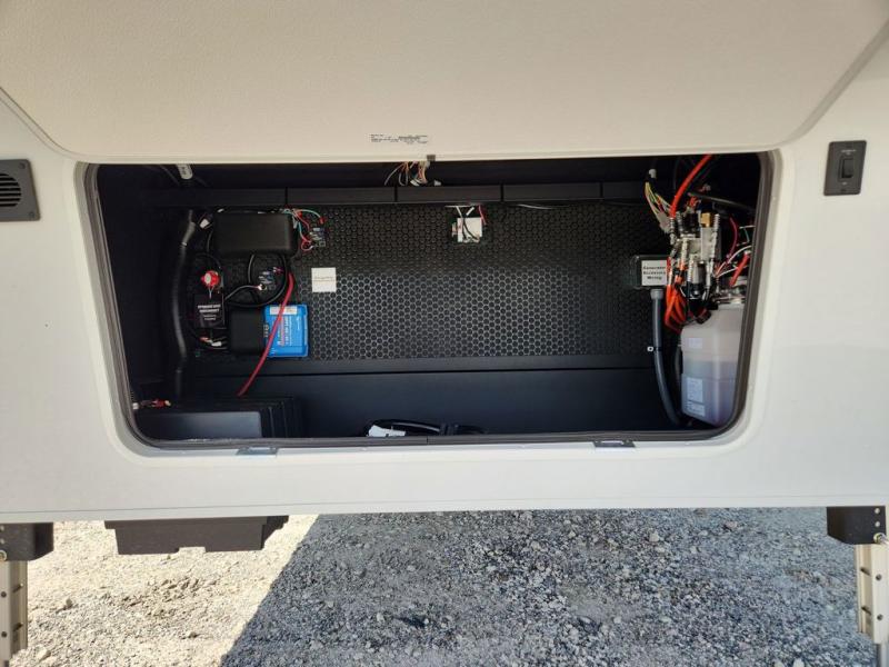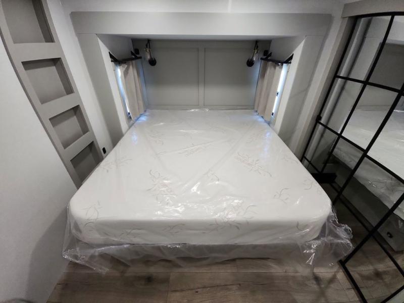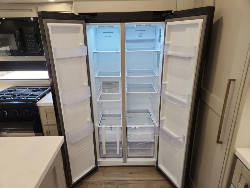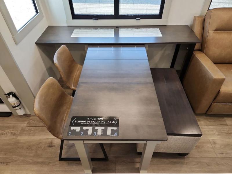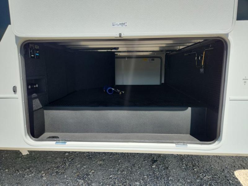 This Model Z luxury fifth wheel is bright and modern on the inside, with loads of amenities that will have you dreaming of your next trip! Enter and find a spacious combined living/kitchen space thanks to dual opposing slides. There is ample seating with a sliding desk/dining table, 62" theater seating, and a 72" tri-fold sofa along the rear wall. You can easily relax and enjoy the 50" Smart telescoping TV with a cozy fireplace below. The kitchen offers all that you need to prepare and cook meals just like home with a 16 cu. ft. refrigerator for your perishables, a 30" microwave oven, and three burner range top and oven. You will love the integrated spice rack, and the kitchen island all outfitted with dog bowls and double pull out trash bins with an integrated Stow 'N Go paper towel holder. There is also an 84" pantry with adjustable shelves for all of your canned and dry goods. Head up the steps to a private master suite with king bed slide. You can opt for the queen bed if you like. A sliding dresser top features hidden storage which is perfect for jewelry and other personal belongings. The front wardrobe features mirrored doors and the corner closet has been prepped for a stackable washer and dryer if you choose to add that option. Relax and enjoy a large bath featuring a linen cabinet, a 30" x 42" shower, and vanity with sink, plus medicine cabinet.