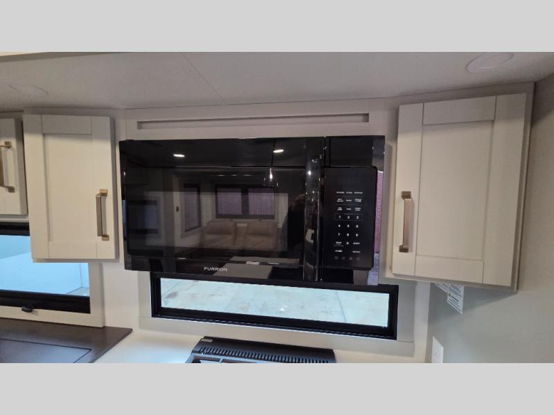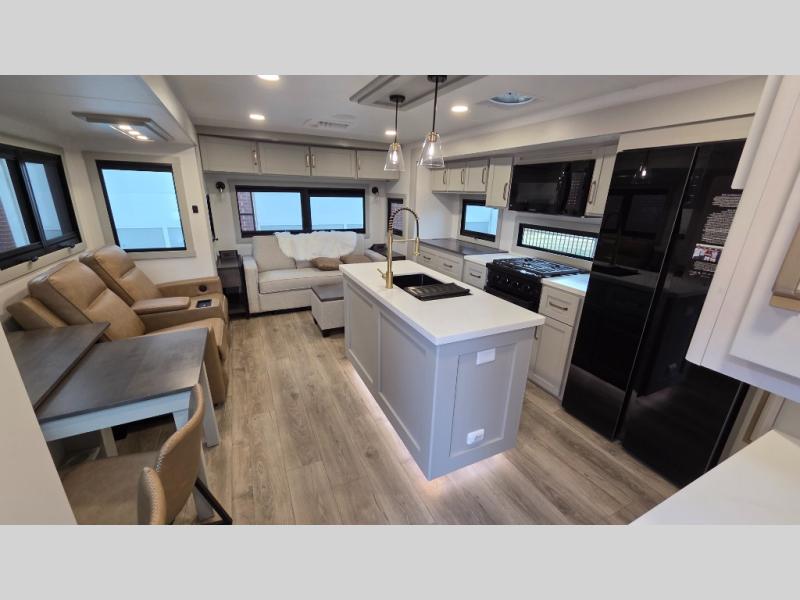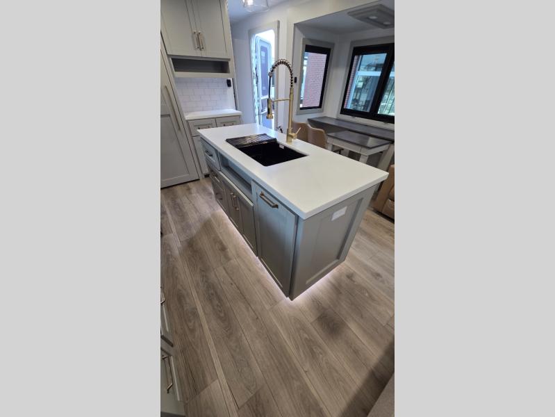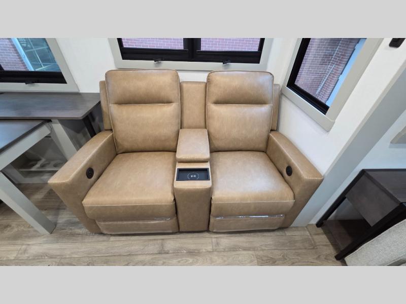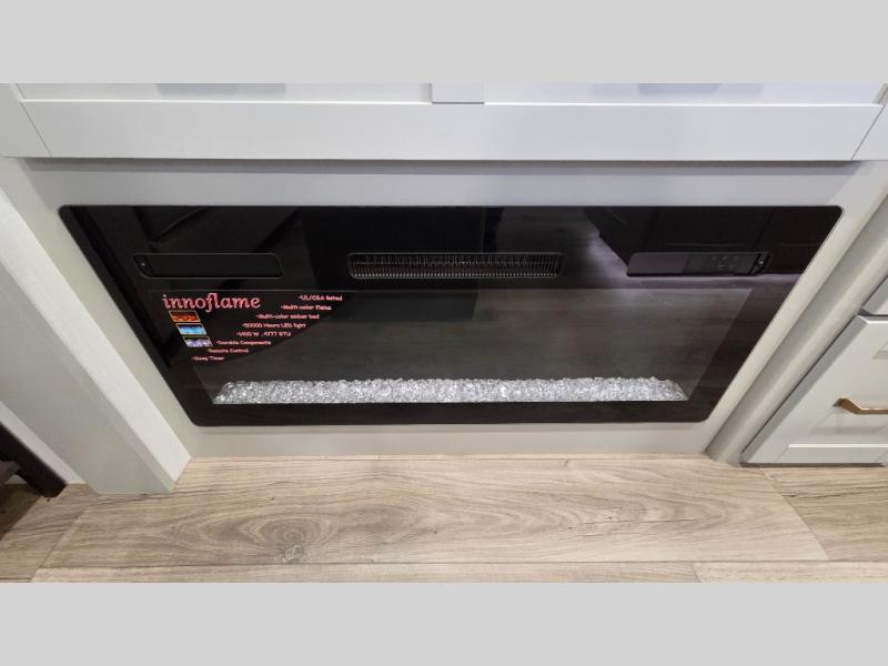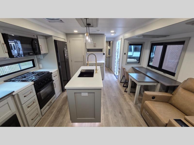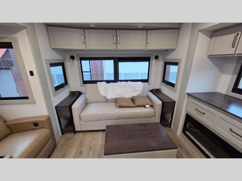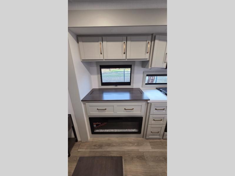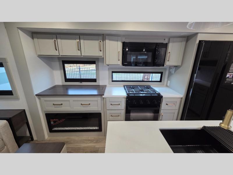 You will love all the space and features in this travel trailer! A luxurious rear living room offers plenty of room to spread out, with a 72" tri-fold sofa plus theater seats, all arranged with a perfect view of the 42" TV over the fireplace. A central kitchen area includes an island with hidden pet bowls. Find even more storage with the hutch plus pantry with adjustable shelves. The front bedroom comes with a queen bed, but if you'd like you can upgrade to a king for even more room. No matter which you choose, you will enjoy watching the 32" bedroom TV. The full-width wardrobe has room for all of your clothes and also includes prep for an optional washer and dryer. And the full bath includes a 30" x 42" one-piece fiberglass shower. Outside you'll enjoy two awnings, pass-through storage, and LED ground lighting.