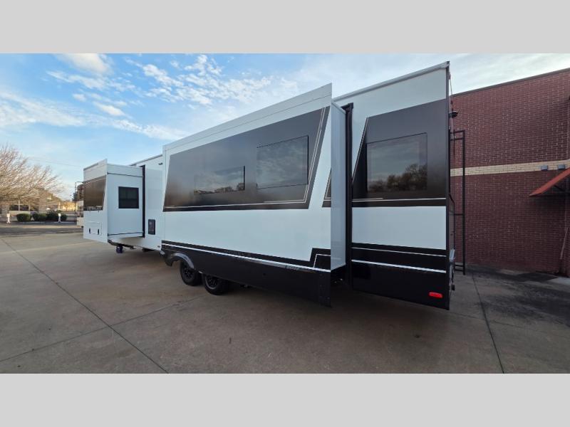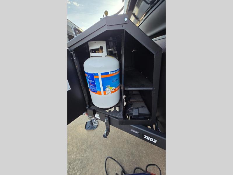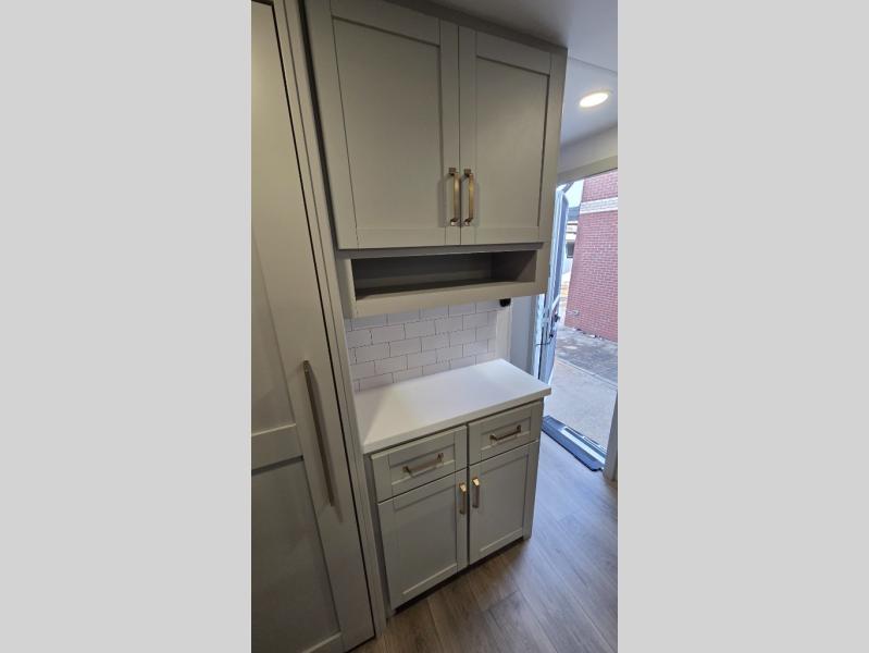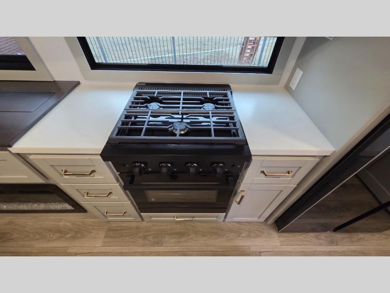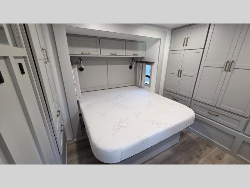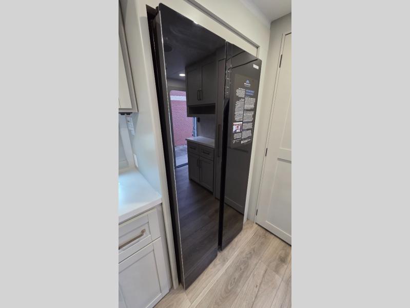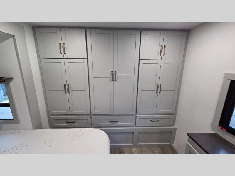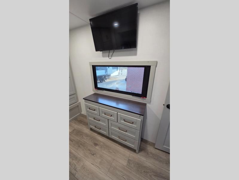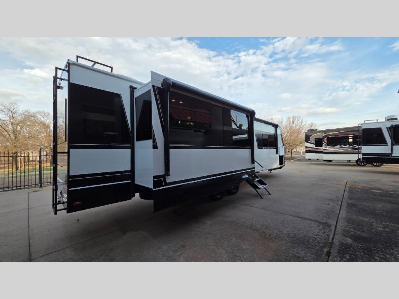 You will love all the space and features in this travel trailer! A luxurious rear living room offers plenty of room to spread out, with a 72" tri-fold sofa plus theater seats, all arranged with a perfect view of the 42" TV over the fireplace. A central kitchen area includes an island with hidden pet bowls. Find even more storage with the hutch plus pantry with adjustable shelves. The front bedroom comes with a queen bed, but if you'd like you can upgrade to a king for even more room. No matter which you choose, you will enjoy watching the 32" bedroom TV. The full-width wardrobe has room for all of your clothes and also includes prep for an optional washer and dryer. And the full bath includes a 30" x 42" one-piece fiberglass shower. Outside you'll enjoy two awnings, pass-through storage, and LED ground lighting.