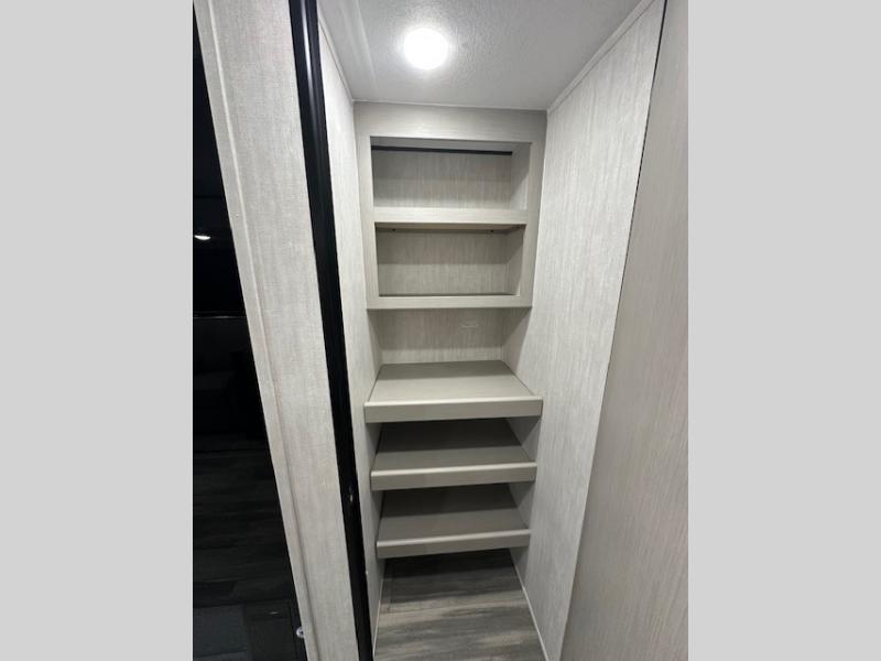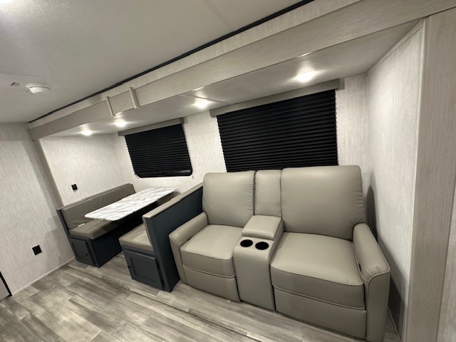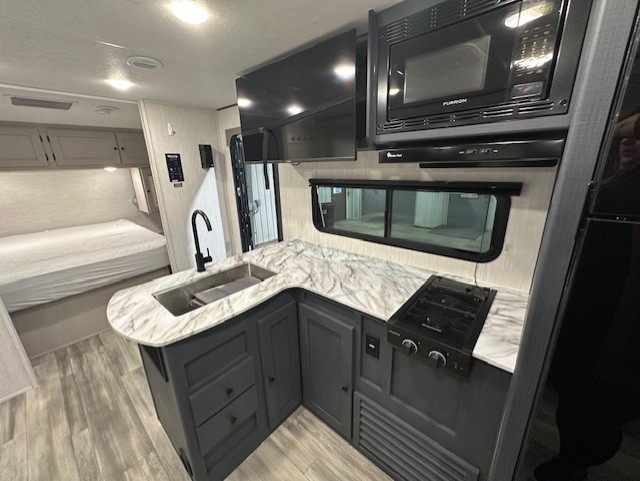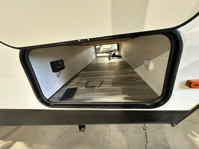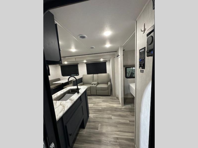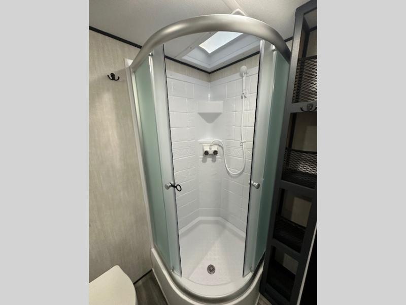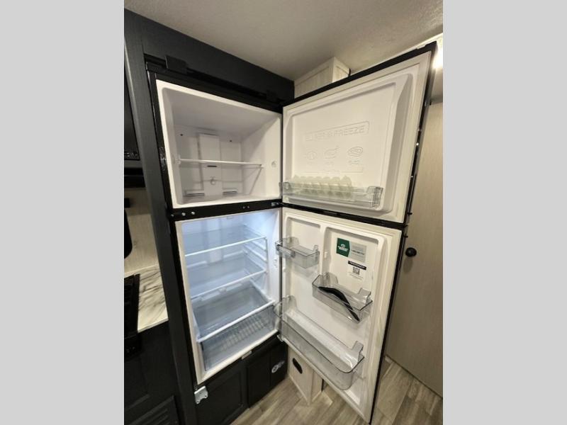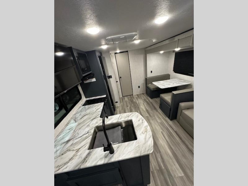 Answer the call of the wild with this travel trailer in tow! You will love having your own bedroom up front that includes a queen bed with storage below plus an overhead cabinet for books and more. A large slide out in the combined kitchen and living area houses the sofa and booth dinette, and these pieces of furniture can double as sleeping space for guests as well. The chef of your group will appreciate the L-shaped kitchen counter with a large sink, a microwave and range plus a refrigerator and pantry for food storage. And the full rear bath will let you freshen up each day. There is a counter with a sink, toilet, and a radius shower/tub!