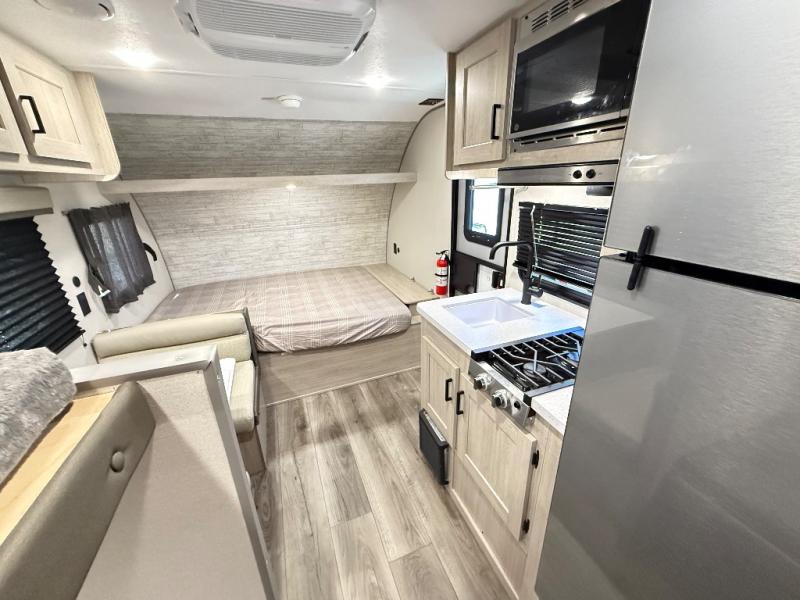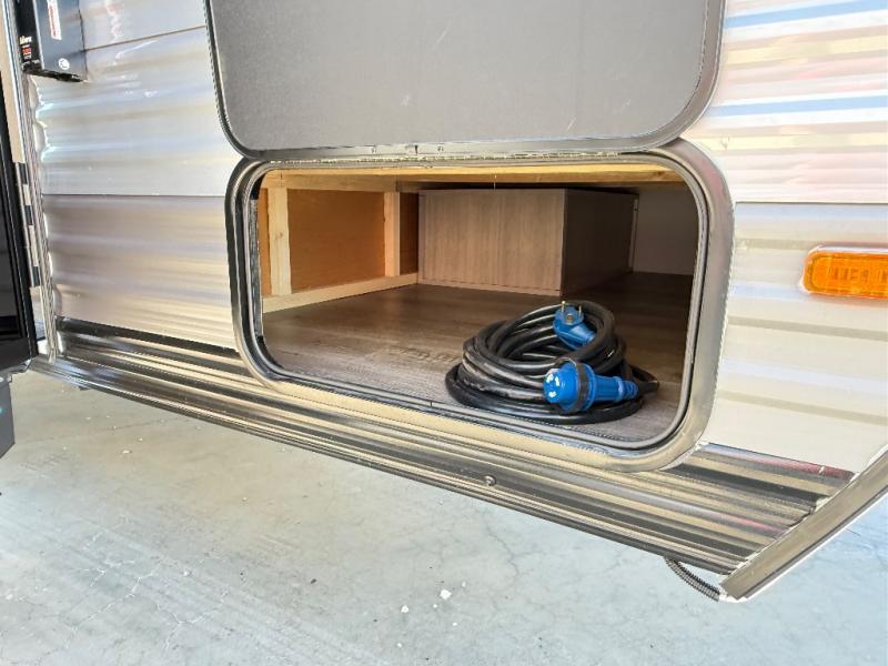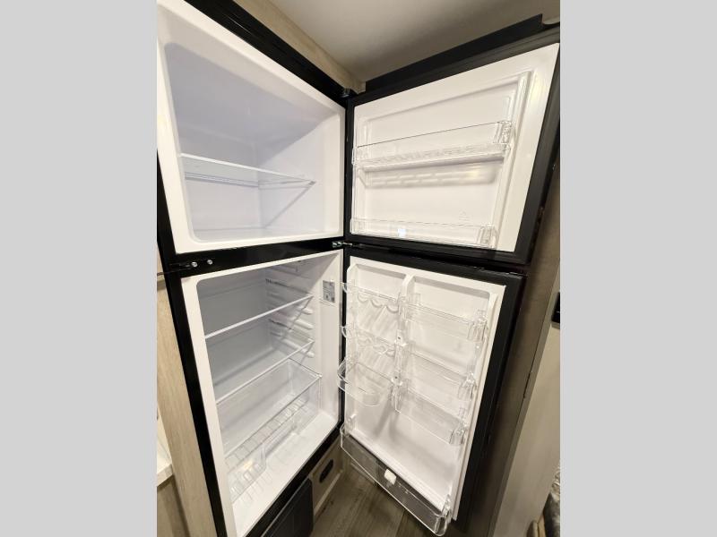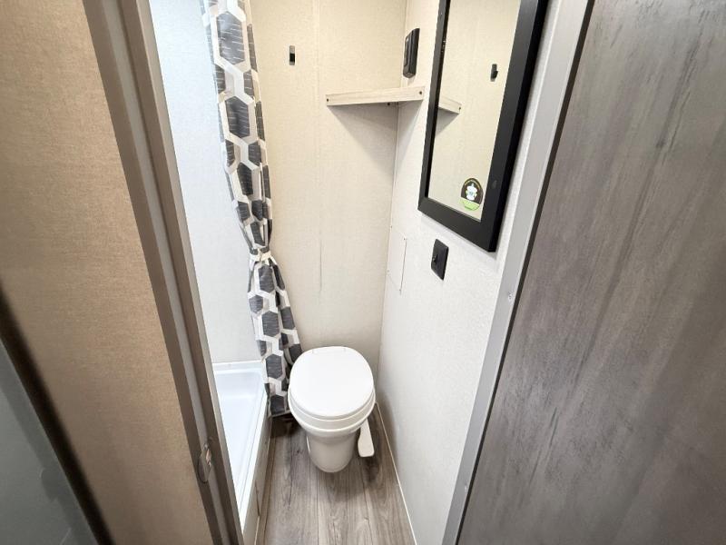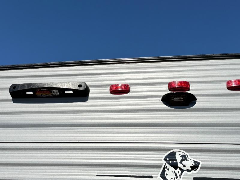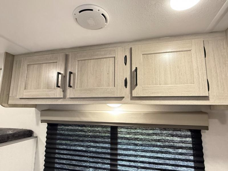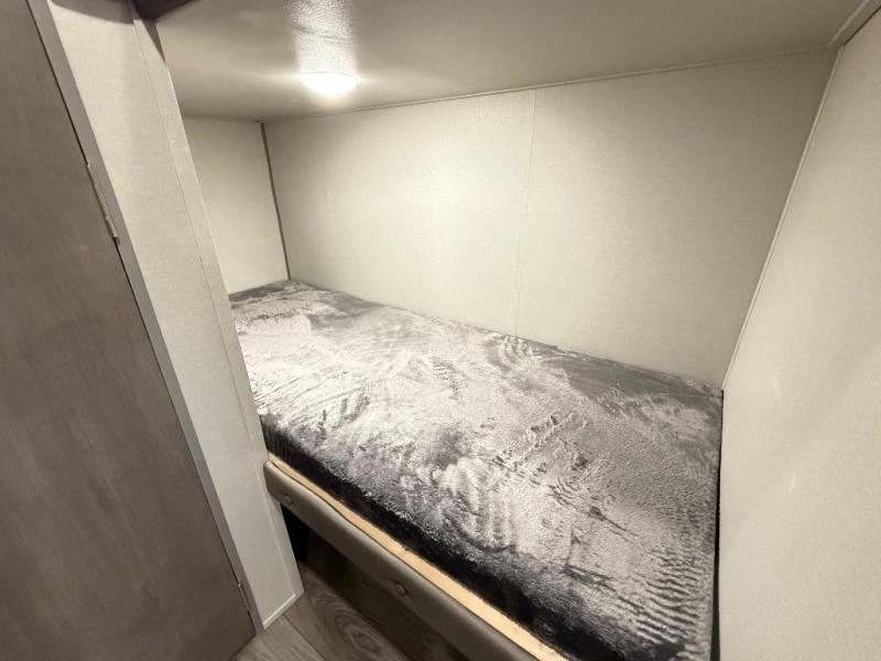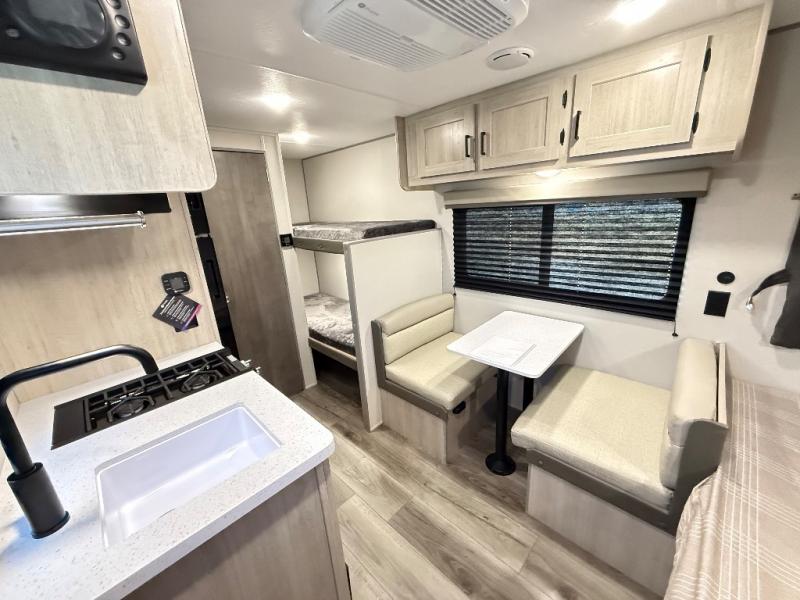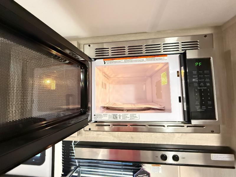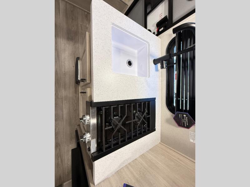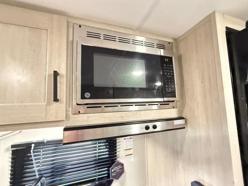This travel trailers is perfect for a young family or smaller group. You can easily sleep four or more with the rear set of bunk beds and queen bed up front. There is also a booth dinette for inside down-time, as well as complete kitchen and bath amenities so you can cook and stay clean while traveling. The rear corner bath features a toilet and 36" x 30" shower, and it's conveniently located next to the bunk beds which is great for little ones at night. Cooking inside will be easy with a GE stainless two-burner cooktop and single sink, plus there is also a GE microwave oven for snacks and things that you can easily warm up. If you plan to spend most of your time outdoors, you will find plenty of storage space in the front exterior storage compartment, and there is also plenty of storage inside as well.