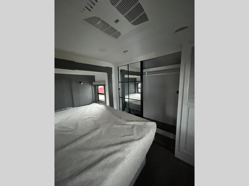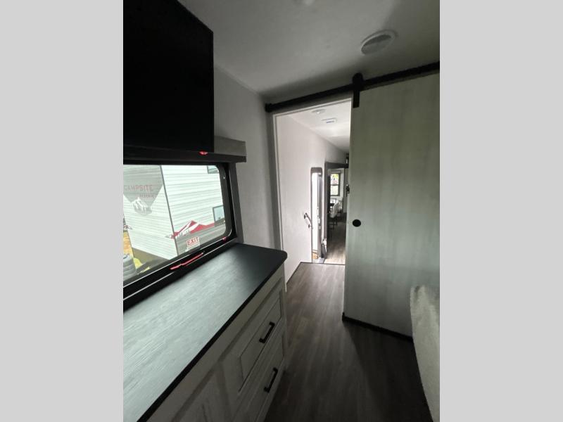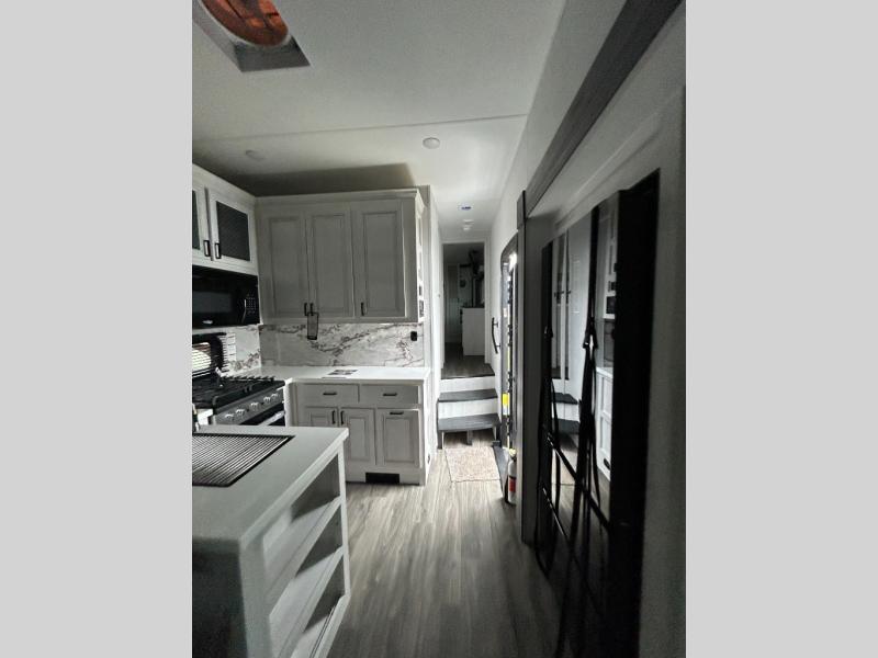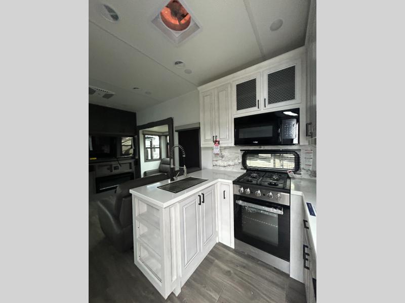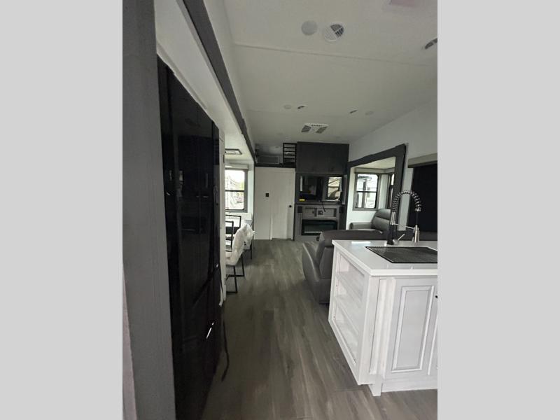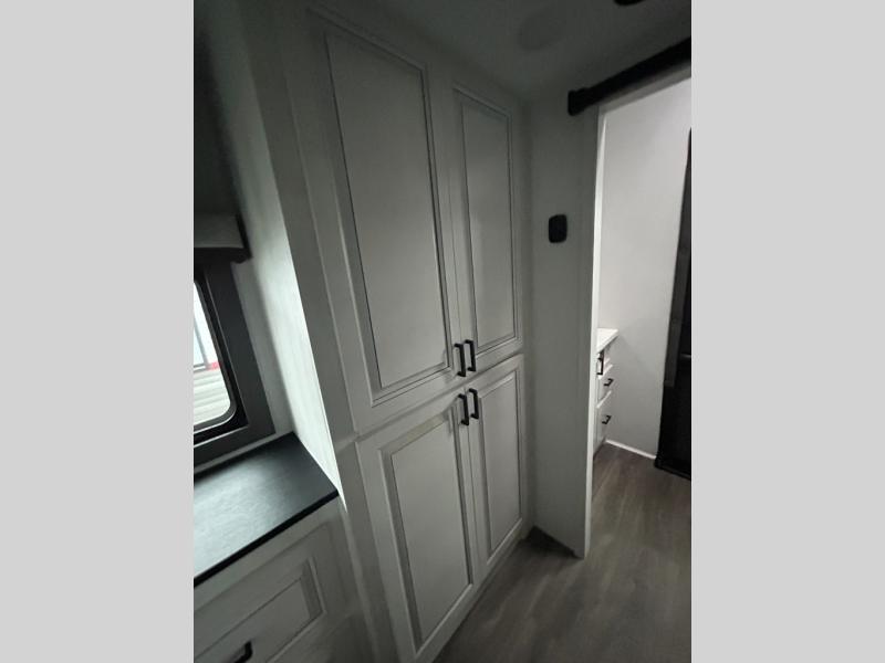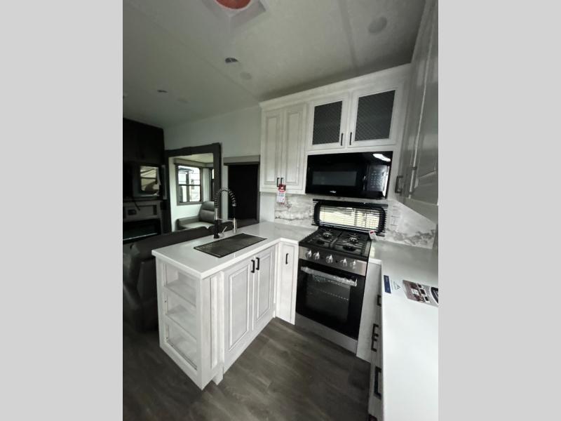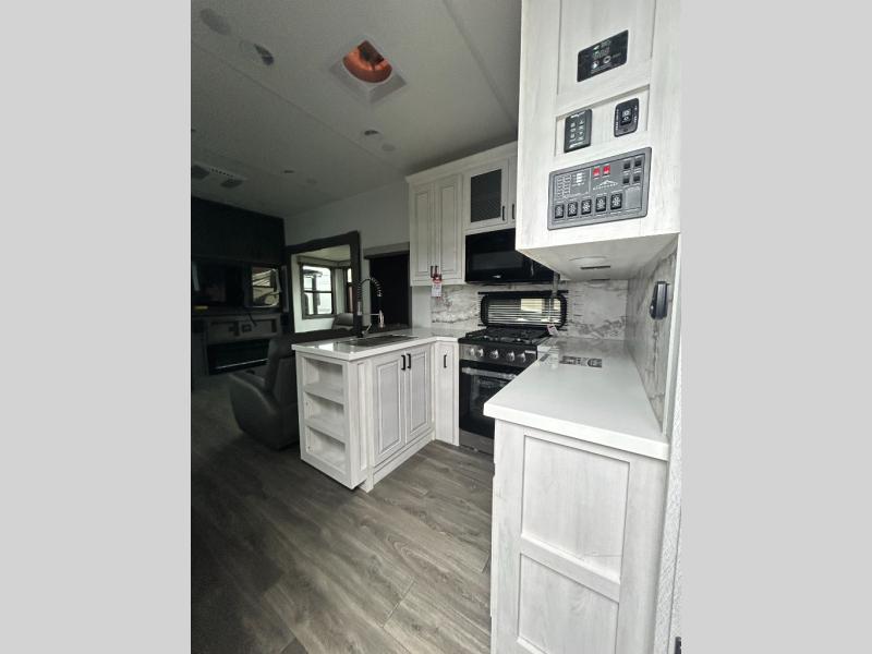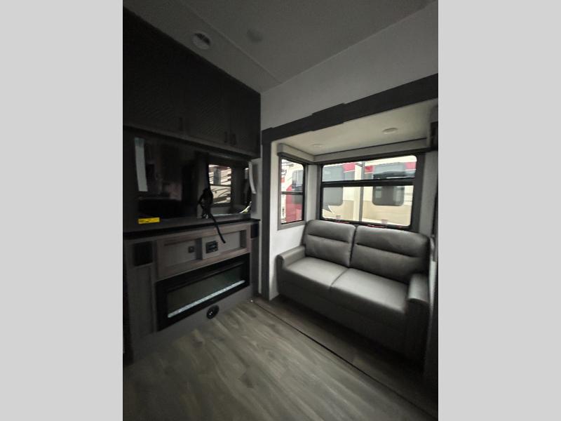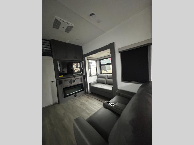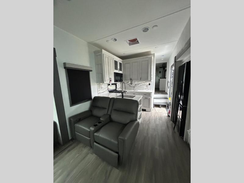 If you enjoy camping with a larger group of family or friends, this dual entry fifth wheel is for you! There is a front bedroom with a king bed slide and storage, plus a second bedroom in the back, complete with a full rear bath, a queen bed slide and storage space. A loft with a ladder is above the rear bedroom, which includes two bunk mats, loft cabinets, and TV prep if the little ones want to watch movies at night. Head to the middle of the unit to enjoy cooking on the four burner range and utilizing the generous counter space in the kitchen. There is also a walk-in pantry with a coffee bar and shelves, plus a 16 cu. ft. 12V refrigerator for food storage. Theater seating in the living room is in direct view of the TV and fireplace, and there is a tri-fold sofa slide out here as well for even more seating and sleeping space!
