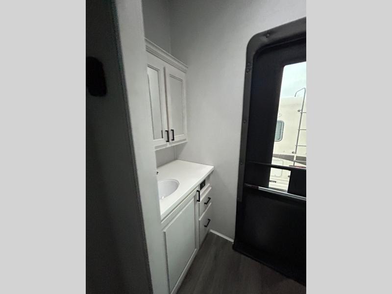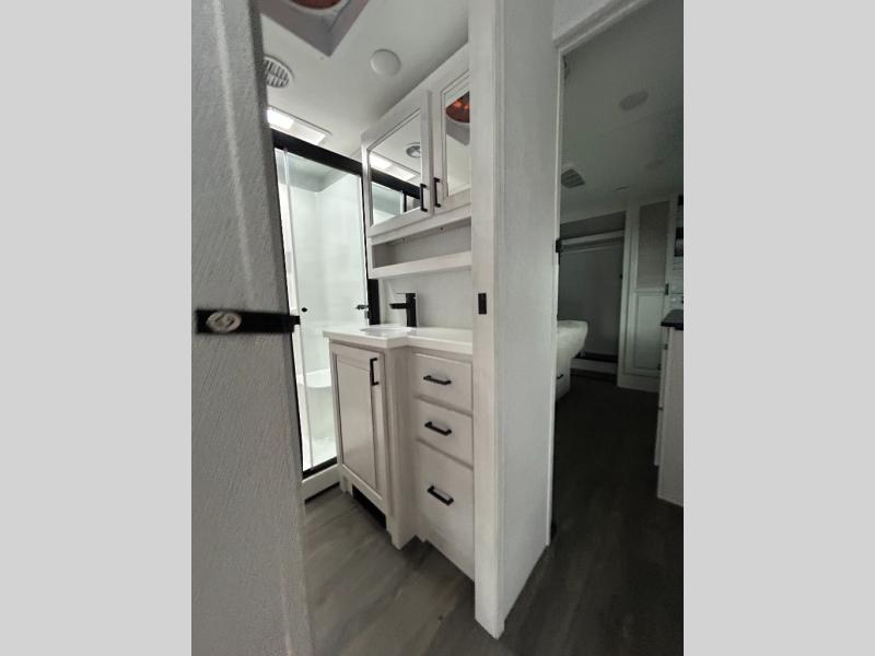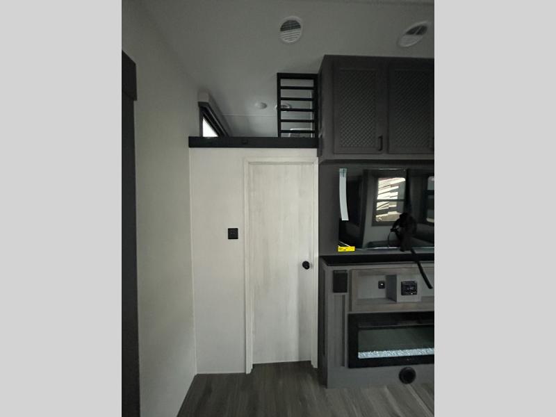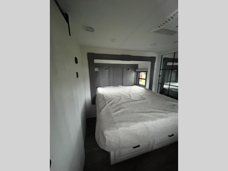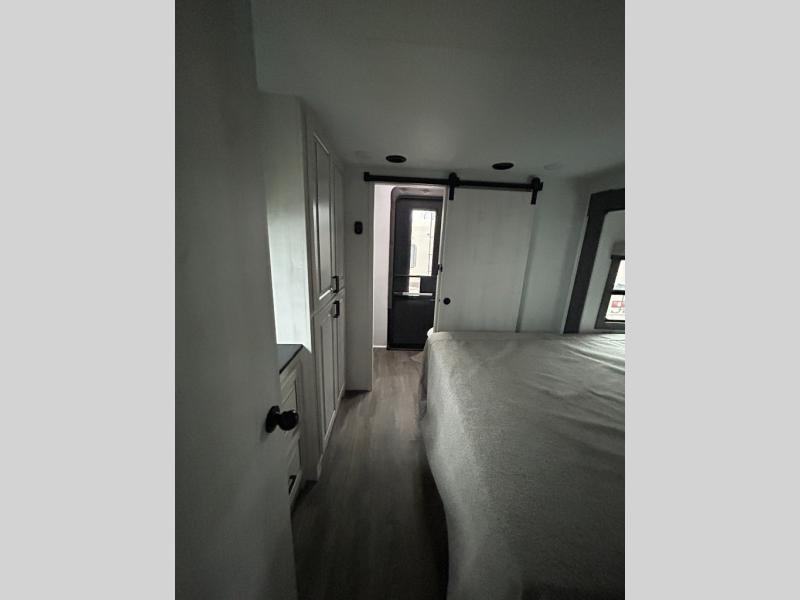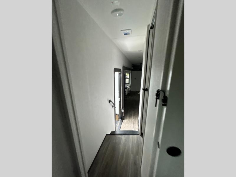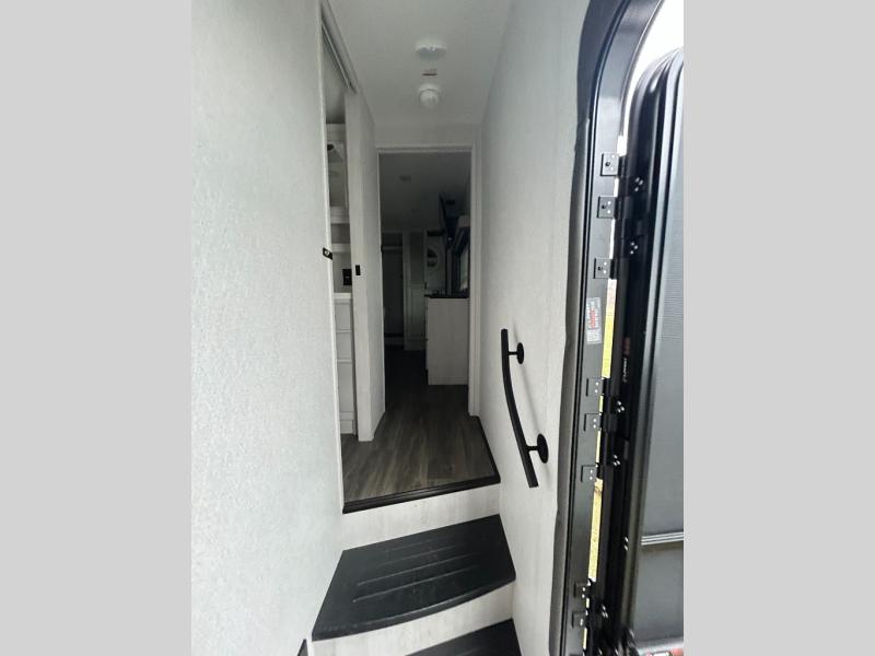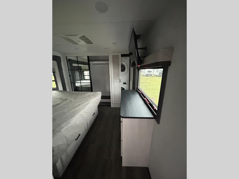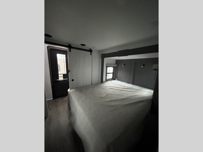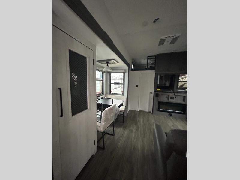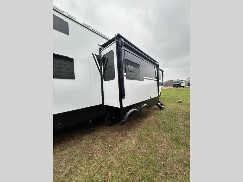 If you enjoy camping with a larger group of family or friends, this dual entry fifth wheel is for you! There is a front bedroom with a king bed slide and storage, plus a second bedroom in the back, complete with a full rear bath, a queen bed slide and storage space. A loft with a ladder is above the rear bedroom, which includes two bunk mats, loft cabinets, and TV prep if the little ones want to watch movies at night. Head to the middle of the unit to enjoy cooking on the four burner range and utilizing the generous counter space in the kitchen. There is also a walk-in pantry with a coffee bar and shelves, plus a 16 cu. ft. 12V refrigerator for food storage. Theater seating in the living room is in direct view of the TV and fireplace, and there is a tri-fold sofa slide out here as well for even more seating and sleeping space!