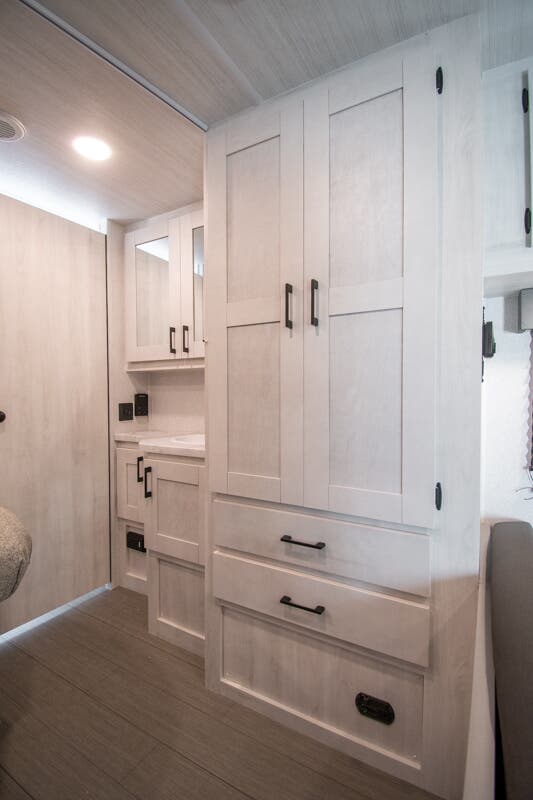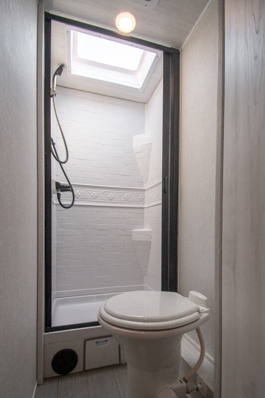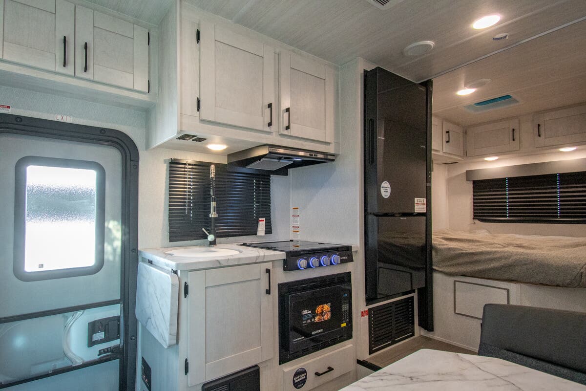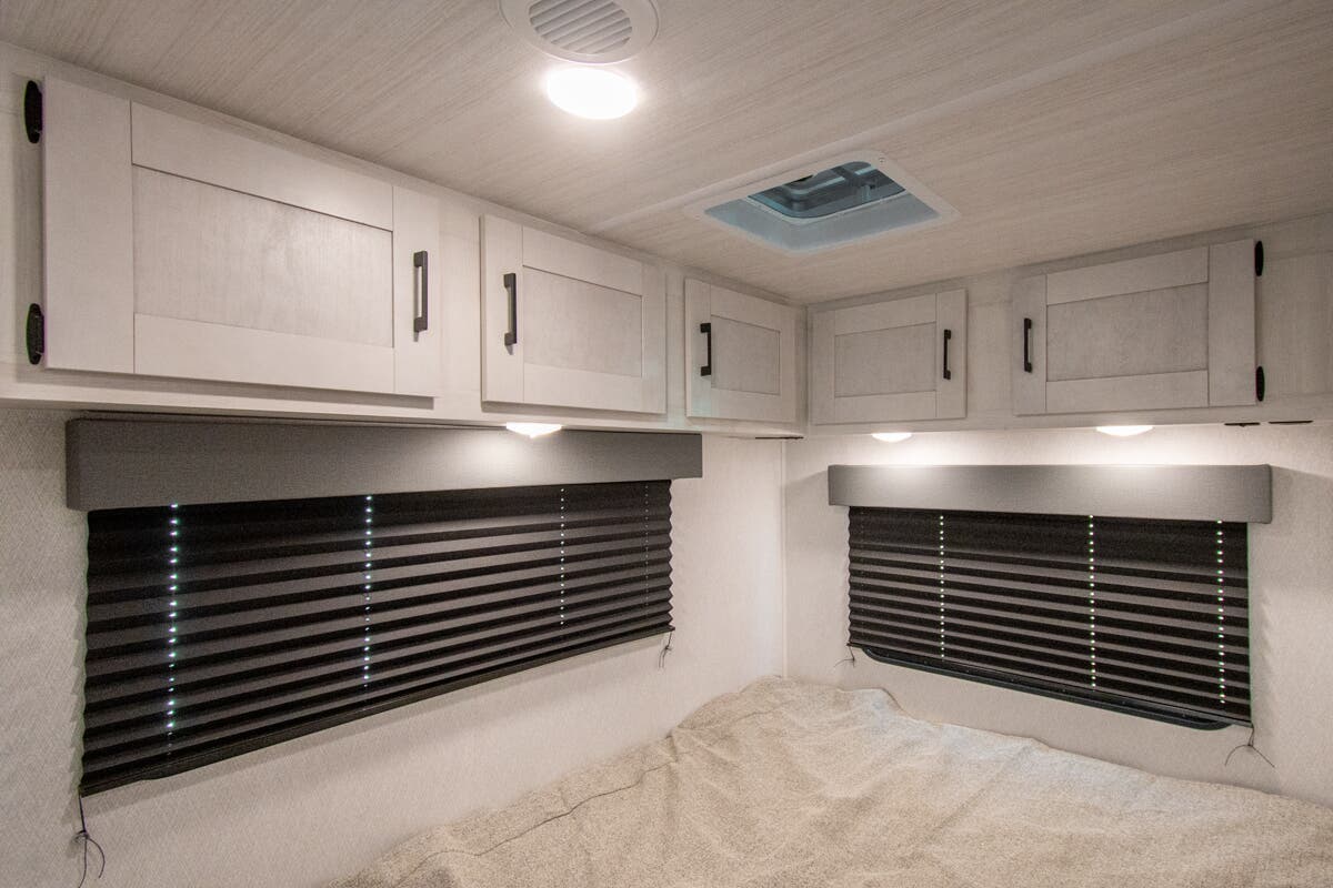 You're going to love traveling and camping in this coach that can sleep five to six each night. The convection microwave and 10.7 cu. ft. 12V refrigerator will let you cook and store food, and the booth dinette provides a place to dine together. A private bath includes a shower and toilet, with the sink just outside this room so two people can freshen up at once. You will sleep soundly each night on the rear corner queen bed with overhead storage for your belongings, while the little ones take the 60" x 80" bunk over cab!